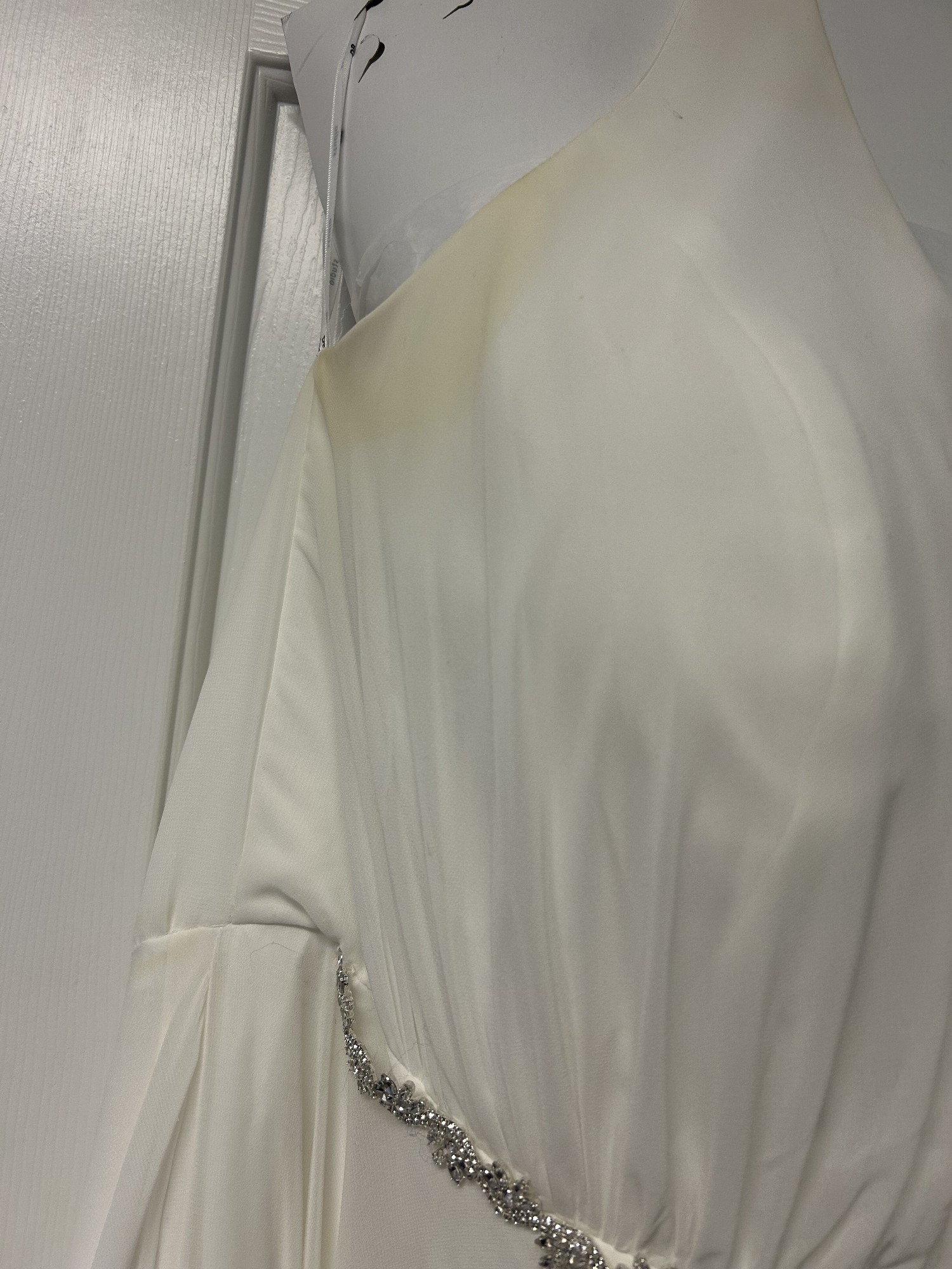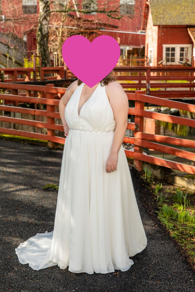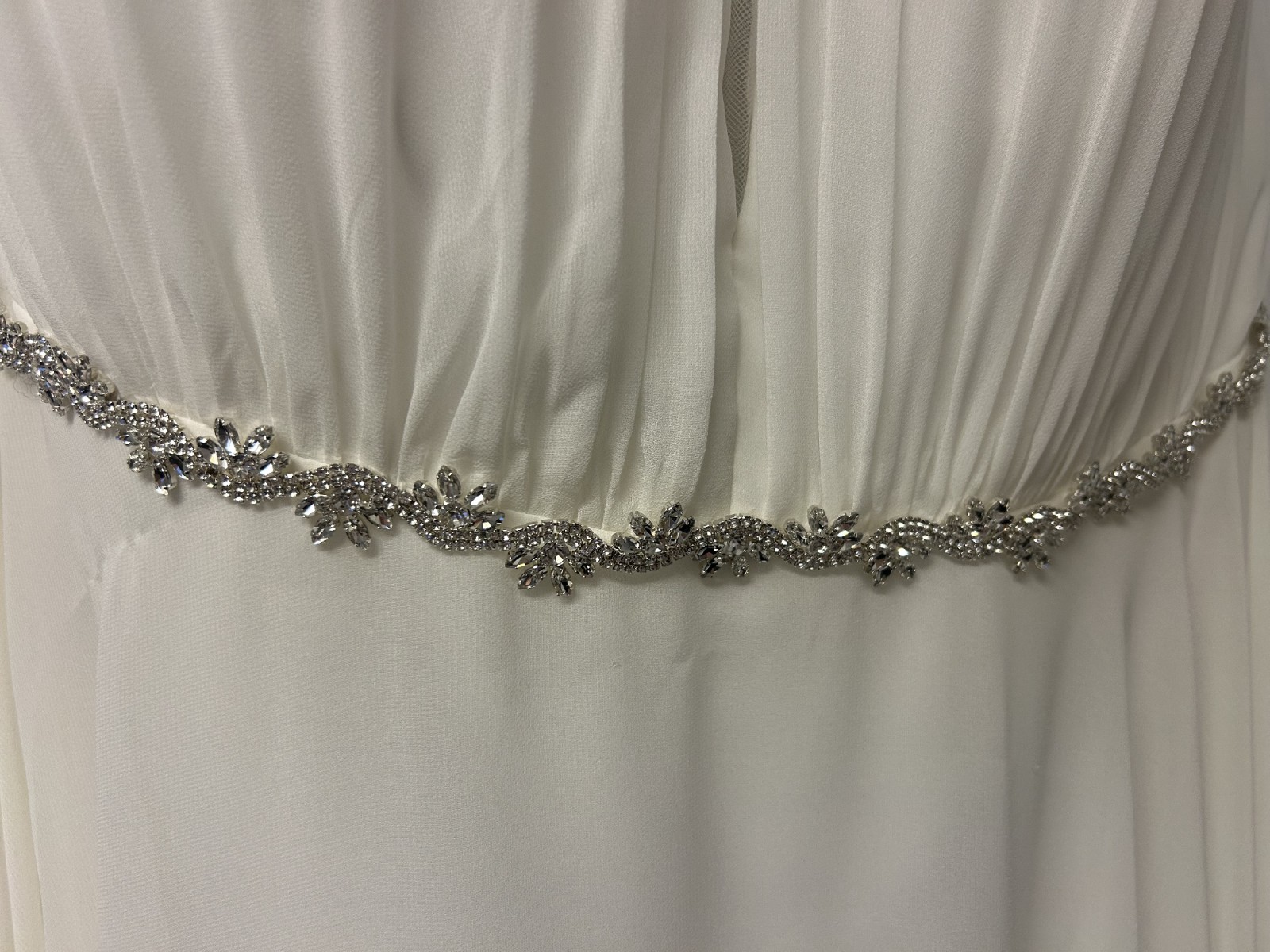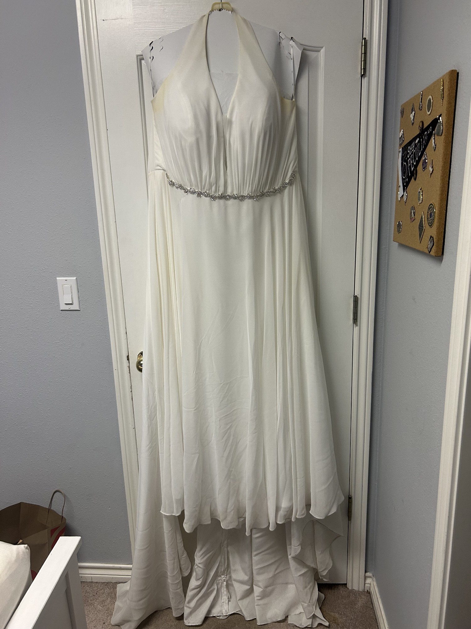 Beautiful David's Bridal halter dress from 2022. It's in good shape - just needs to be dry cleaned to get out the stains in the armpit and the wrinkles. I saved the extra beading from when it was altered.