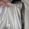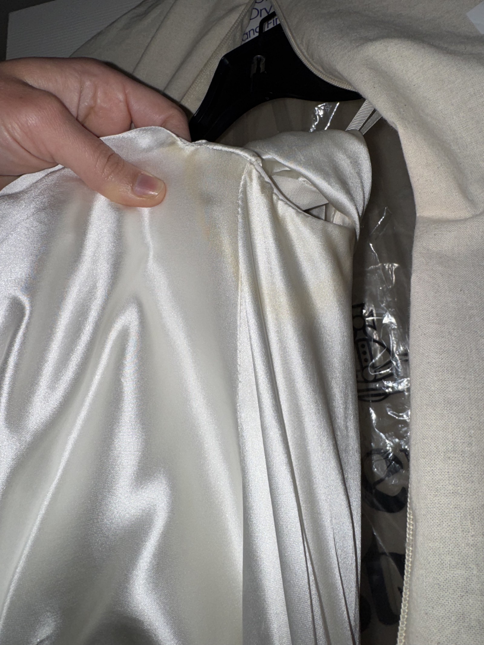 There is a cosmetic deodorant mark on the left underarm (approximately 2.5" x 1.5"). I took the dress to a couture cleaning and restoration specialist, who confirmed the mark is not 100% removable without risking the fabric. I’ve included detailed photos of the underarm, with and without flash, for complete transparency. The mark is not visible when worn, as the sleeves naturally hold the arms down. If desired, it could be concealed with lace detailing or covered using fabric from the hem if you're shorter than me, since the dress length was not altered.