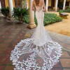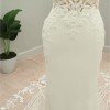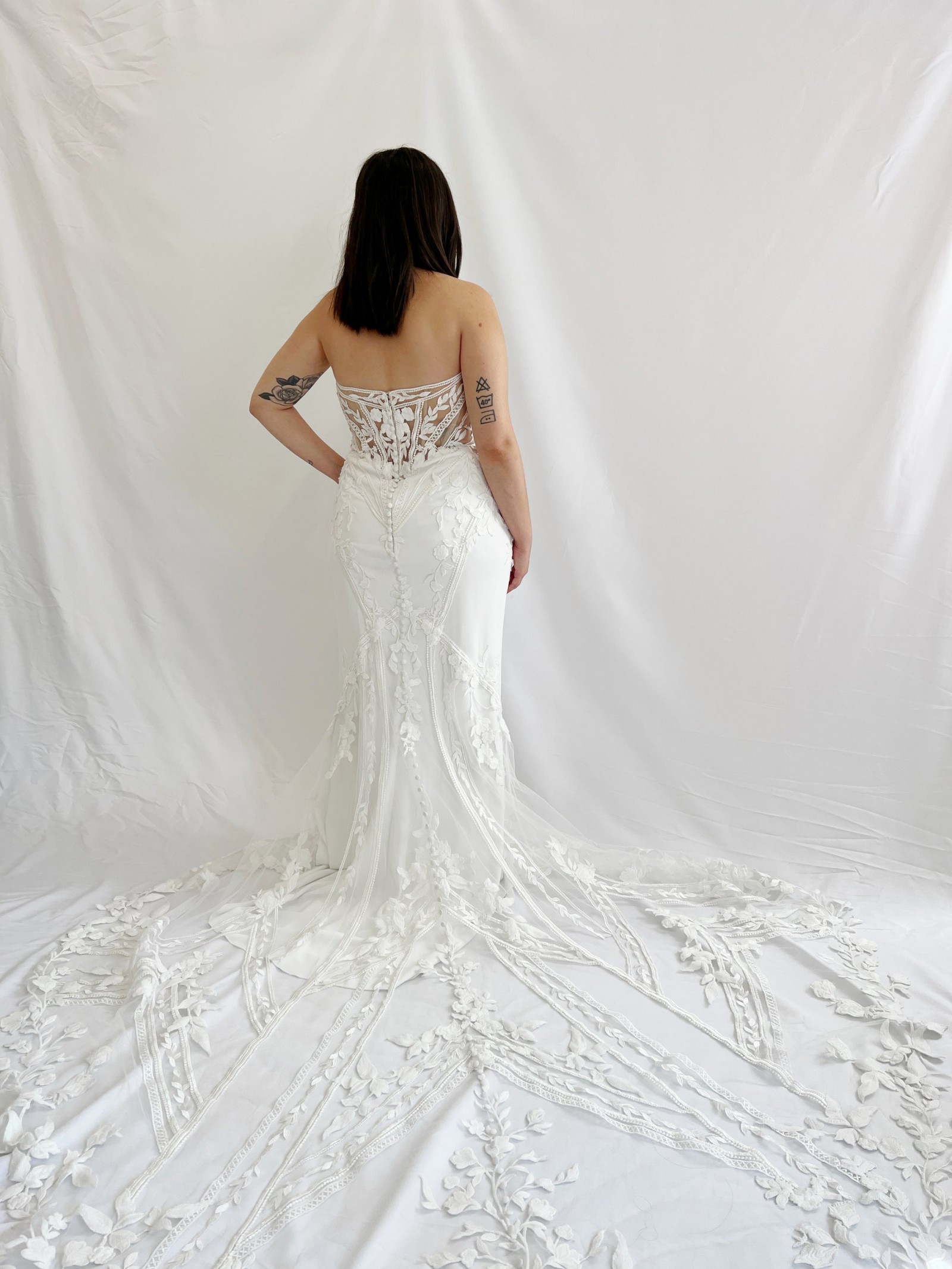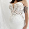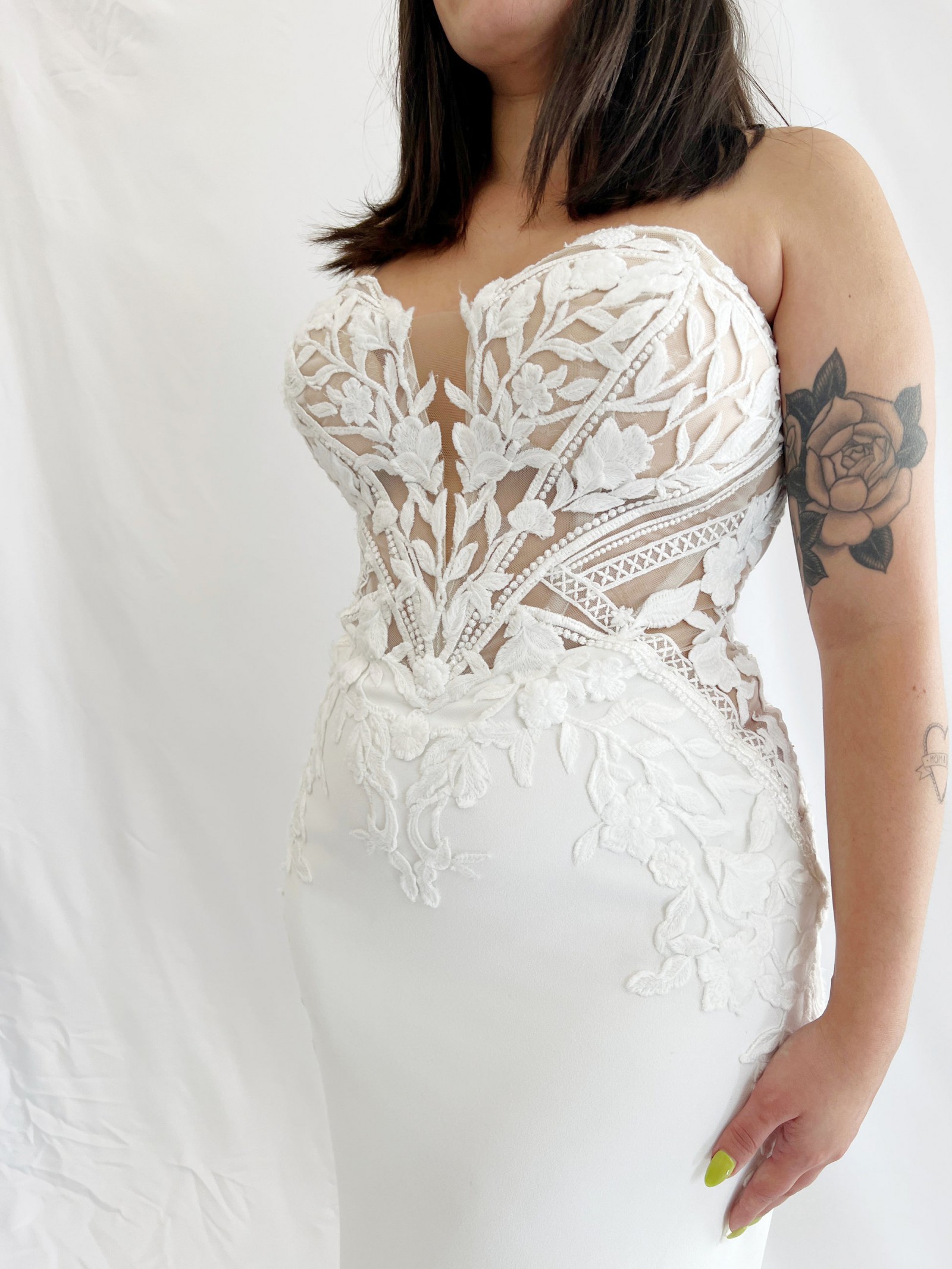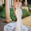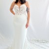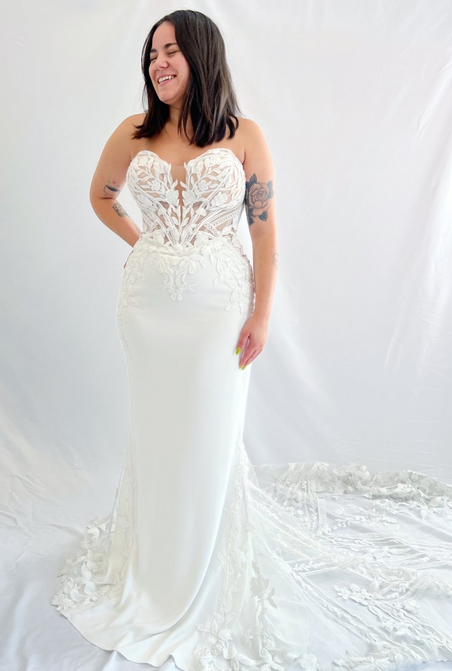 From the designer: This strapless mermaid style is made perfect for our boho bridal babes. The soft sweetheart neckline is embroidered with decadent linear lace. The beautiful crepe fabric is body-contouring while the lace elegantly falls into a floral train. Fall in love with the lined or unlined panel detailing featured on each side of the gown that leads into a sexy and supportive corset-style back.