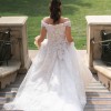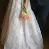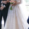 - The dress/train has been hemmed, the sleeves tightened, two bra pads added inside, and two small rose lace appliques added to the bodice in the front to cover the exposed boning