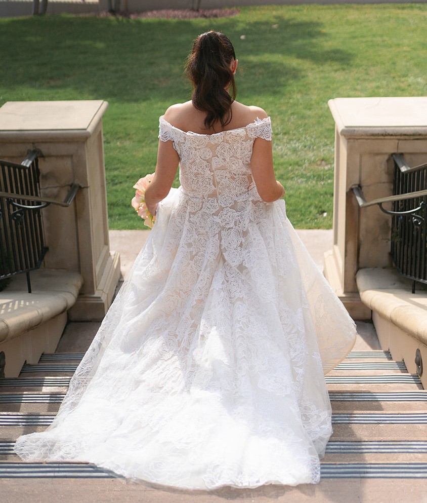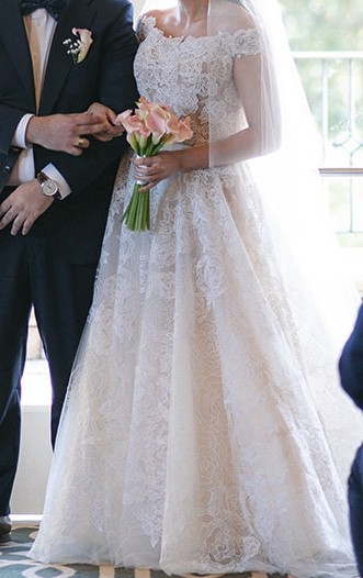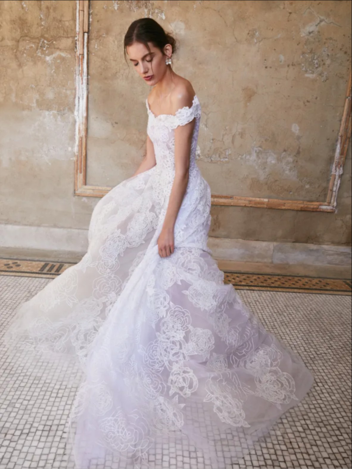 Beautiful Spring 2024 Oscar de la Renta wedding dress, look 4. Features beautiful hand made rose detailed lace.