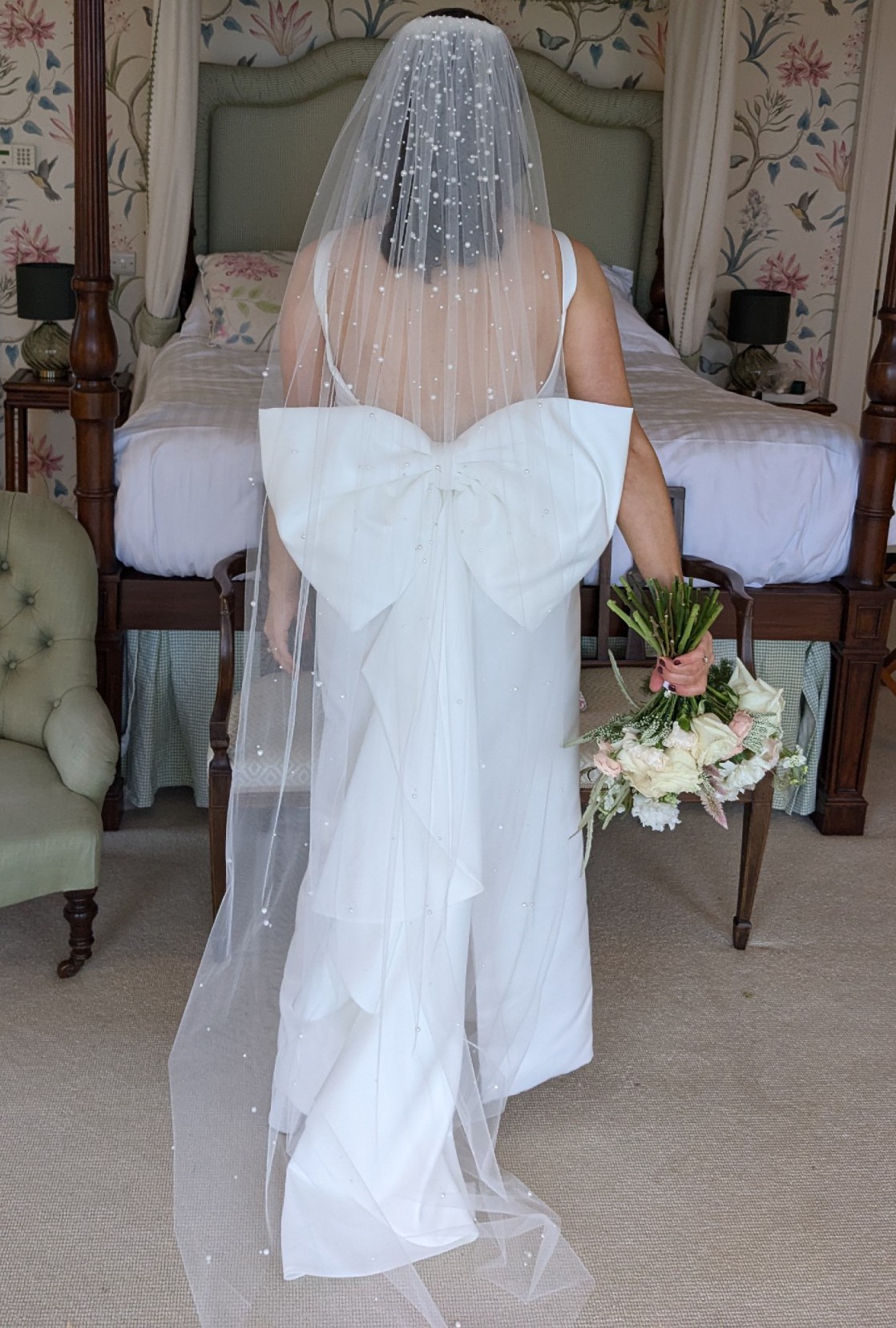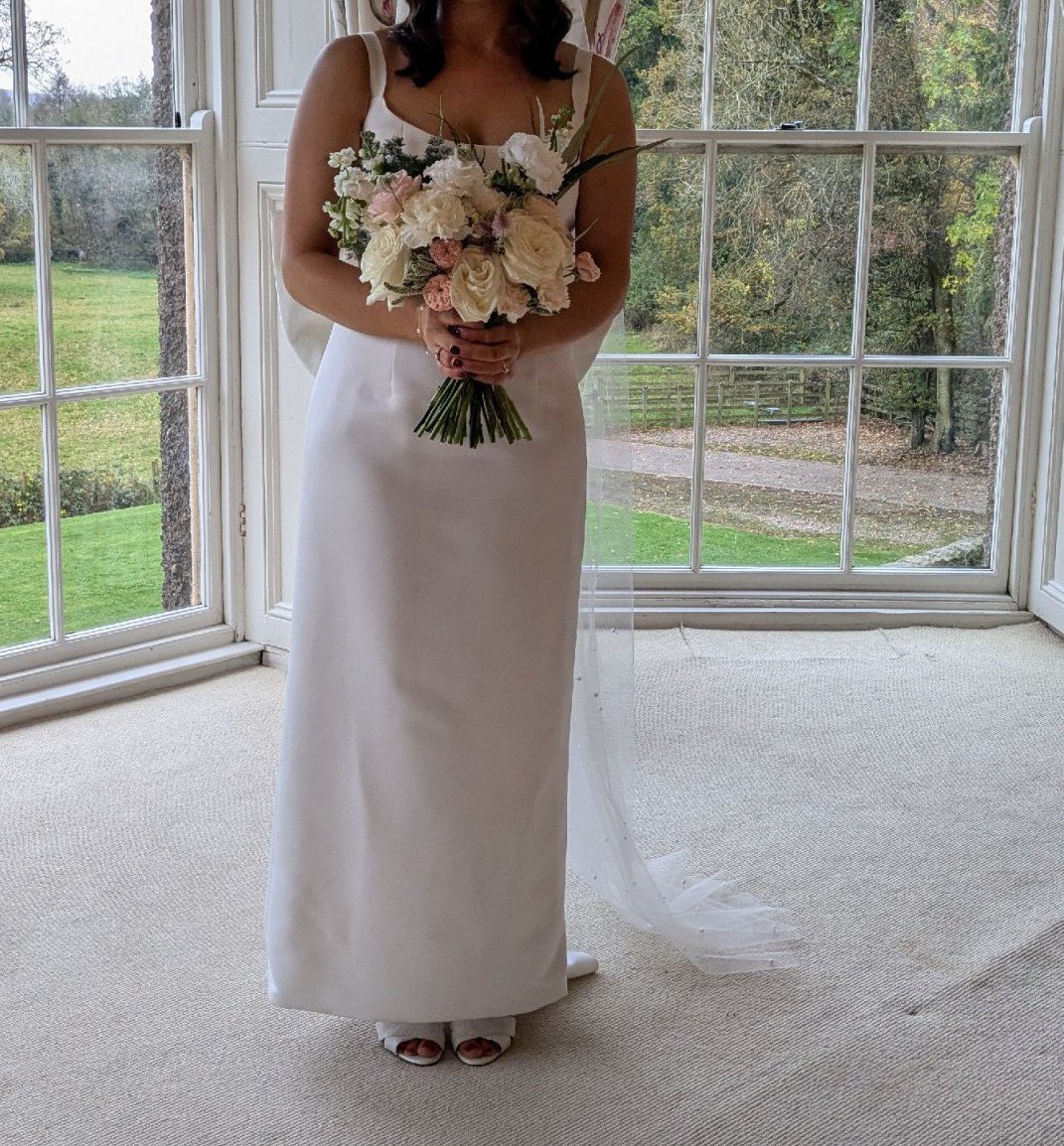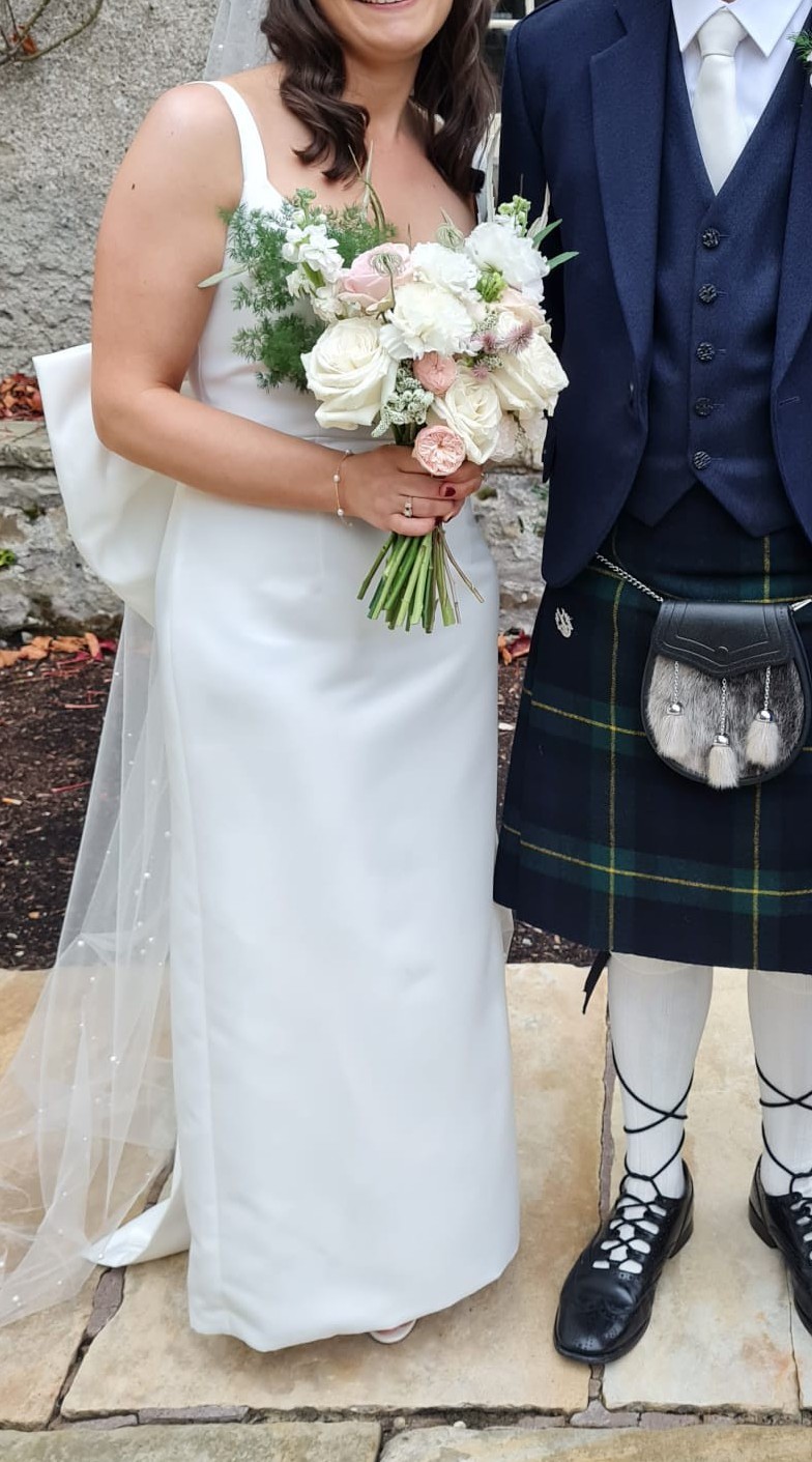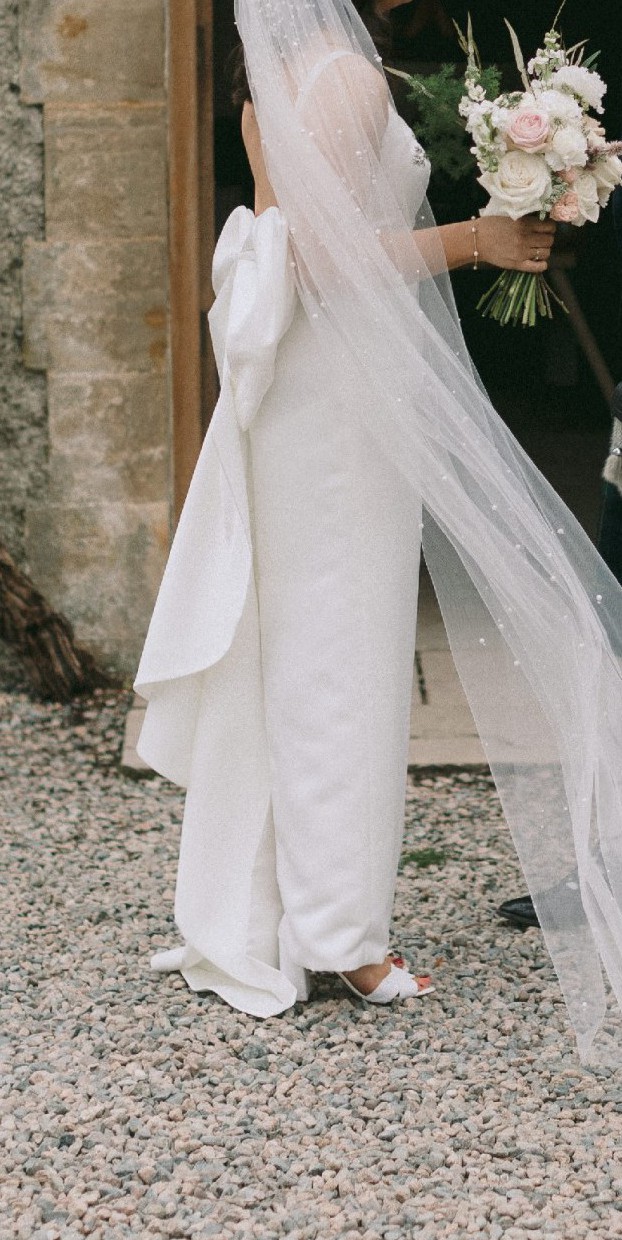 Zoe Rowyn Judith dress purchased in Folkster Kilkenny in 2024. Worn for wedding day November 2024 and professionally dry cleaned within 2 weeks of wedding day, excellent condition. Very comfortable dress. Bow is detachable and will include sequined belt which can be worn later in evening when bow is taken off. I loved wearing this dress & hope someone else can enjoy it. I am a size 10-12. Veil not included.