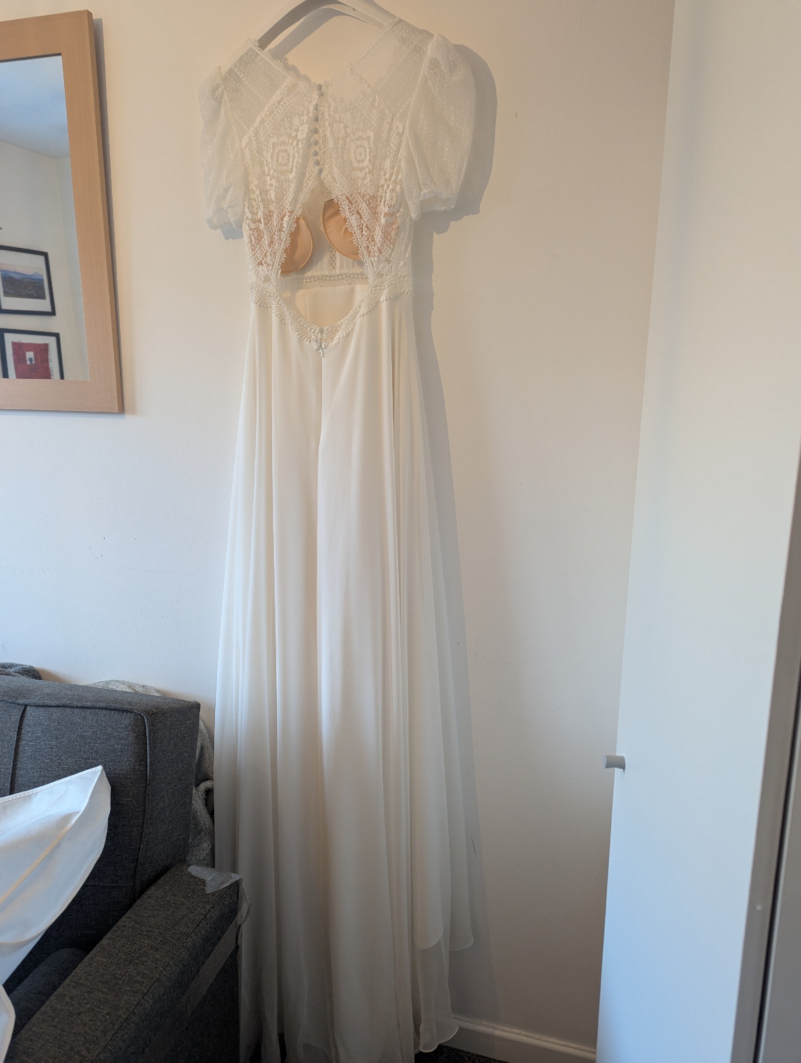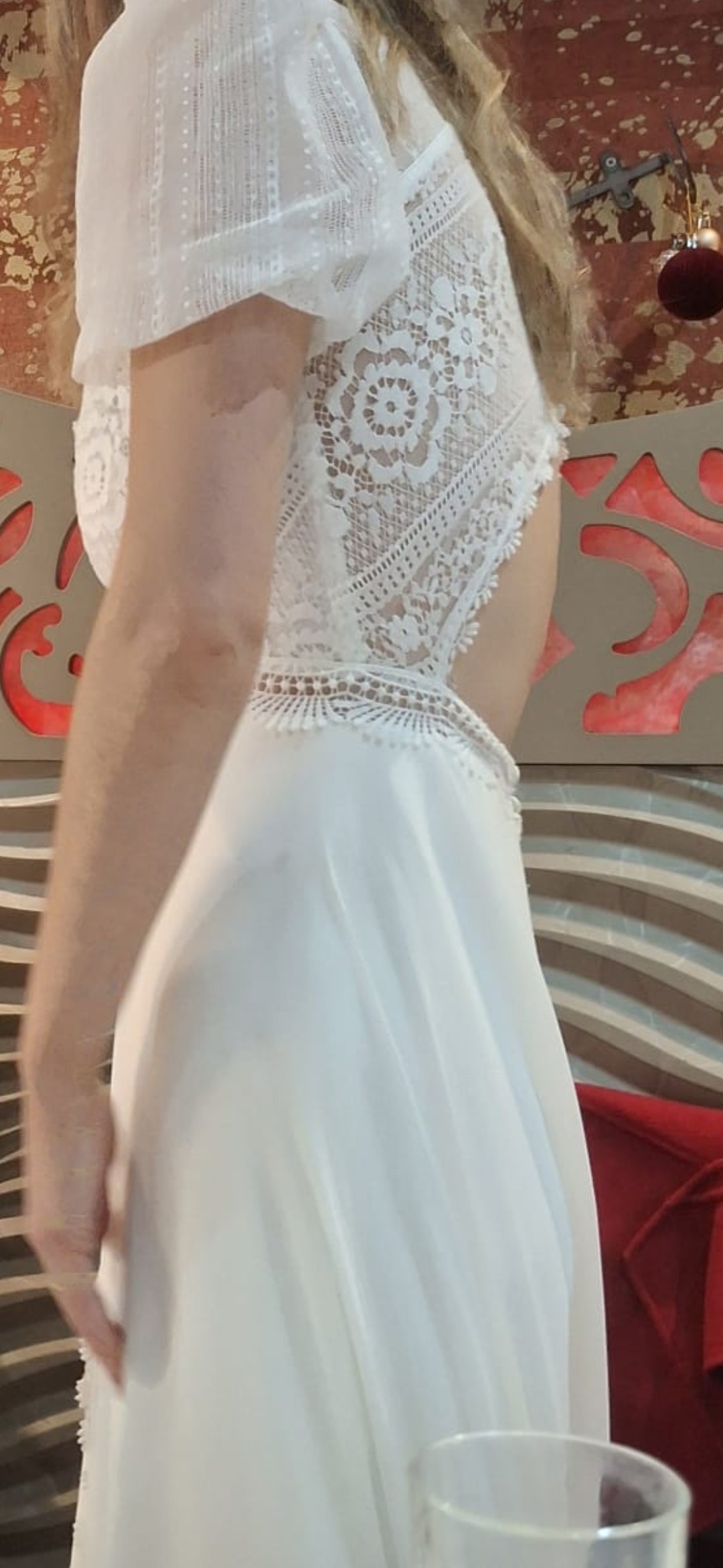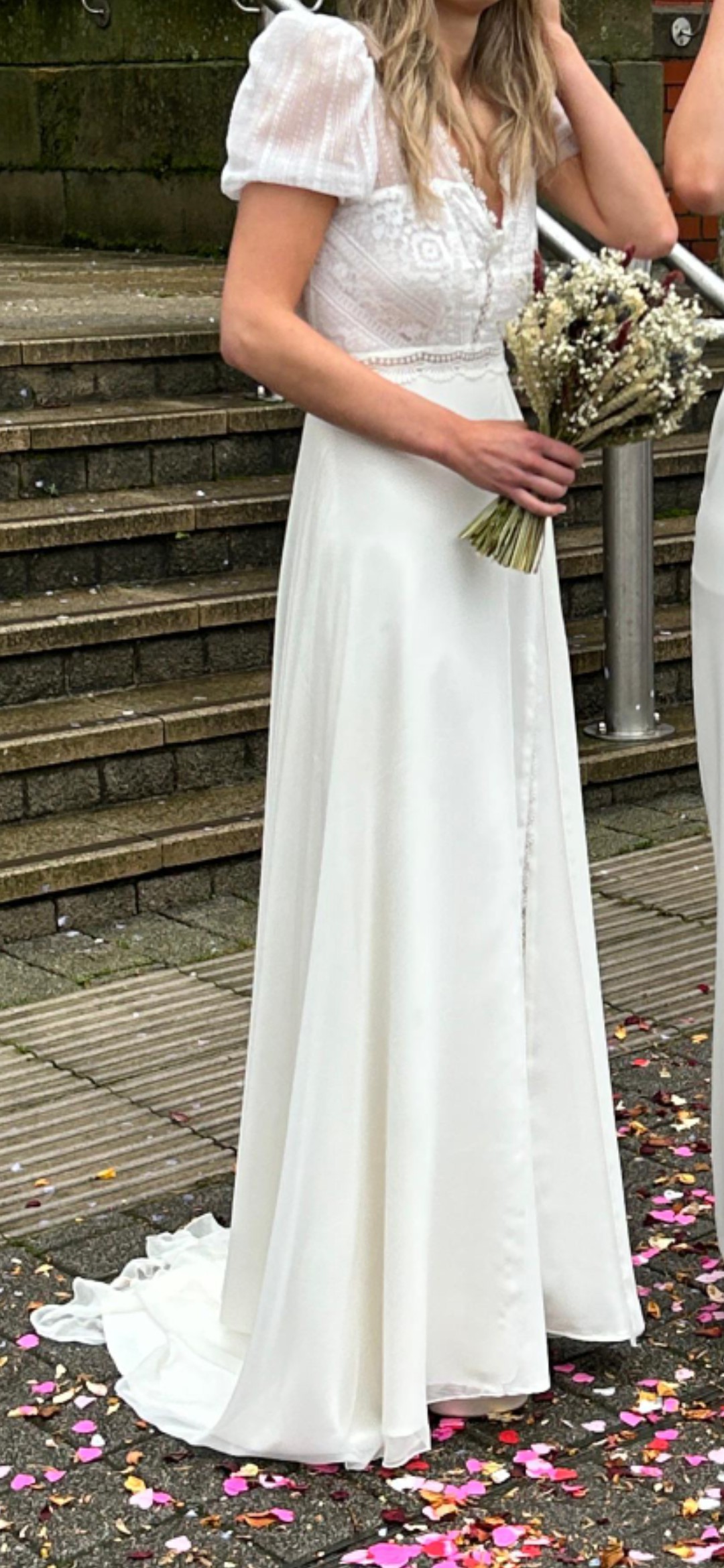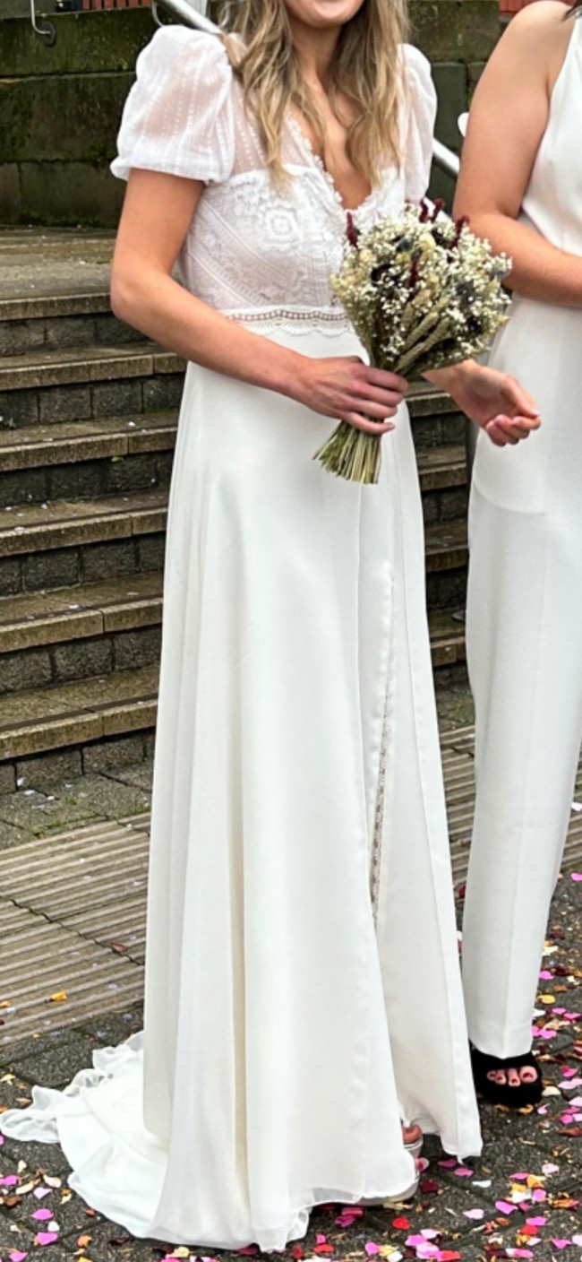 Authentic Marylise “Thalia” wedding dress, a modern and elegant designer gown with a beautiful boho feel.