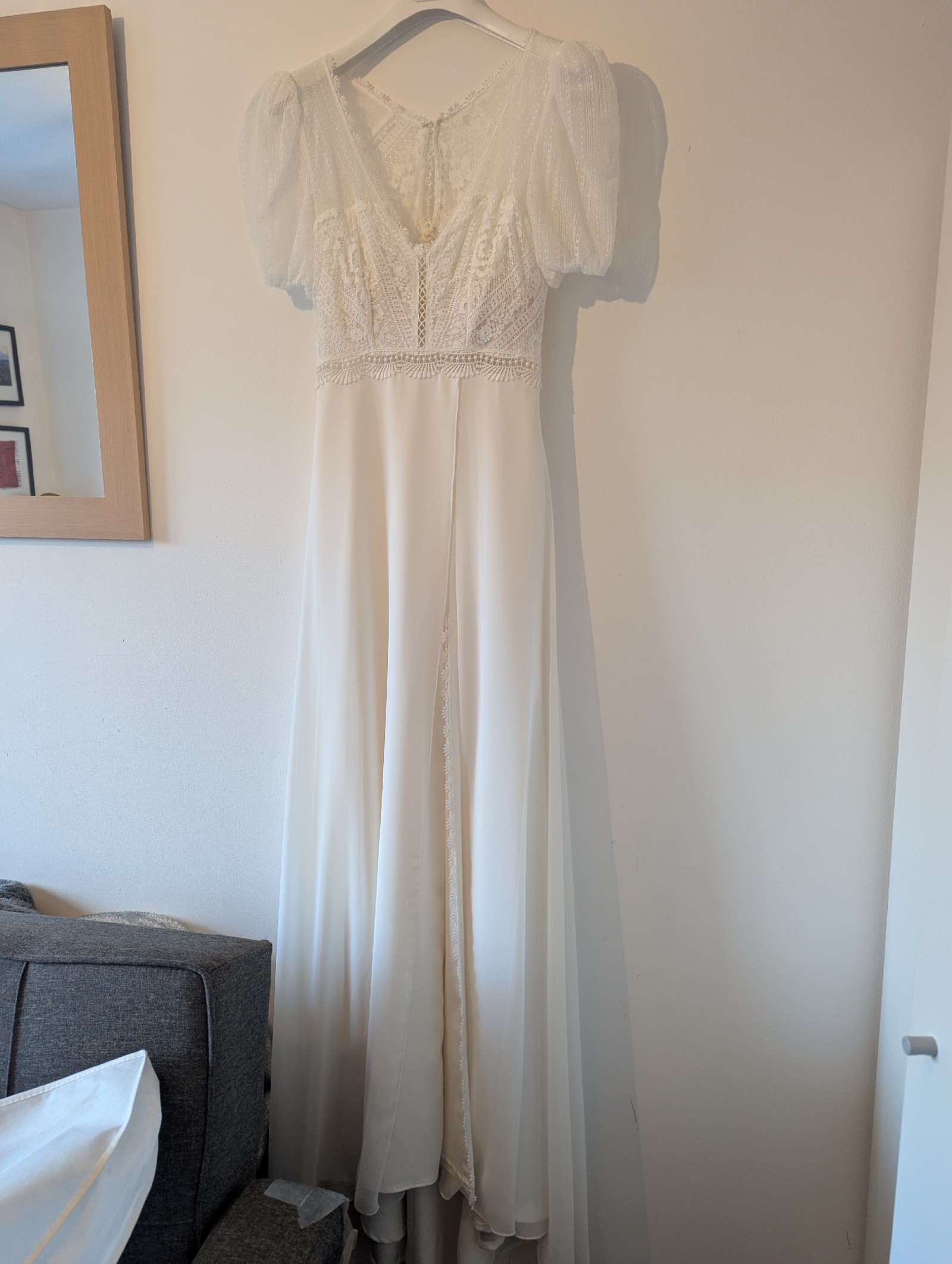Marylise “Thalia” Wedding Dress – Lace Bodice, Puff Sleeves, Front Slit