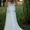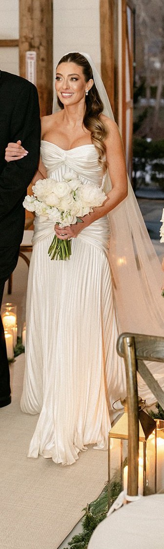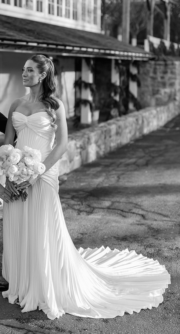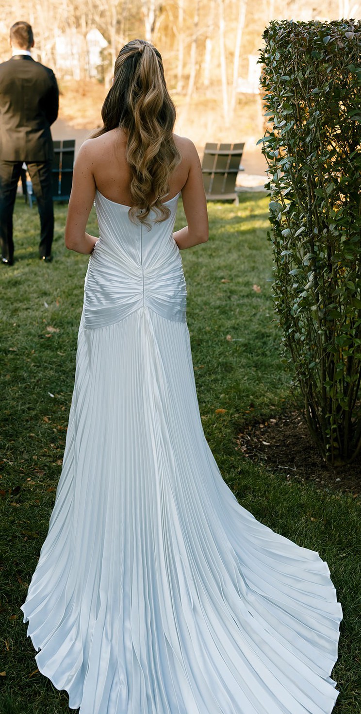 The gown has a strapless sweetheart neckline and a sleek sheath silhouette that softly skims the body. Subtle pleating and vertical texture throughout the skirt create an elongated, sculpted look, while the soft train adds just the right amount of drama without overwhelming the design. It photographs beautifully and feels both modern and classic.