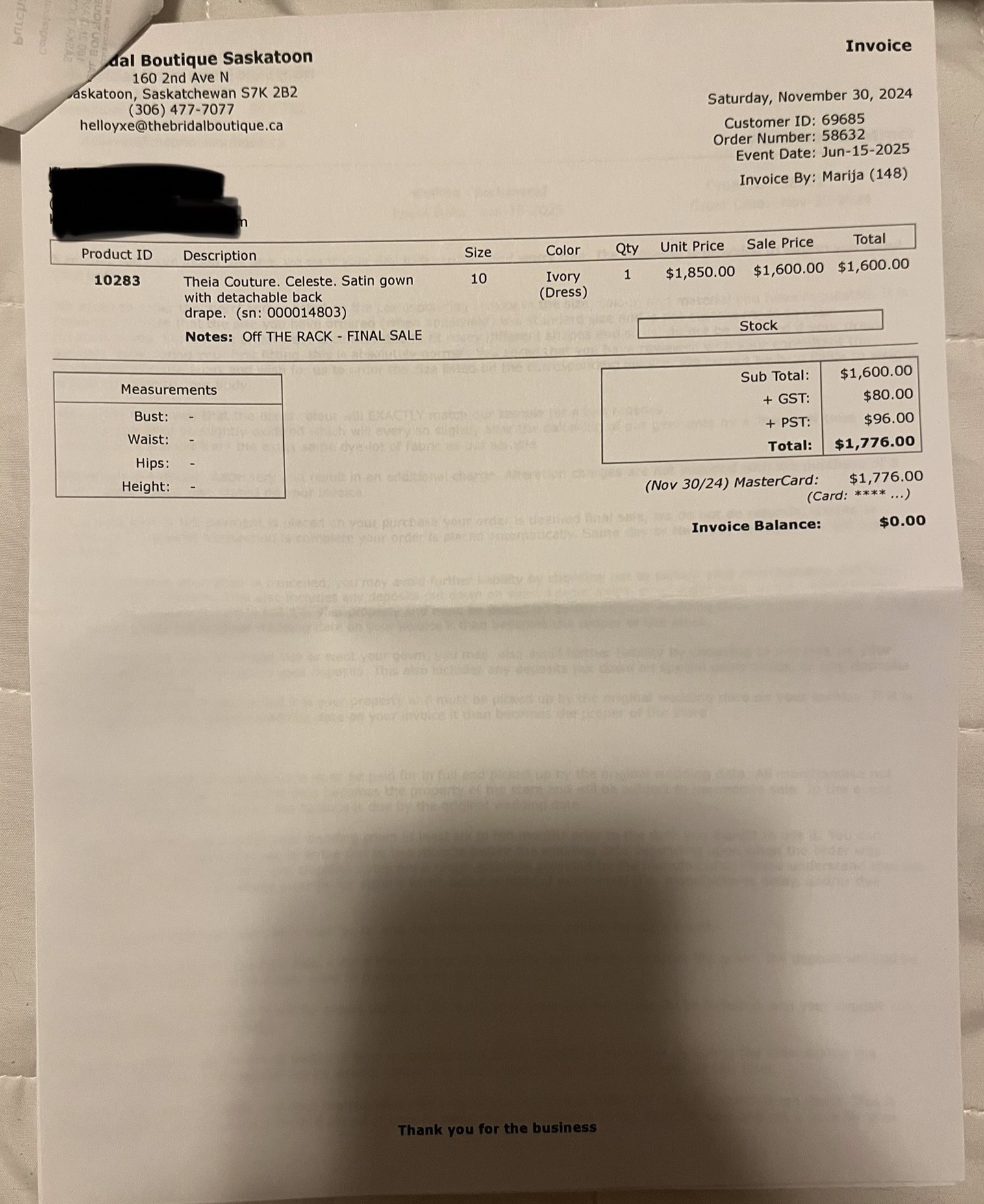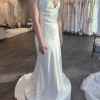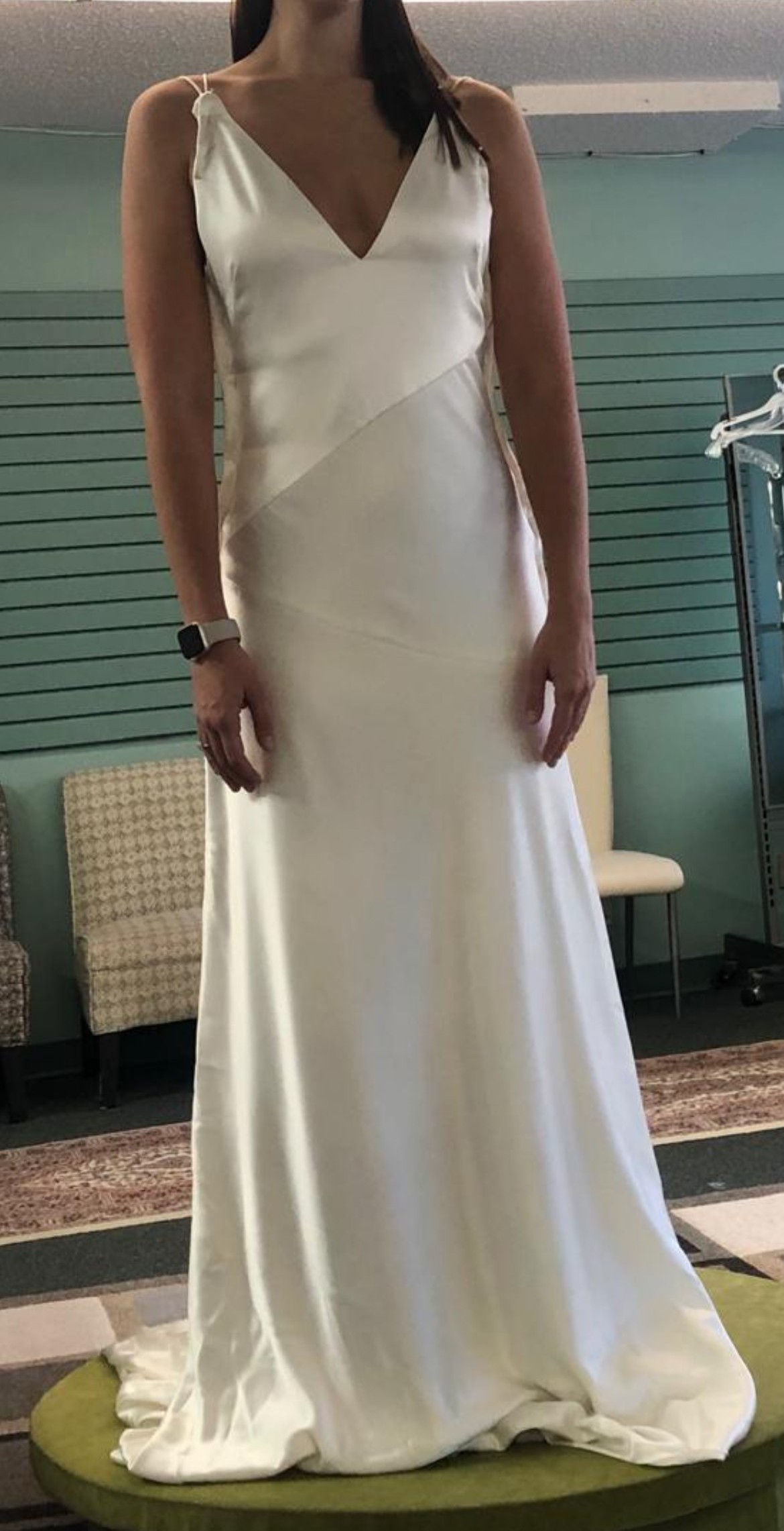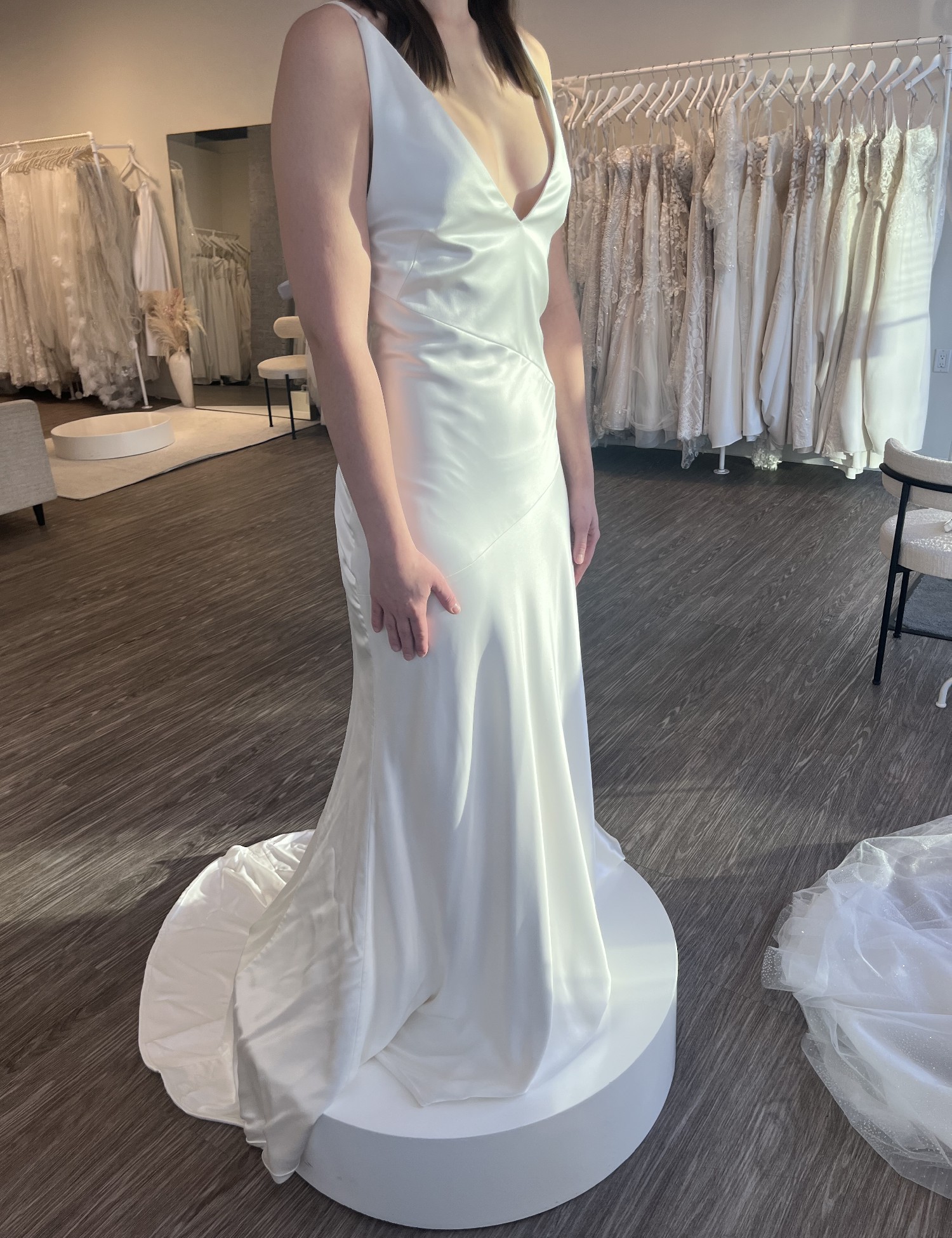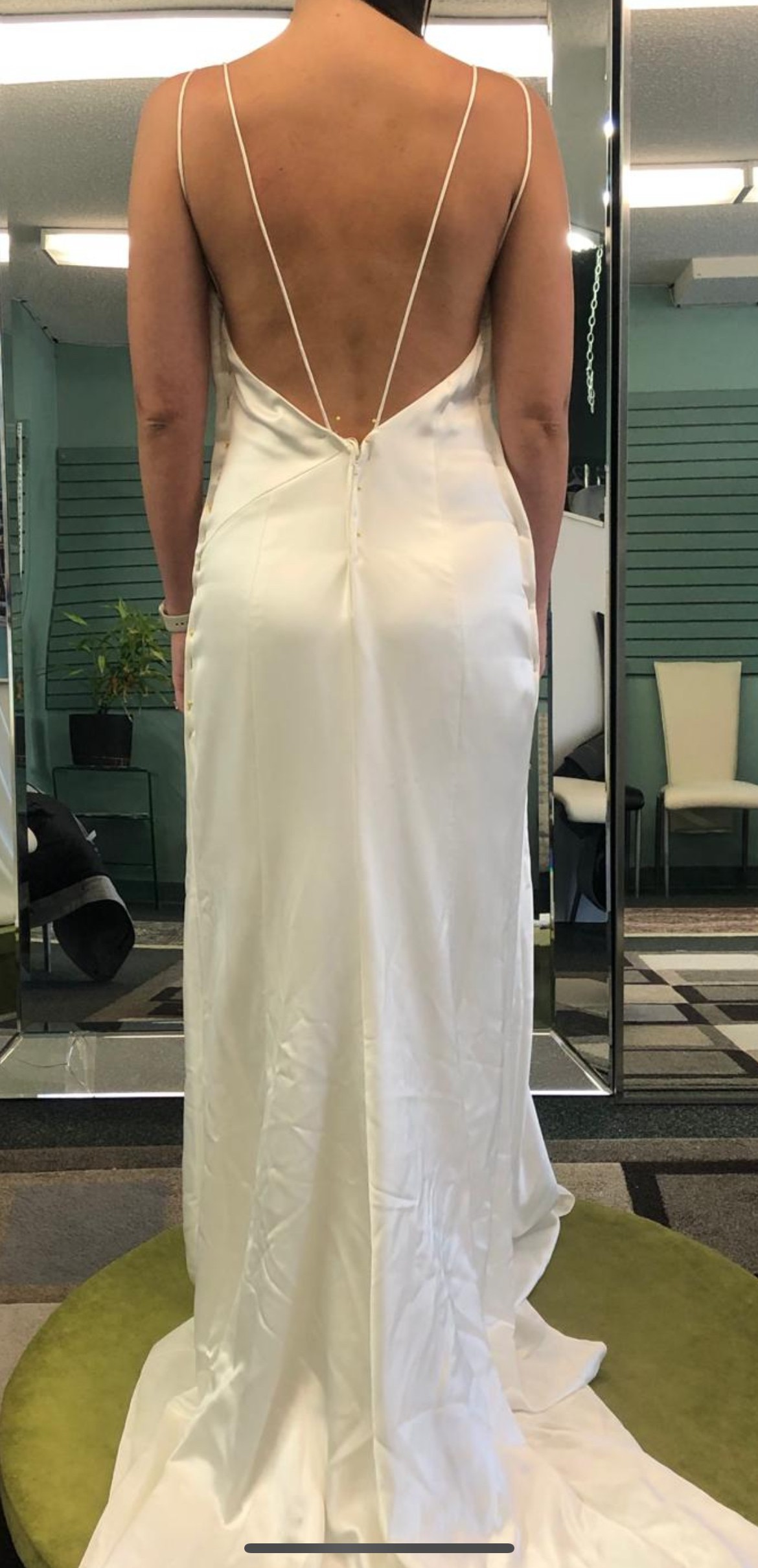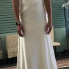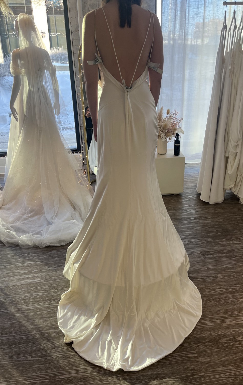 I originally bought this dress thinking it was the one, from a wedding dress shop called Bridal Boutique in Saskatoon, SK. When I took it to get altered and tried it on after buying it, I changed my mind and ended up going back and getting a completely different style of dress. It’s a beautiful dress, simple and satin, and is a sample dress off the rack from Bridal Boutique in Saskatoon, SK. I never ended up getting it altered so it is a size 10 still and completely unaltered! The pictures show it clipped up, so it is quite a bit bigger and can be altered as needed.