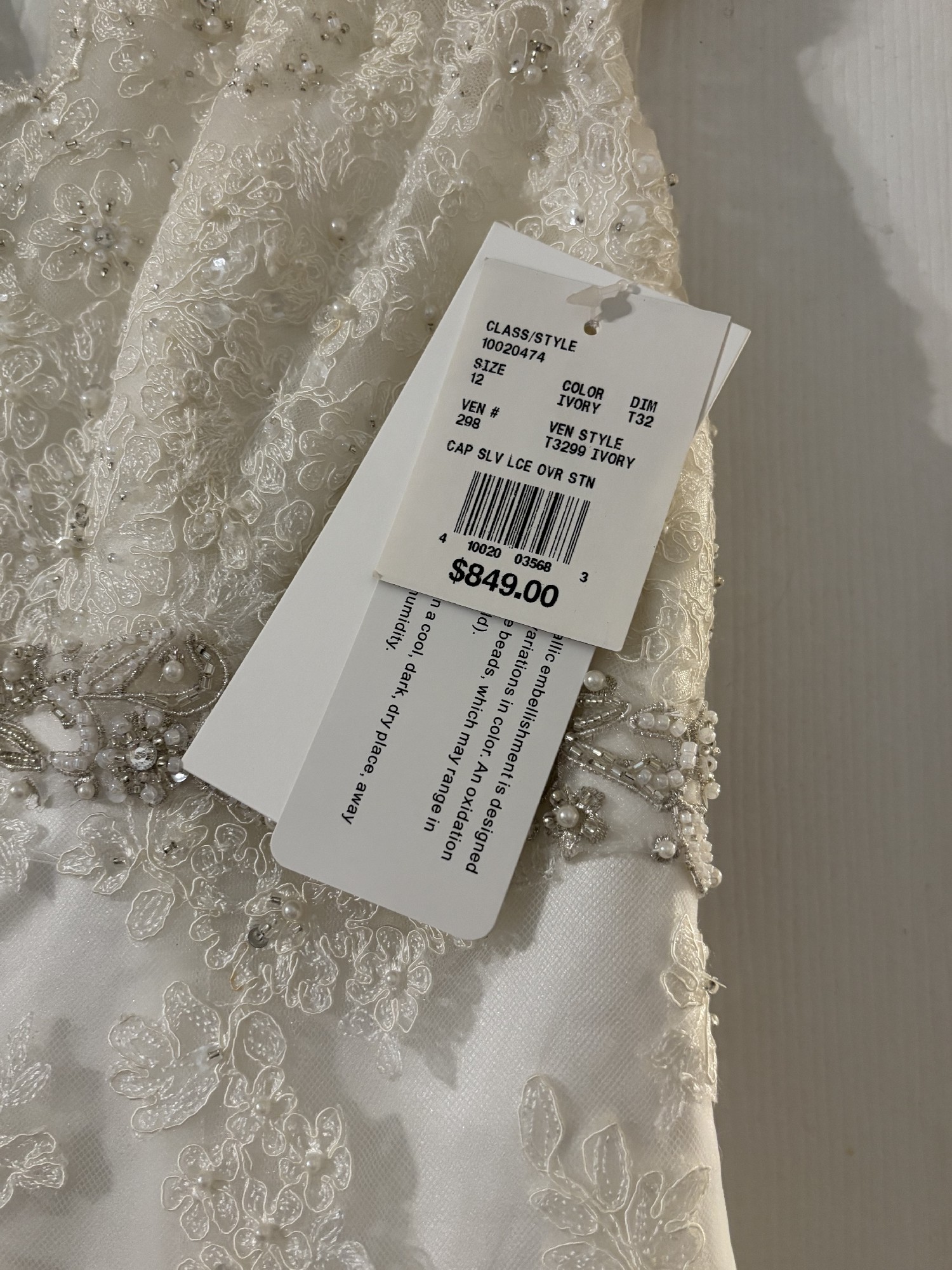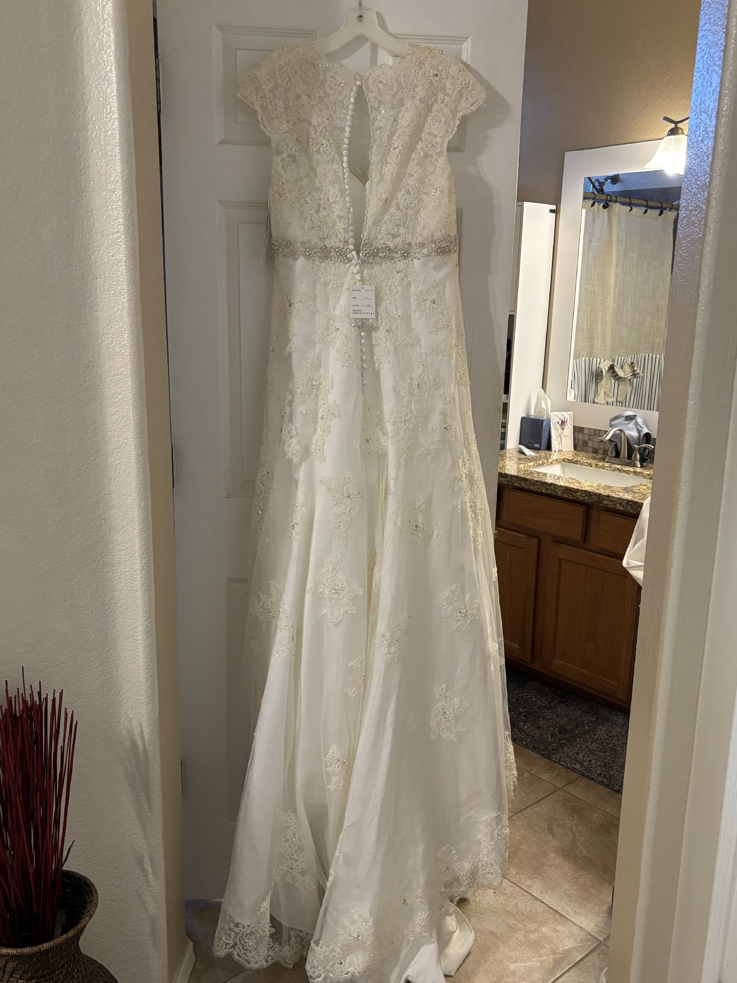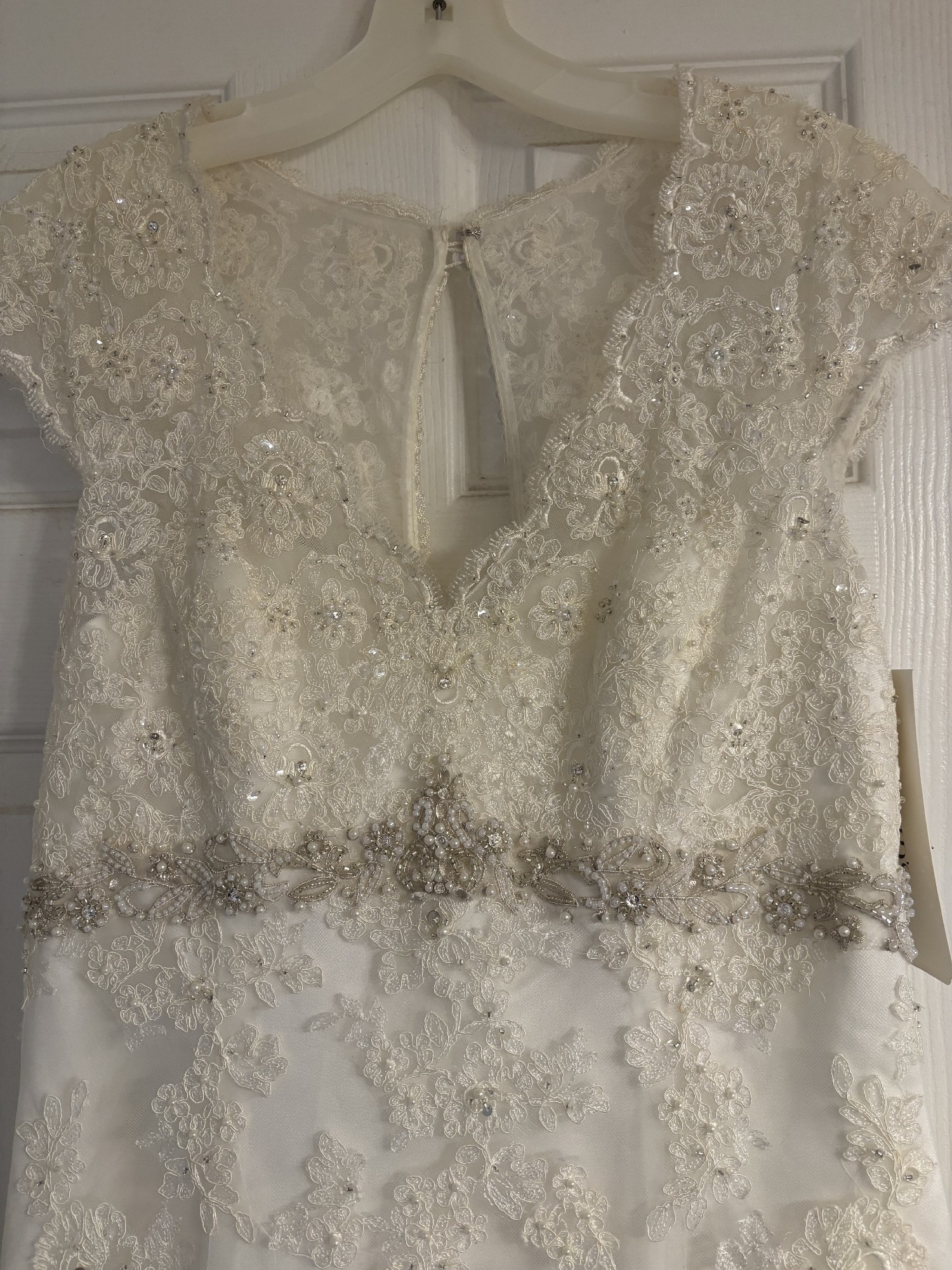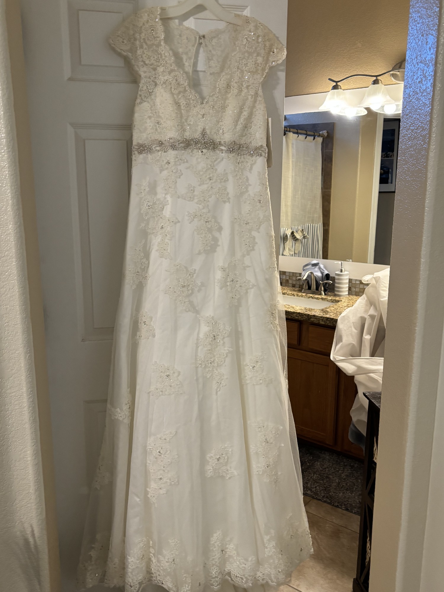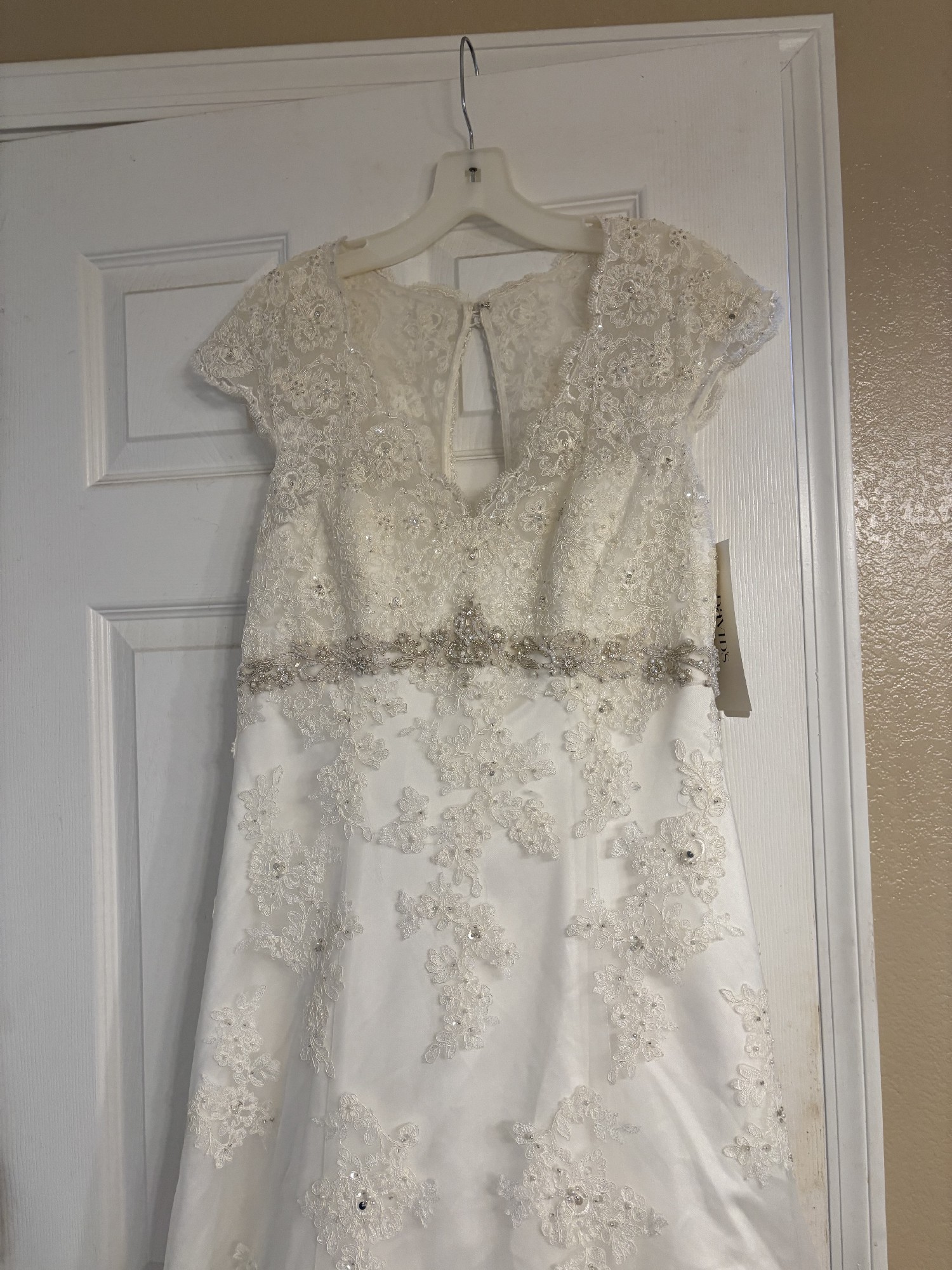 New unaltered David’s Bridal dress, beautiful ivory color with lace and beading. Flattering dress.