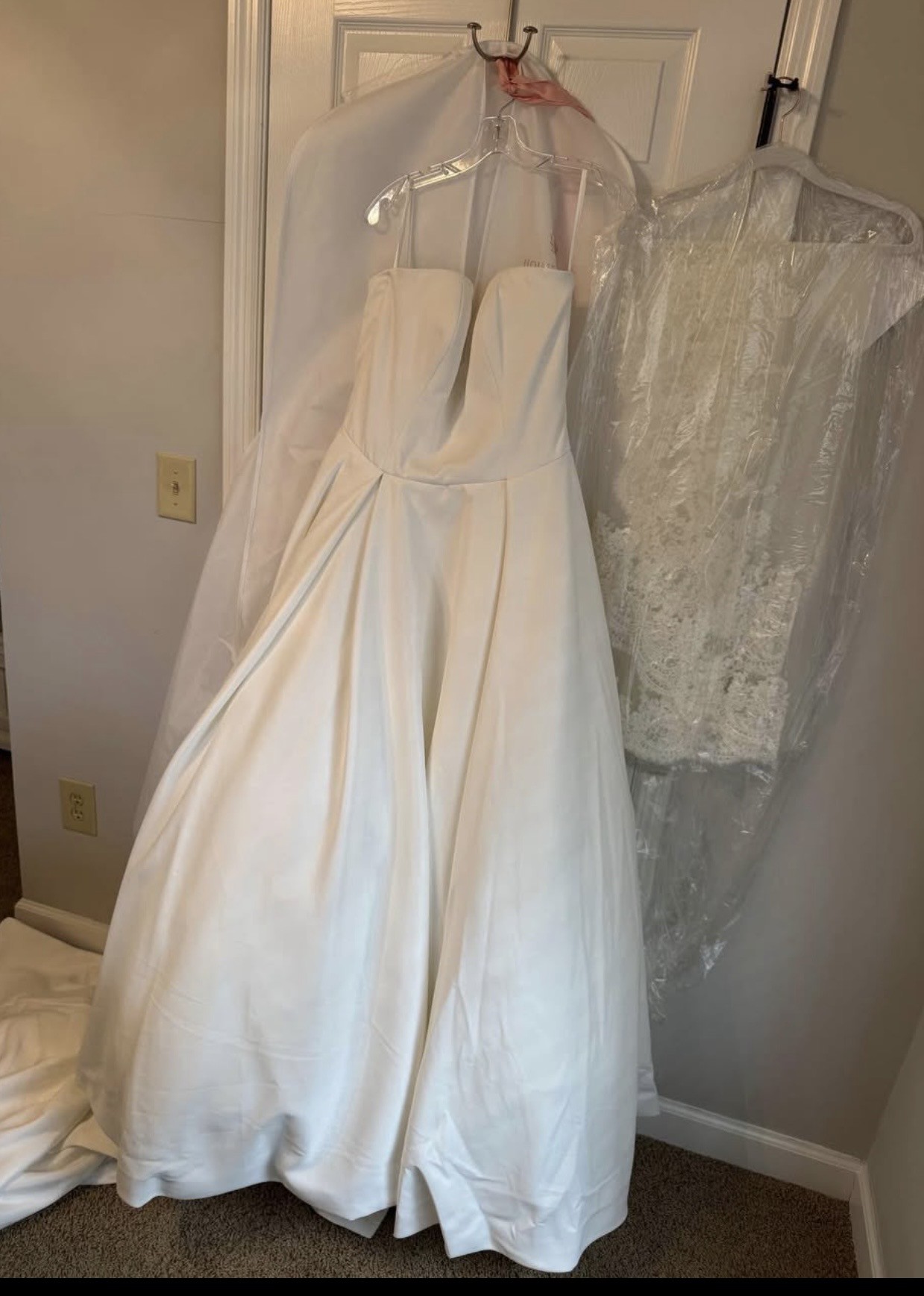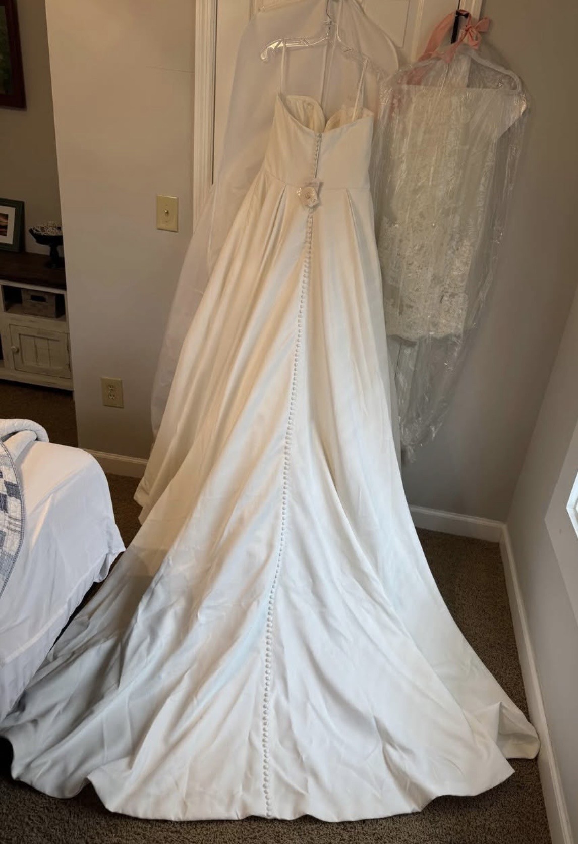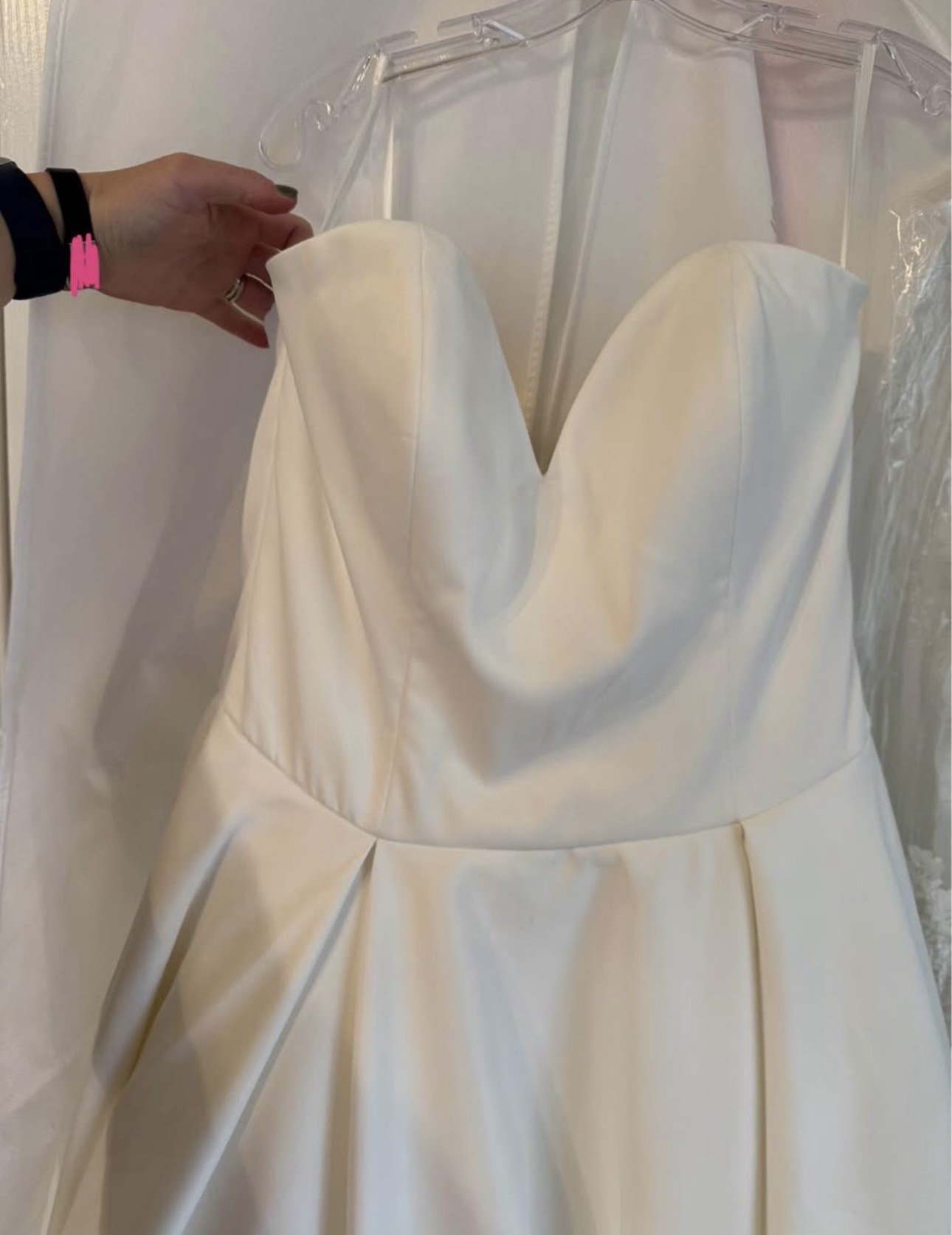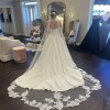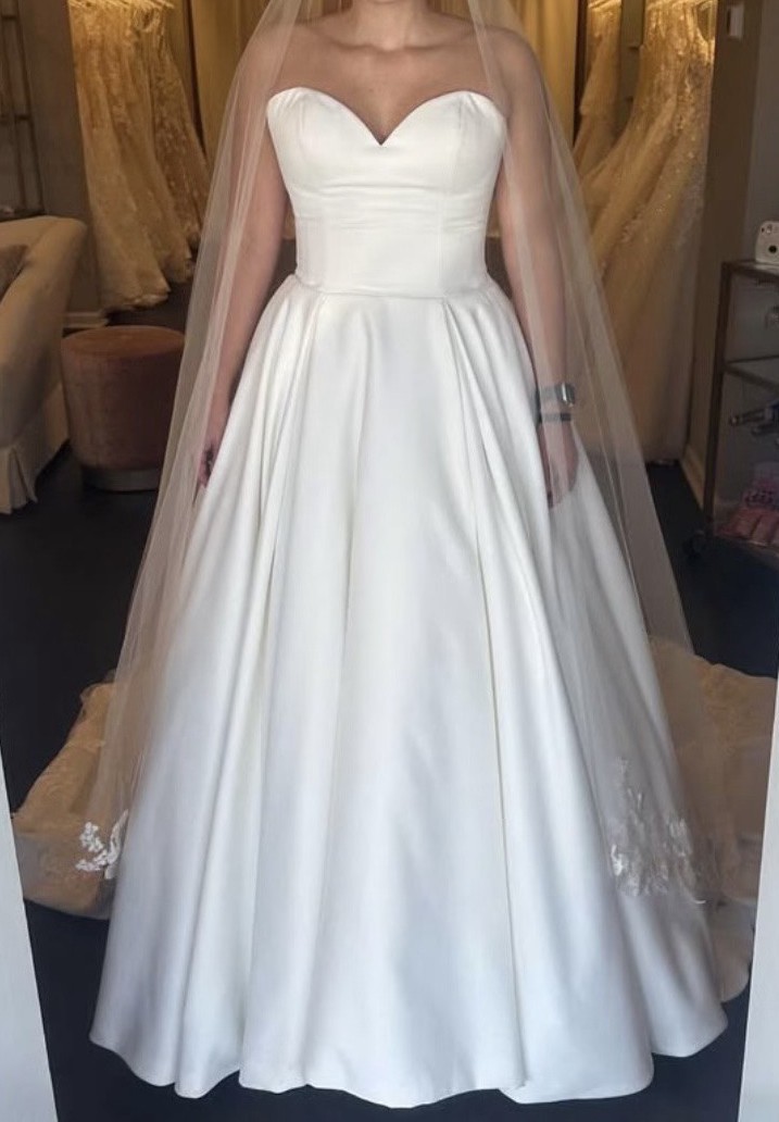 Crafted with intricate attention to detail, the cascading fabric dances with every step you take, reflecting light and capturing the beauty of your special day. In size 16, this stunning gown invites you to embrace your curves and feel at your most beautiful. Let this enchanting wedding dress be the canvas for your love story, making memories that will last a lifetime.