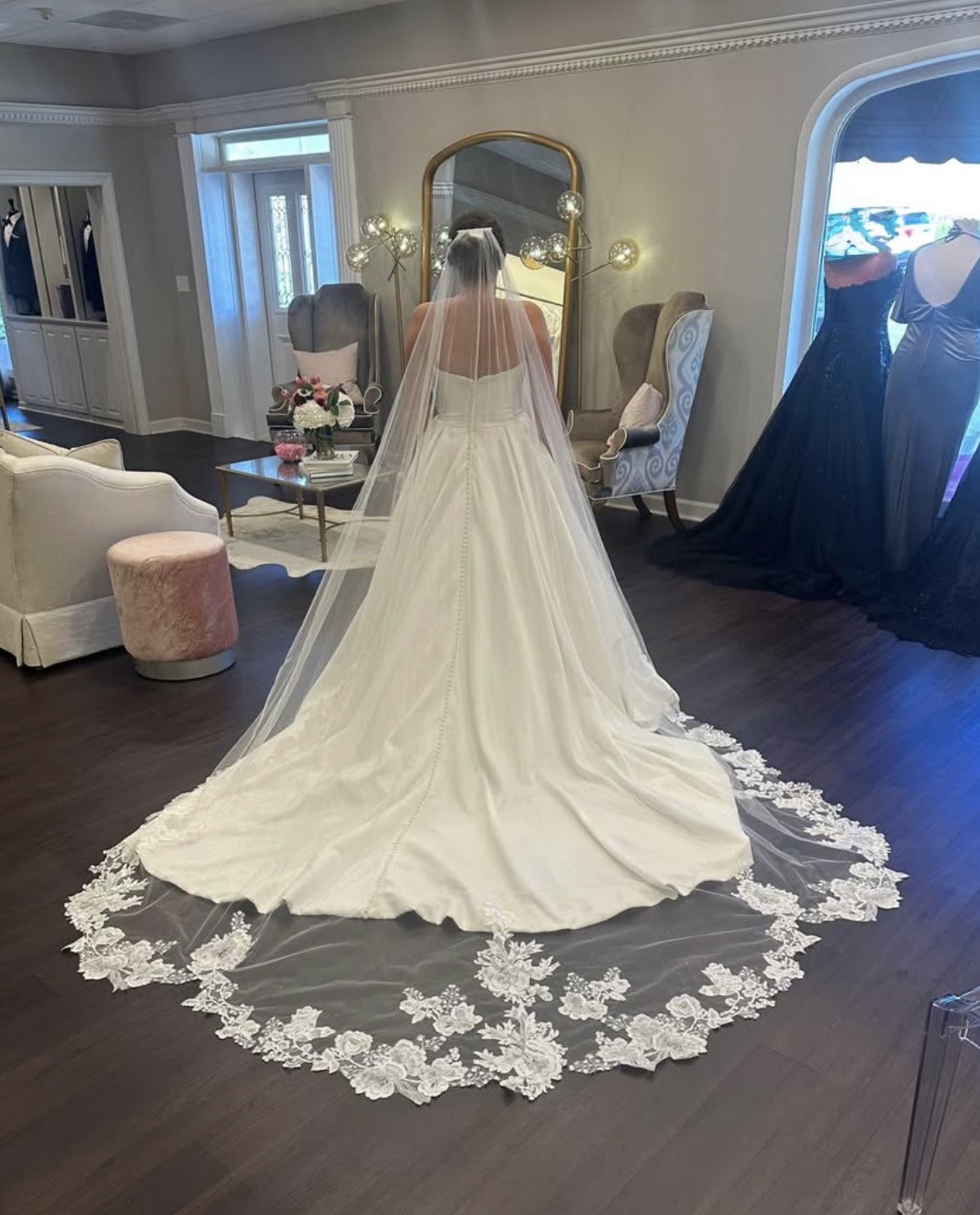 This AMSALÉ silk white veil is the epitome of timeless bridal elegance. Crafted from airy, sheer tulle, it cascades gracefully to cathedral length, creating a soft, ethereal silhouette as it flows behind the gown. The veil is exquisitely finished with a delicate lace appliqué border along the hem, adding romantic texture and refined detail without overwhelming the look.