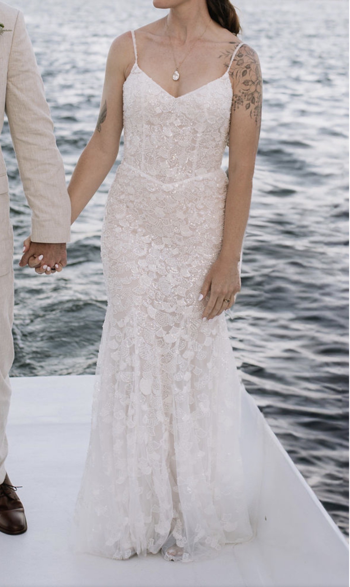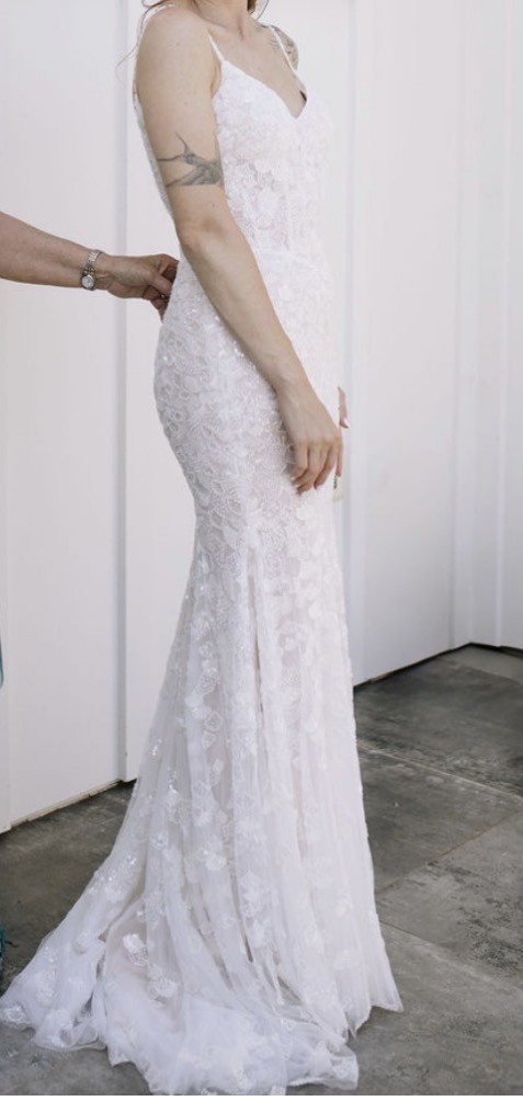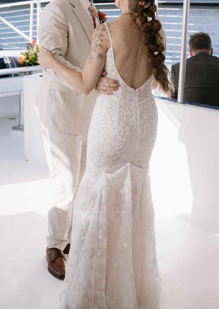 This is a one of a kind, custom Dany Tabet “Coral” dress that I ordered directly from the designer via Everly Bridal in Vancouver, Canada. The base style is Coral, with a bodice pattern swap to the designer’s “Albany” design. I added a basque waist and lowered the back, and made the straps beaded lace to match the rest of the dress. It is a split size gown: Bust: 4, Waist: 6, Hips: 4. There is a light nude liner from the waist down. Only minor alterations were made as listed below. Minor wear from being worn once on my wedding day also listed below. I tried on dozens of gowns and ultimately decided to be 100% happy I needed to create my own! It was perfect for me, and I would love for it to get lots more wear by all the other stunning mermaid brides out there! I welcome questions and will consider offers, as sustainability is a core ethos for me and the one time use of so many wedding related items including dresses was difficult to navigate in my own wedding planning journey. The retail price below does not include alterations, customs fees, or dry cleaning. I spent $4425 on this gown.