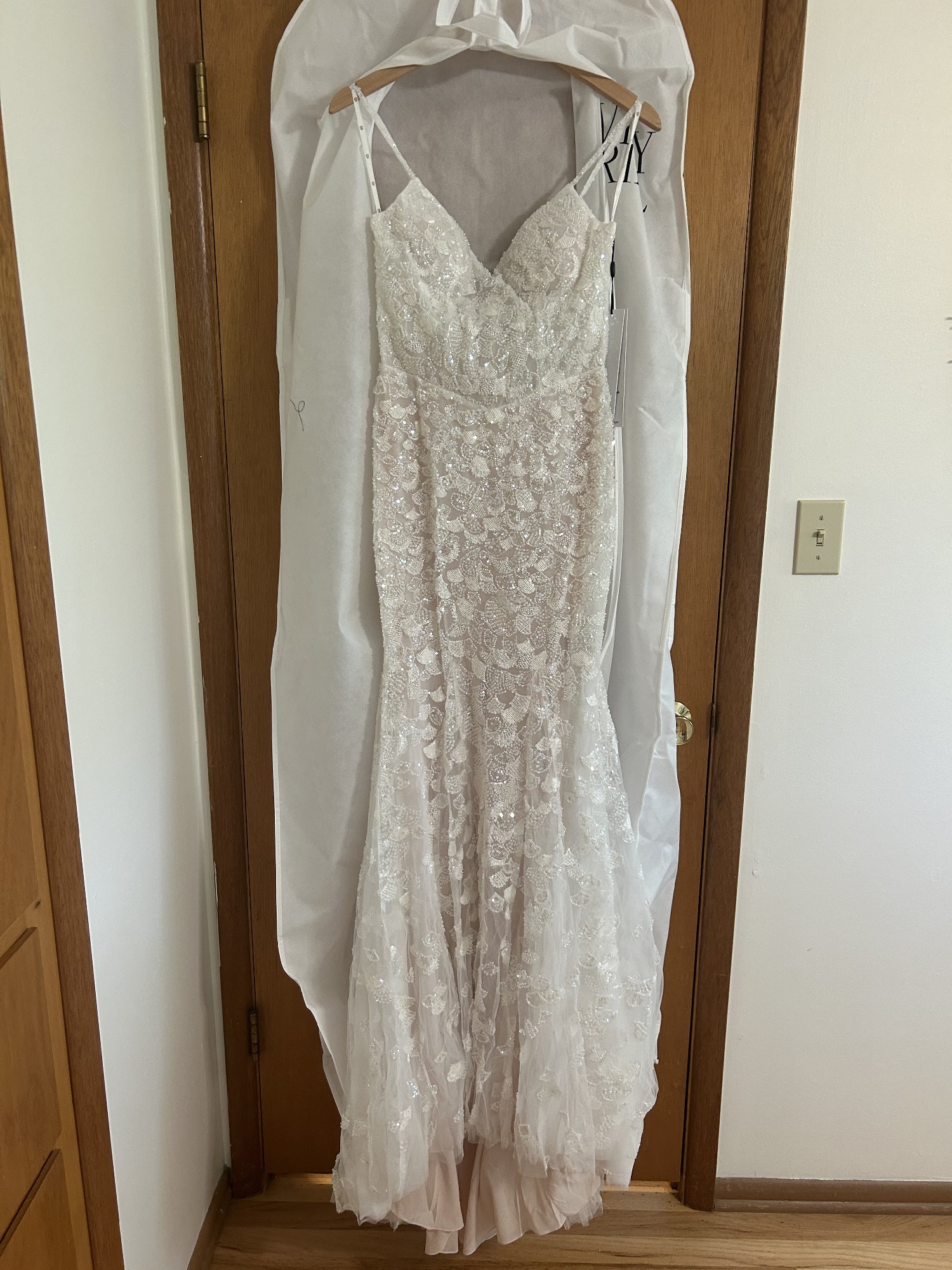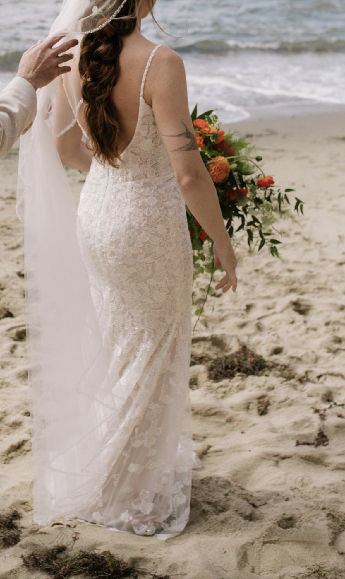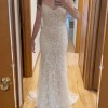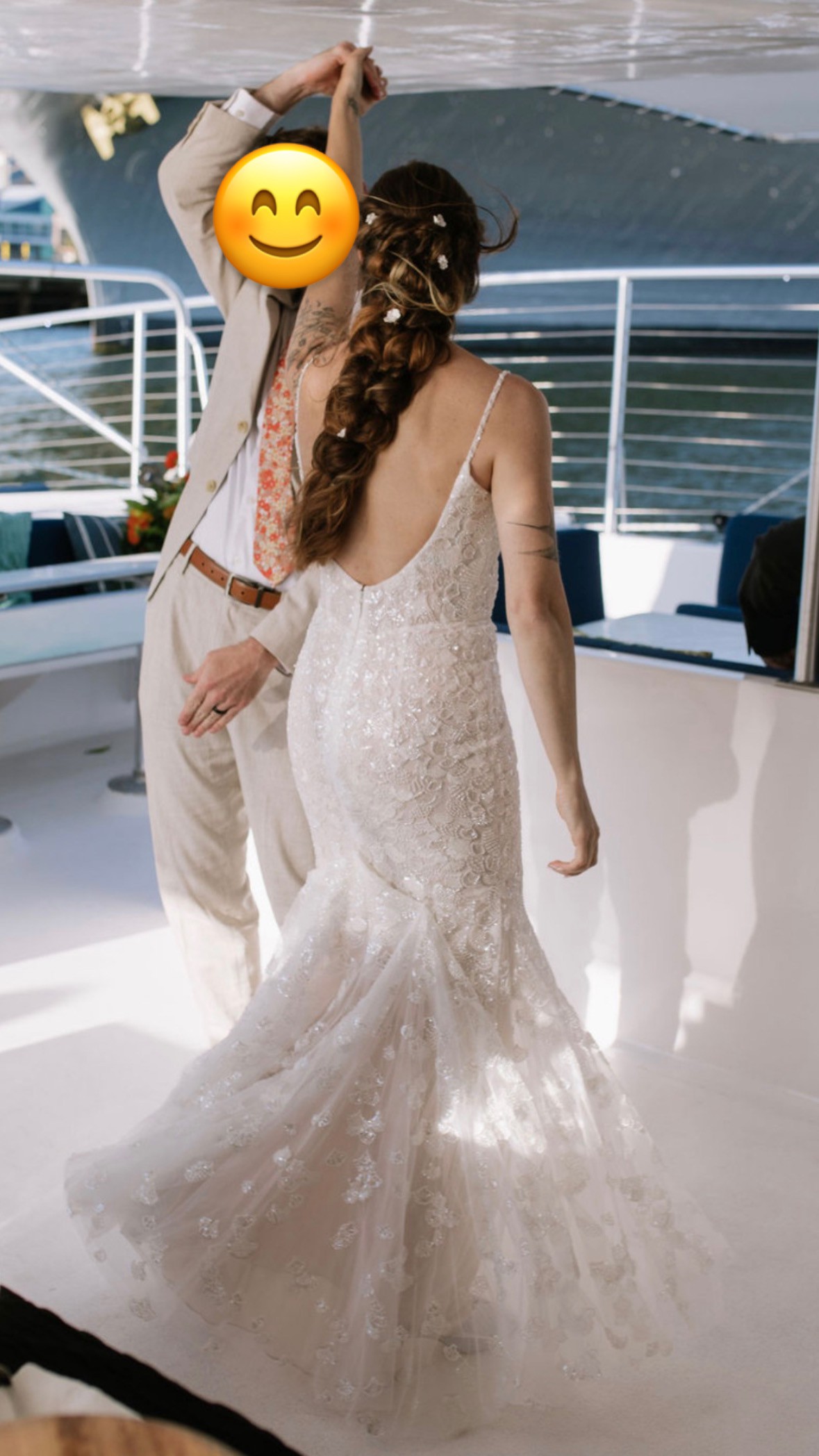 This is a one of a kind, custom Dany Tabet “Coral” dress that I ordered directly from the designer via Everly Bridal in Vancouver, Canada. The base style is Coral, with a bodice pattern swap to the designer’s “Albany” design. I added a basque waist and lowered the back, and made the straps beaded lace to match the rest of the dress. It is a split size gown: Bust: 4, Waist: 6, Hips: 4. There is a light nude liner from the waist down. Only minor alterations were made as listed below. Minor wear from being worn once on my wedding day also listed below. I tried on dozens of gowns and ultimately decided to be 100% happy I needed to create my own! It was perfect for me, and I would love for it to get lots more wear by all the other stunning mermaid brides out there! I welcome questions and will consider offers, as sustainability is a core ethos for me and the one time use of so many wedding related items including dresses was difficult to navigate in my own wedding planning journey. The retail price below does not include alterations, customs fees, or dry cleaning. I spent $4425 on this gown.