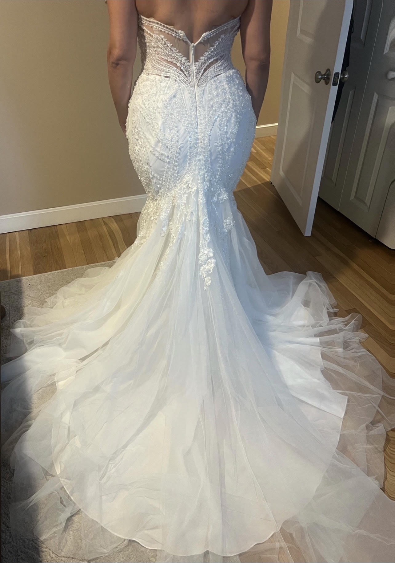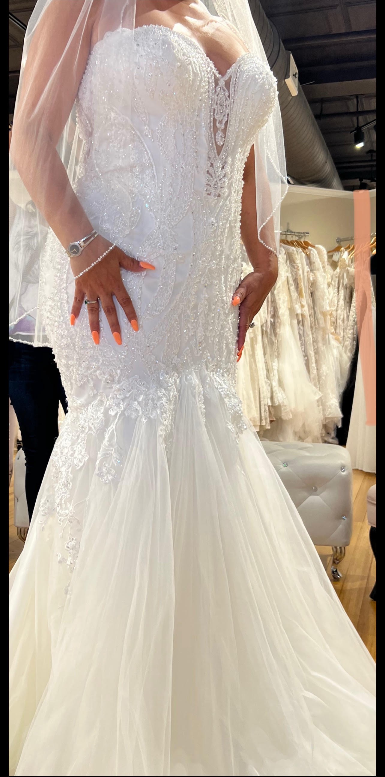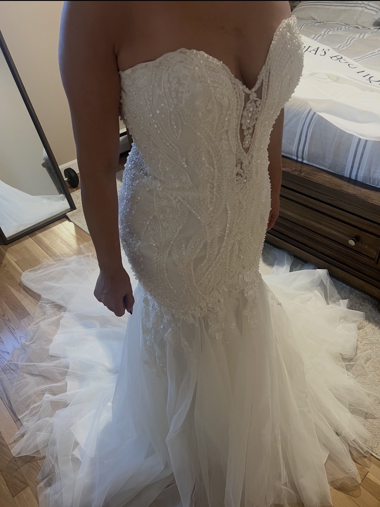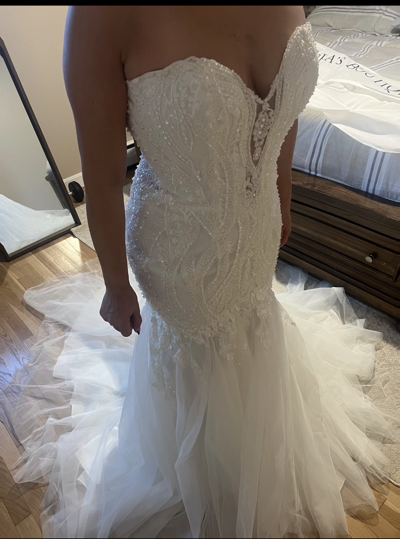 This custom-made wedding dress is a breathtaking embodiment of elegance and personal style. Designed in a striking mermaid silhouette, it gently hugs your curves before flaring out beautifully at the knees, ensuring a captivating presence as you walk down the aisle. The sweetheart neckline adds a romantic touch, perfectly framing your décolletage and enhancing your natural beauty, while the strapless design allows for effortless movement.