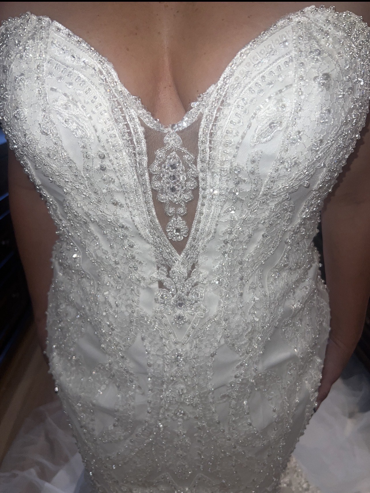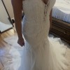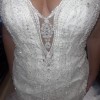 Crafted for a size 18, this floor-length gown features exquisite beading that shimmers with every step, catching the light in a dazzling display. The low back offers an alluring twist, striking the perfect balance between sophistication and allure. Imagine the way this dress will flow around you, creating unforgettable memories on your special day.