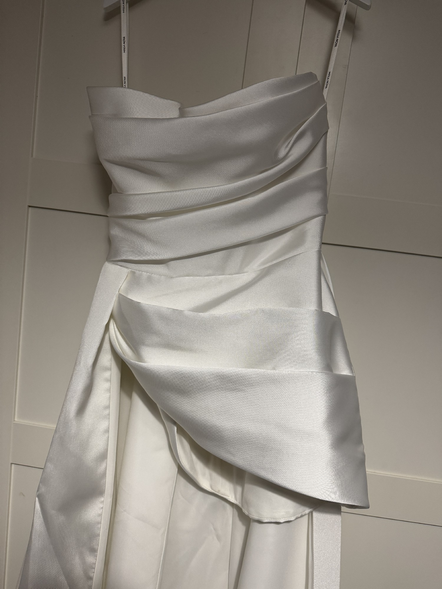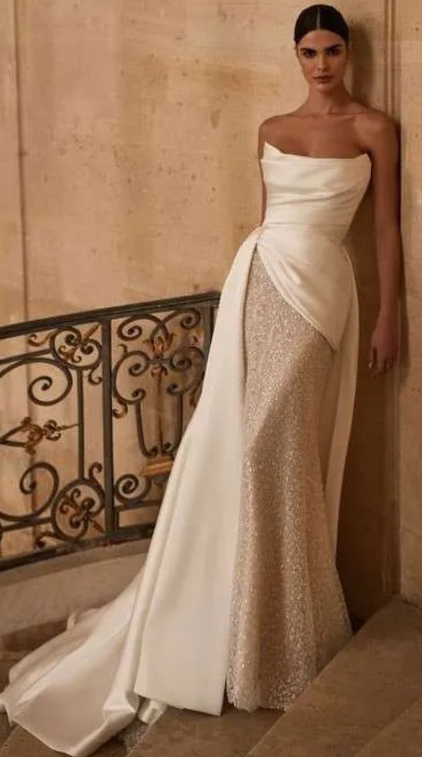 A striking ivory satin/mikado cover overdress designed to be worn over a wedding gown. Featuring a hand-draped bodice, an asymmetrical mini-skirt, and a dramatic long train, the Mercedes adds instant couture impact and elegance to any bridal look. Perfect for creating a layered, fashion-forward ceremony or photo moment.