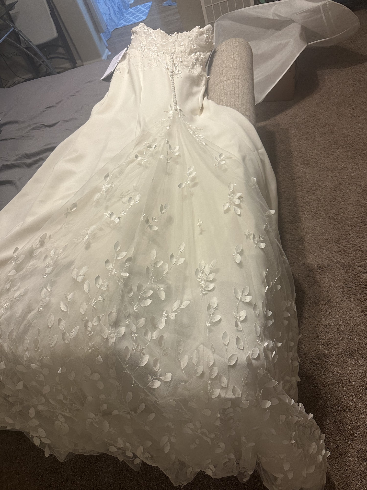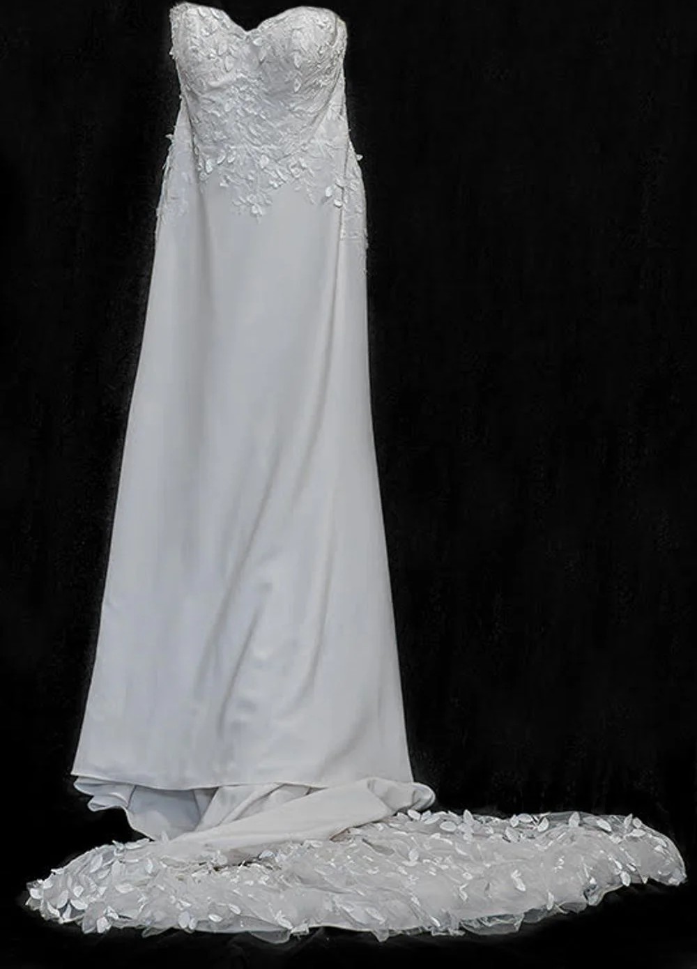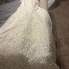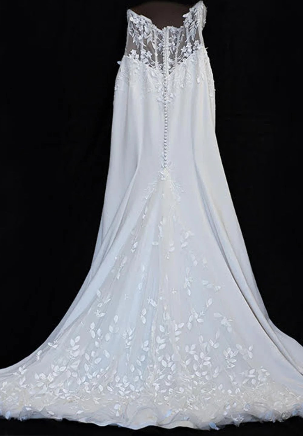 Never worn, never altered. Purchased but never used because I decided to go with a different dress. This gown is romance at its finest-flattering sweetheart neckline, sheer bodice with delicate boning, and a curve-loving skirt that flows into the most breathtaking lace-trimmed train.