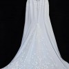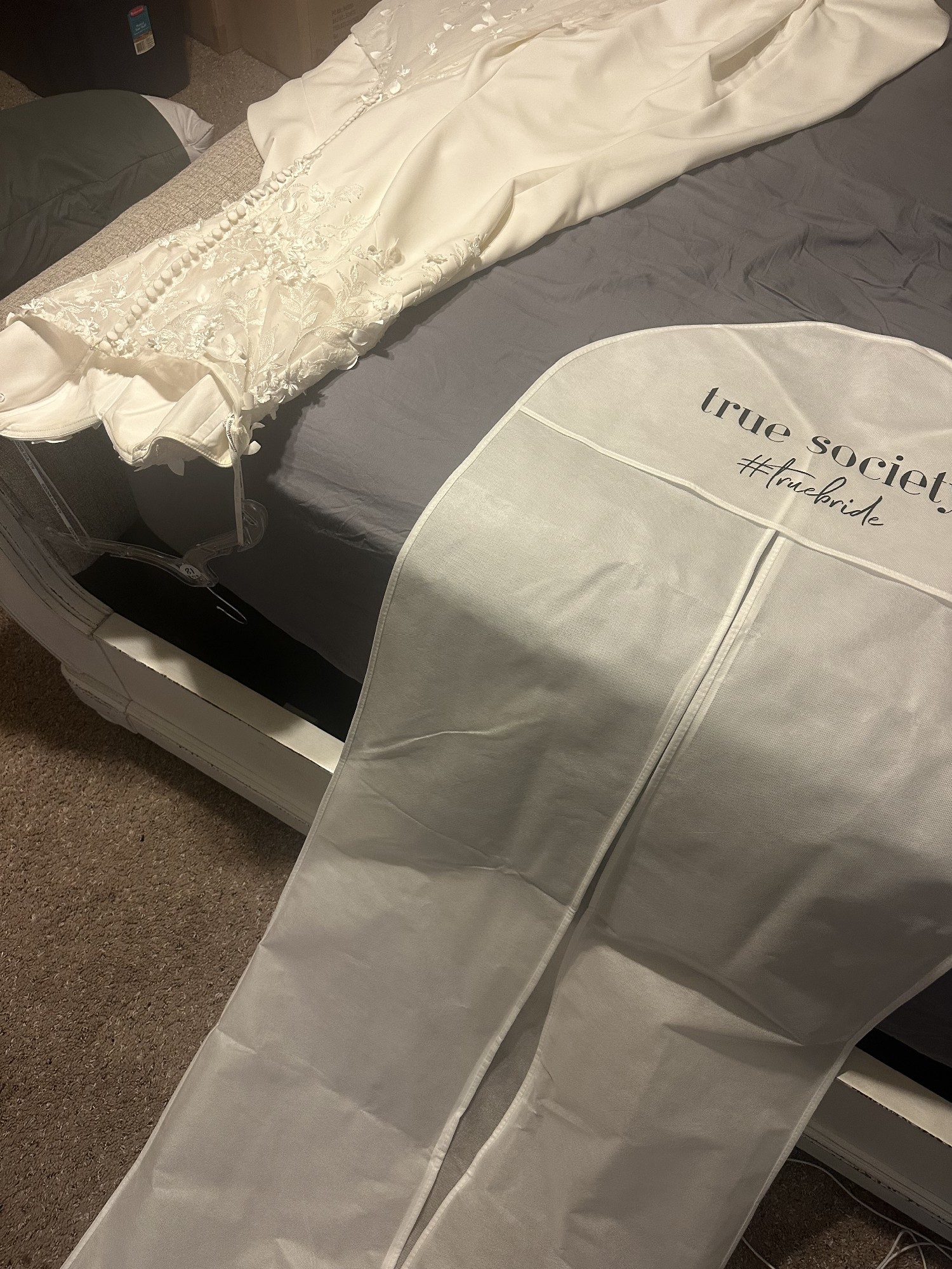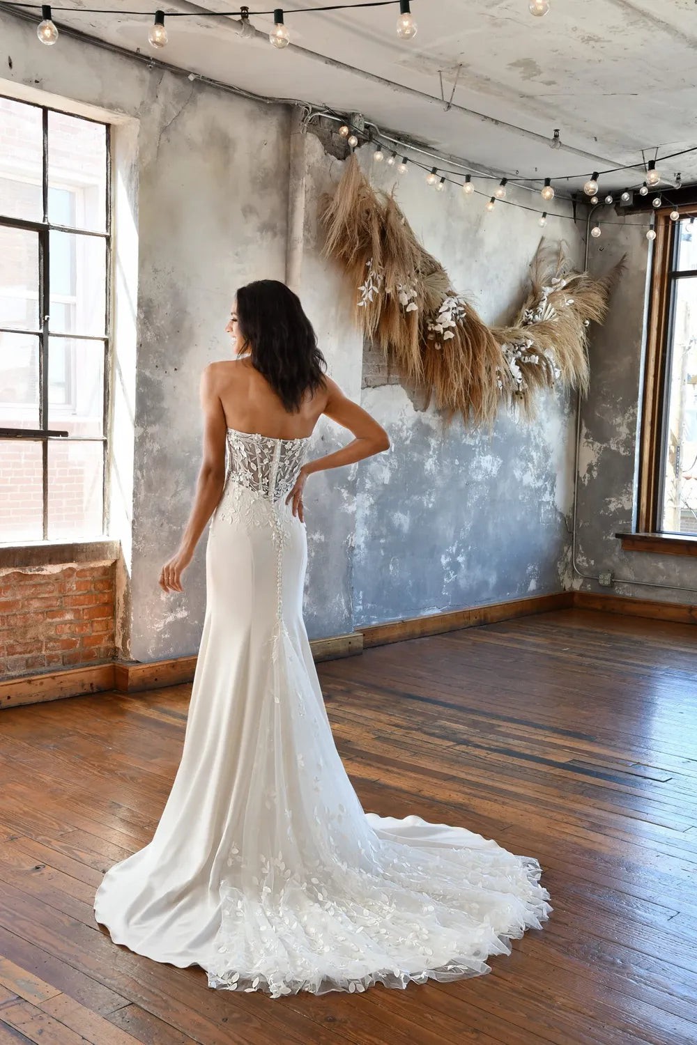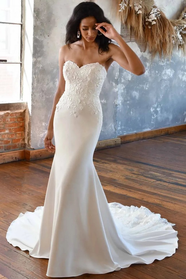 Never worn, never altered. Purchased but never used because I decided to go with a different dress. This gown is romance at its finest-flattering sweetheart neckline, sheer bodice with delicate boning, and a curve-loving skirt that flows into the most breathtaking lace-trimmed train.