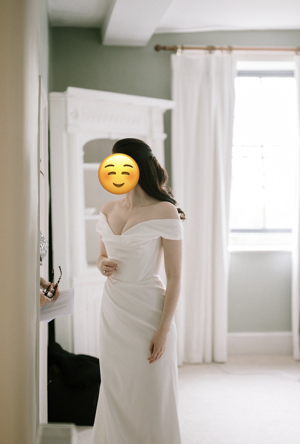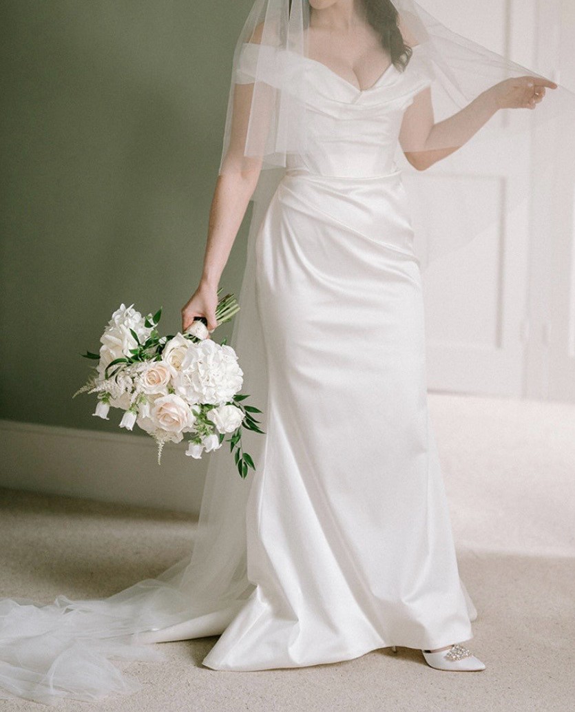 For reference, my measurements align closely with a Vivienne Westwood size 10, but I chose a size 12 skirt to achieve a softer, more forgiving draped silhouette rather than a tighter fit. The skirt can easily be altered to a full UK 10 if desired, making this an ideal alterable wedding dress. I am 5’4.5” tall and wore 2.5-inch heels on the day.
