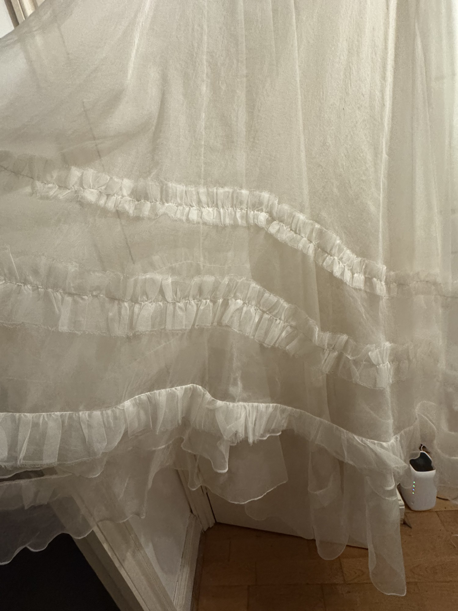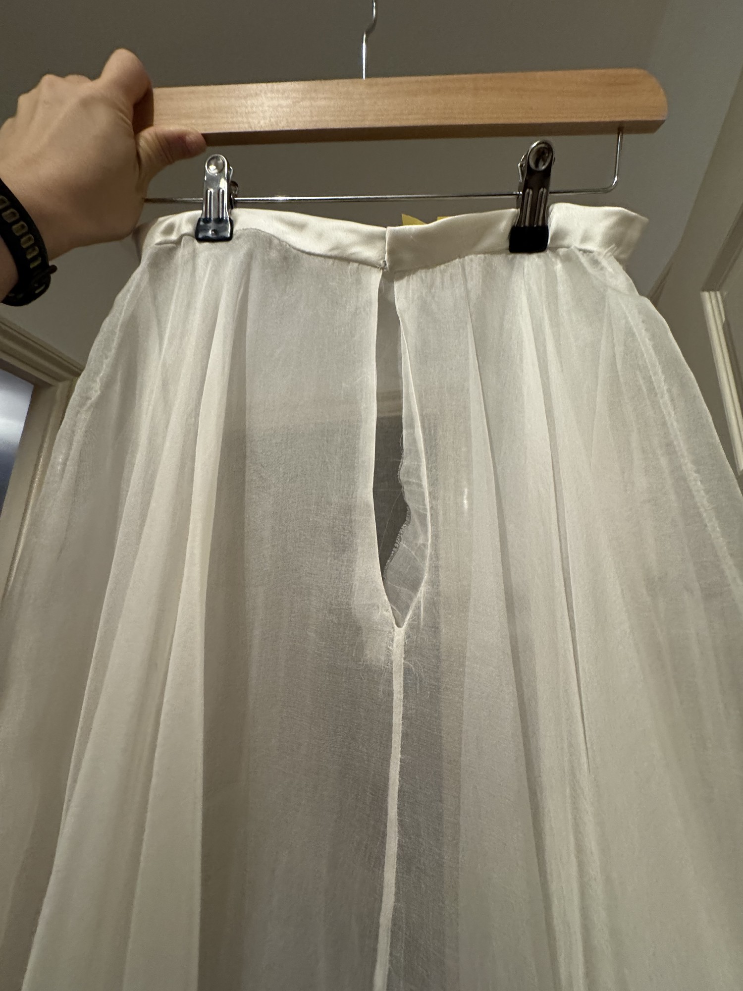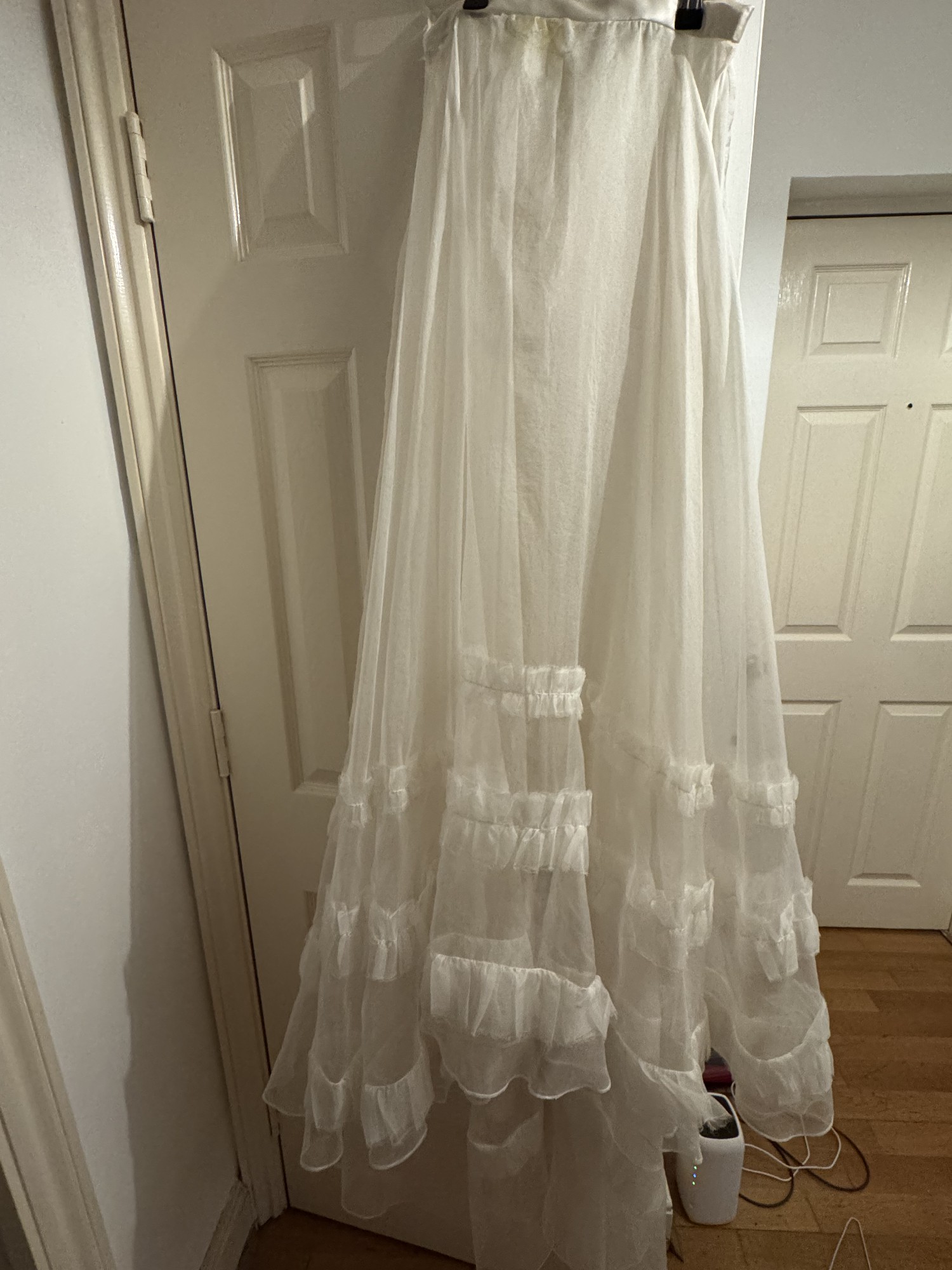 Dress has been dry cleaned a few weeks after the wedding. There is one minor tear, which I point out but a wedding alterations person can fix easily (happy to share recs from London). I got it shortened for my height by a Halfpenny recommended tailor to ensure the three layers of ruffles were maintained with a bit of headroom before the bottom.