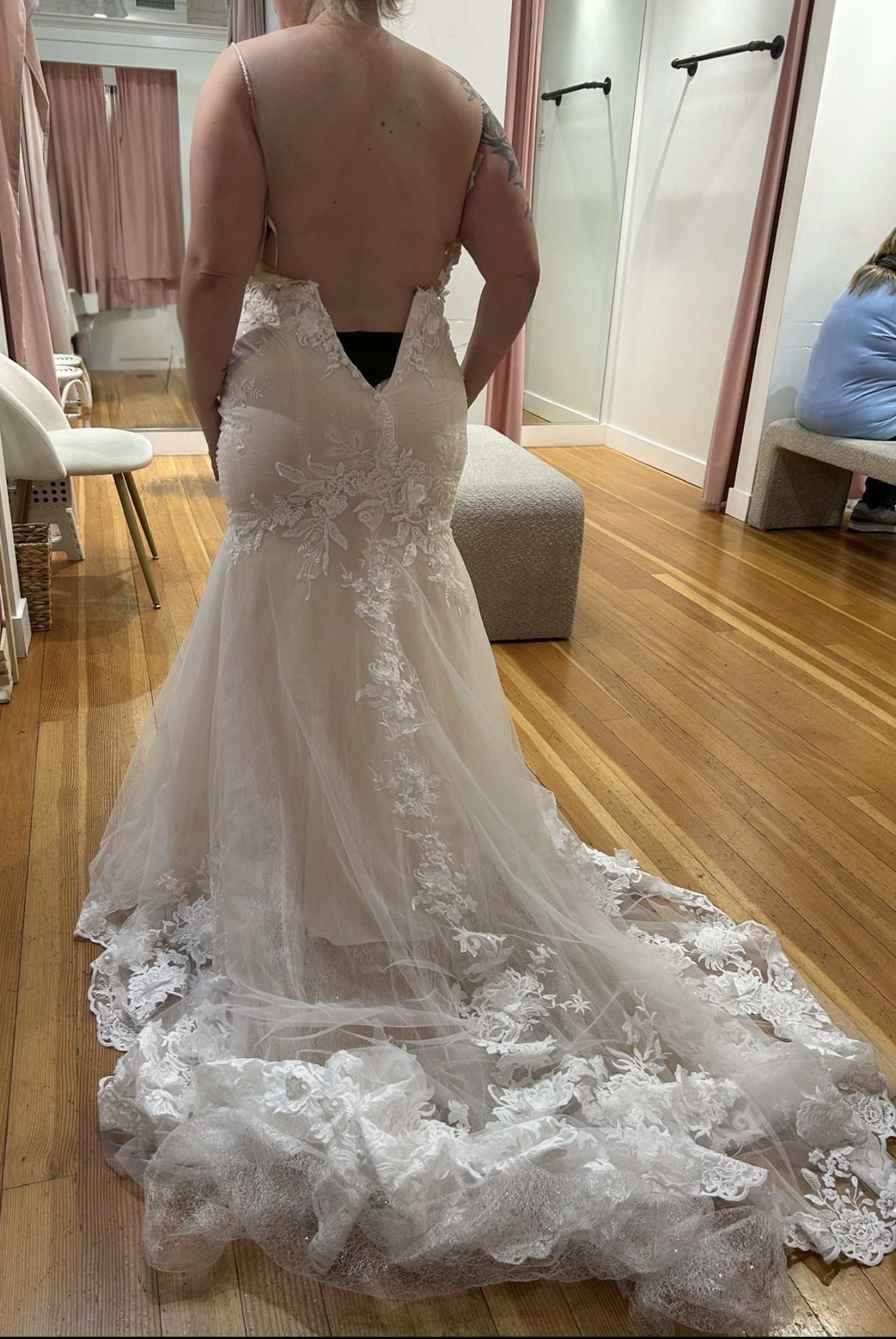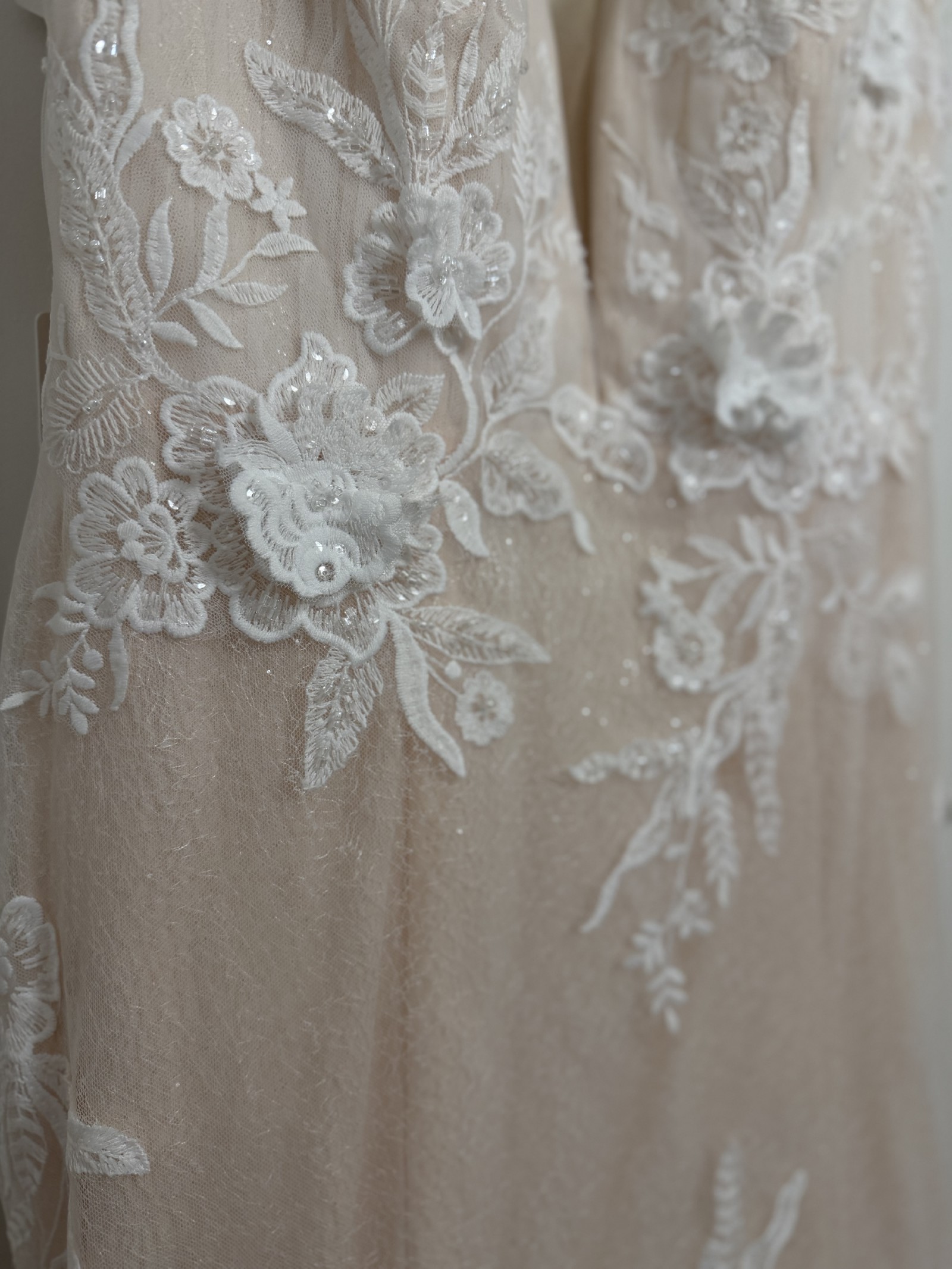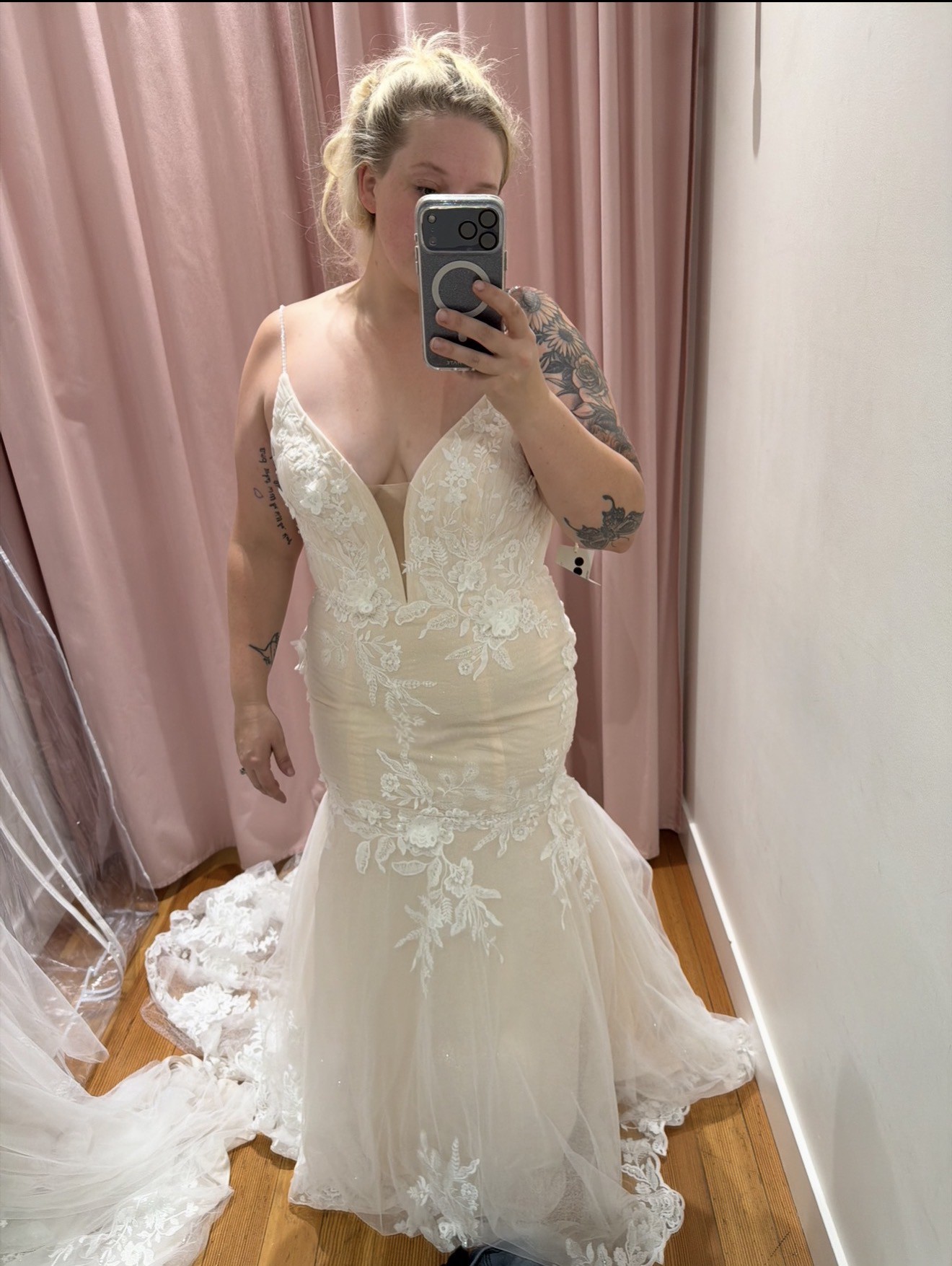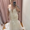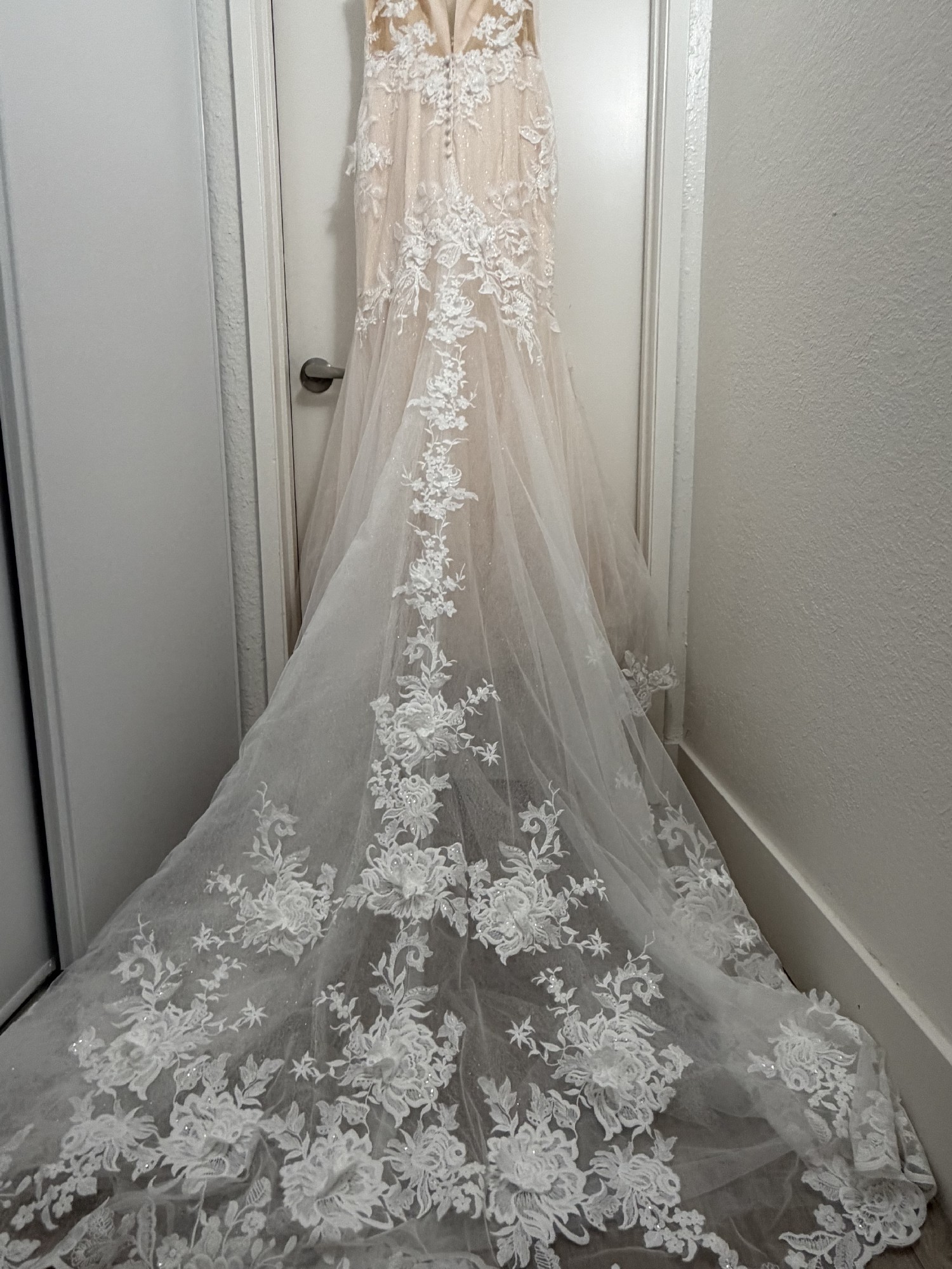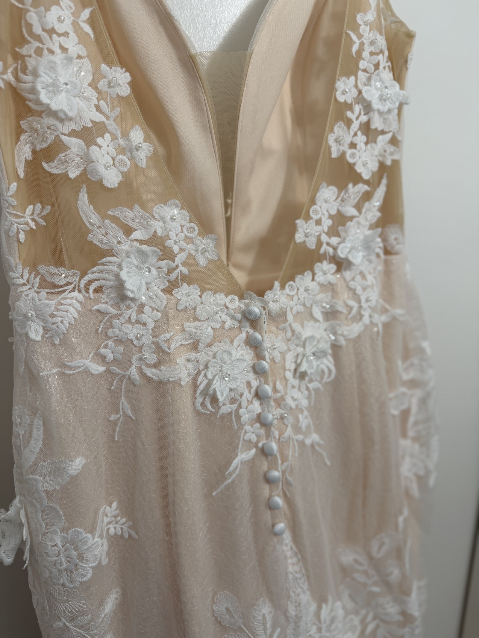 The dress is incredibly flattering and comfortable, with stunning detail throughout. I absolutely fell in love with the Chantilly lace and floral appliqués. I’m happy to provide additional photos, measurements, or answer any questions. I purchased this dress in a size 12 (I’m a size 14) but decided to go another direction since I’m afraid I’ve ran out of time. (Classic mistake!) I’m heart broken I won’t be wearing this beauty on my wedding day.
