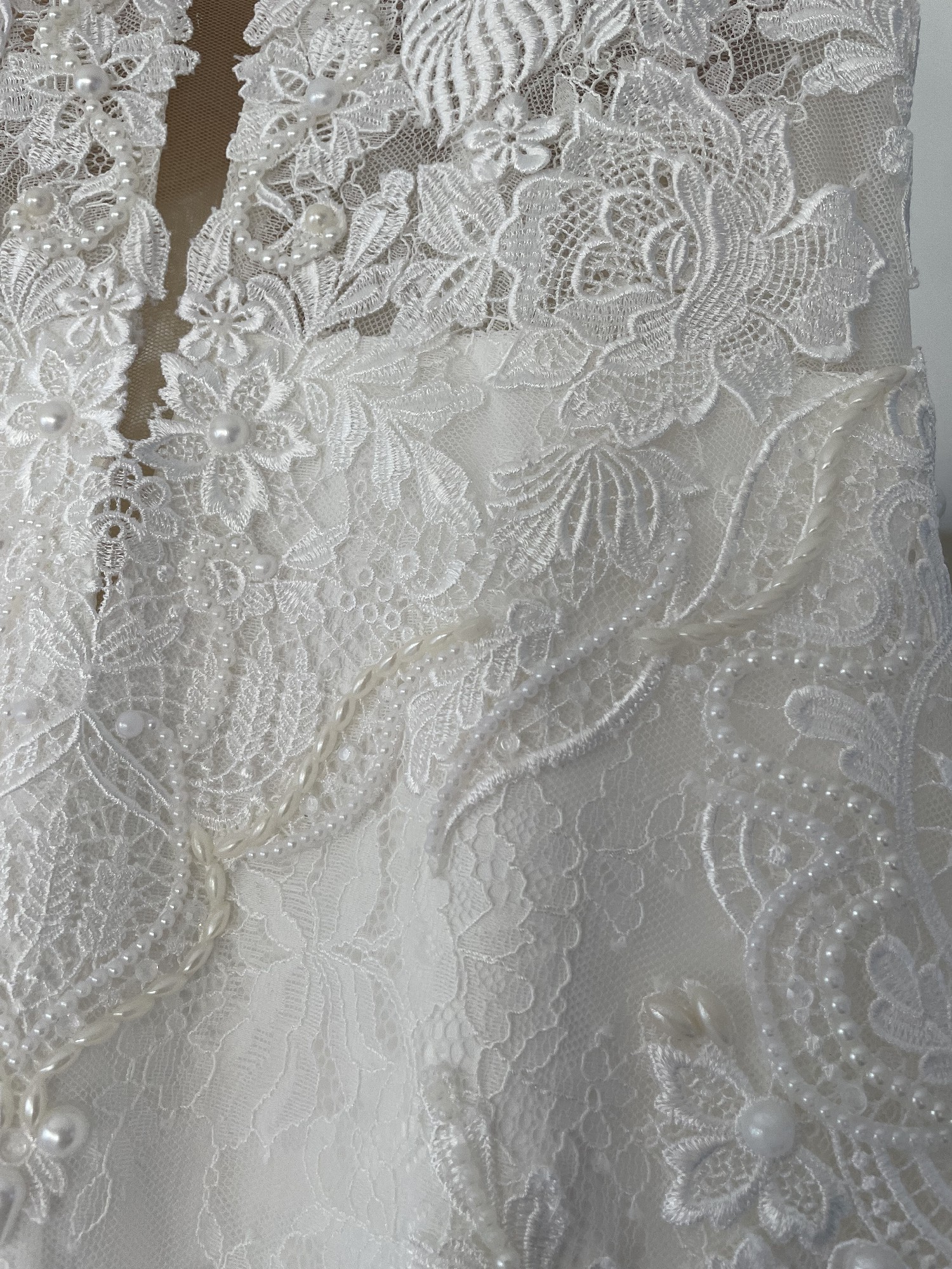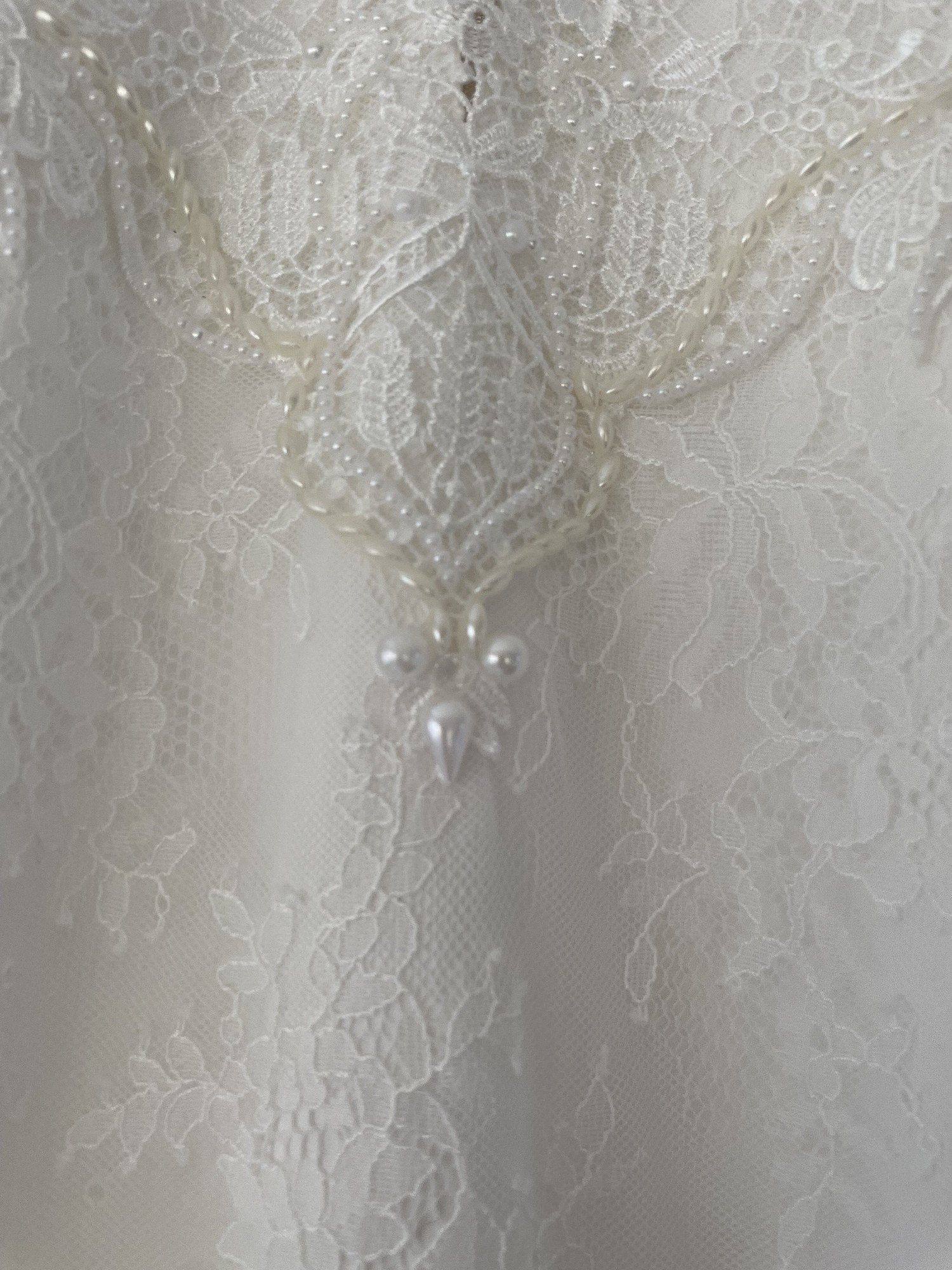 Ruched effect on the back. Exquisite beading and pearl detail on the dress