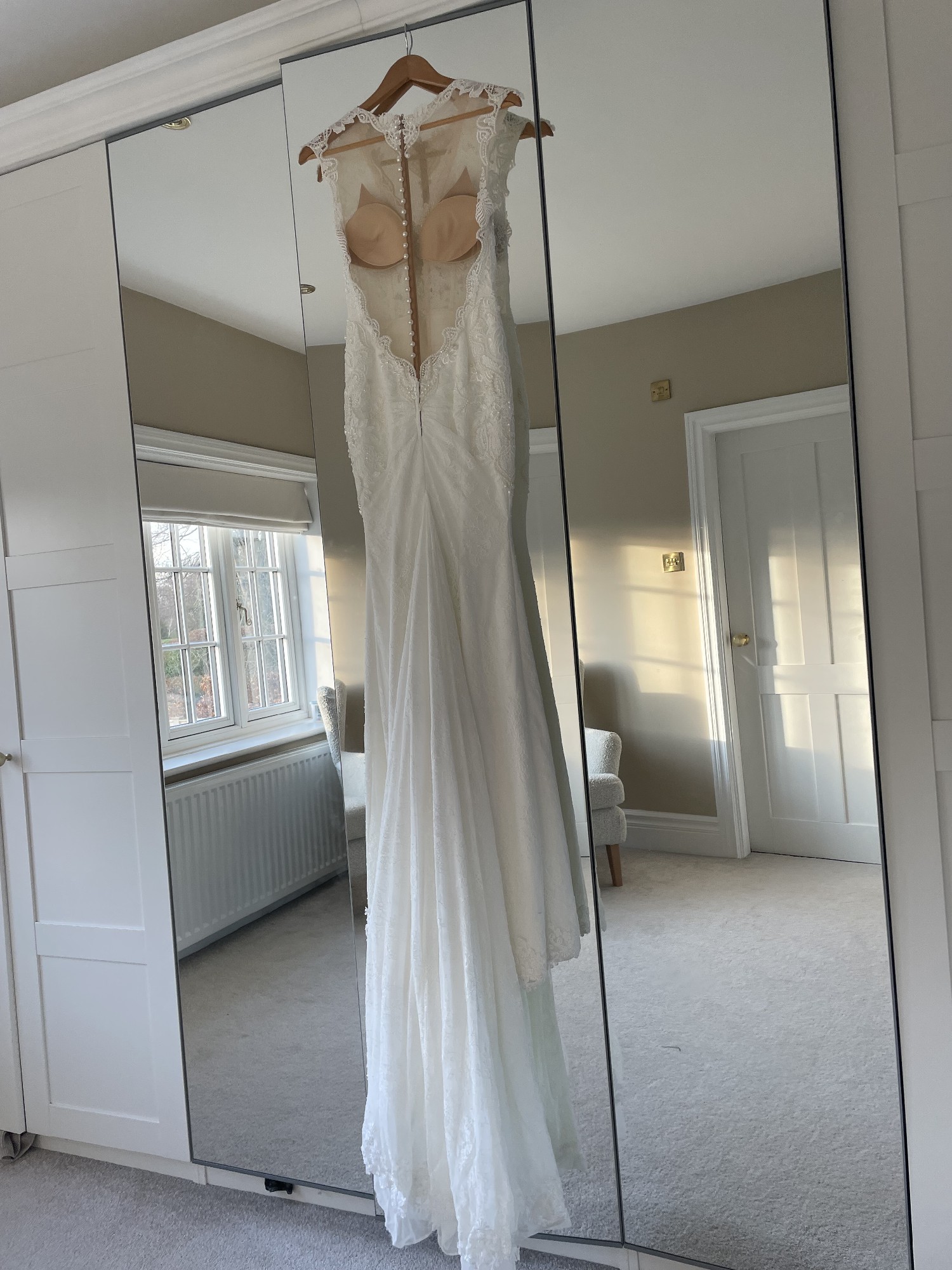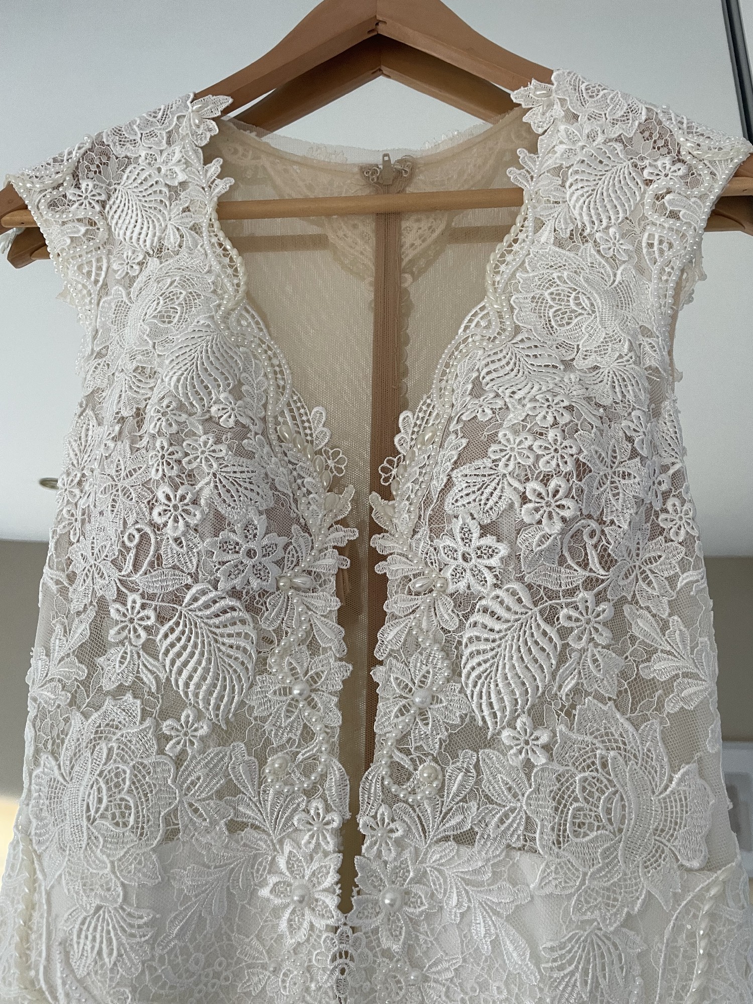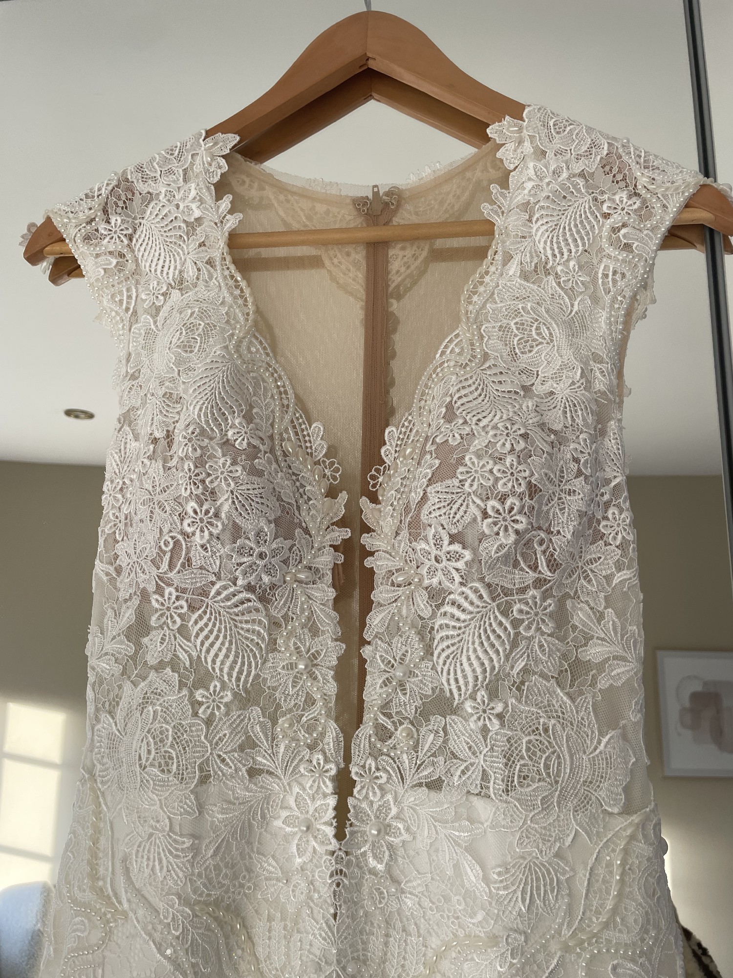 Fitted style (fits size 6/8) with altered padding so no need to wear a bra. Concealed zip back fastening with beautiful pearl button detail.
