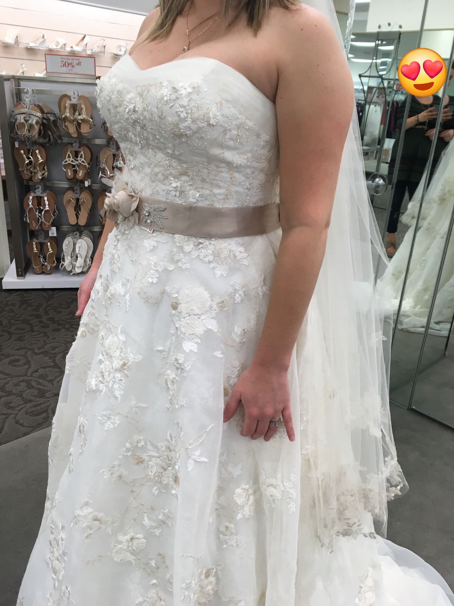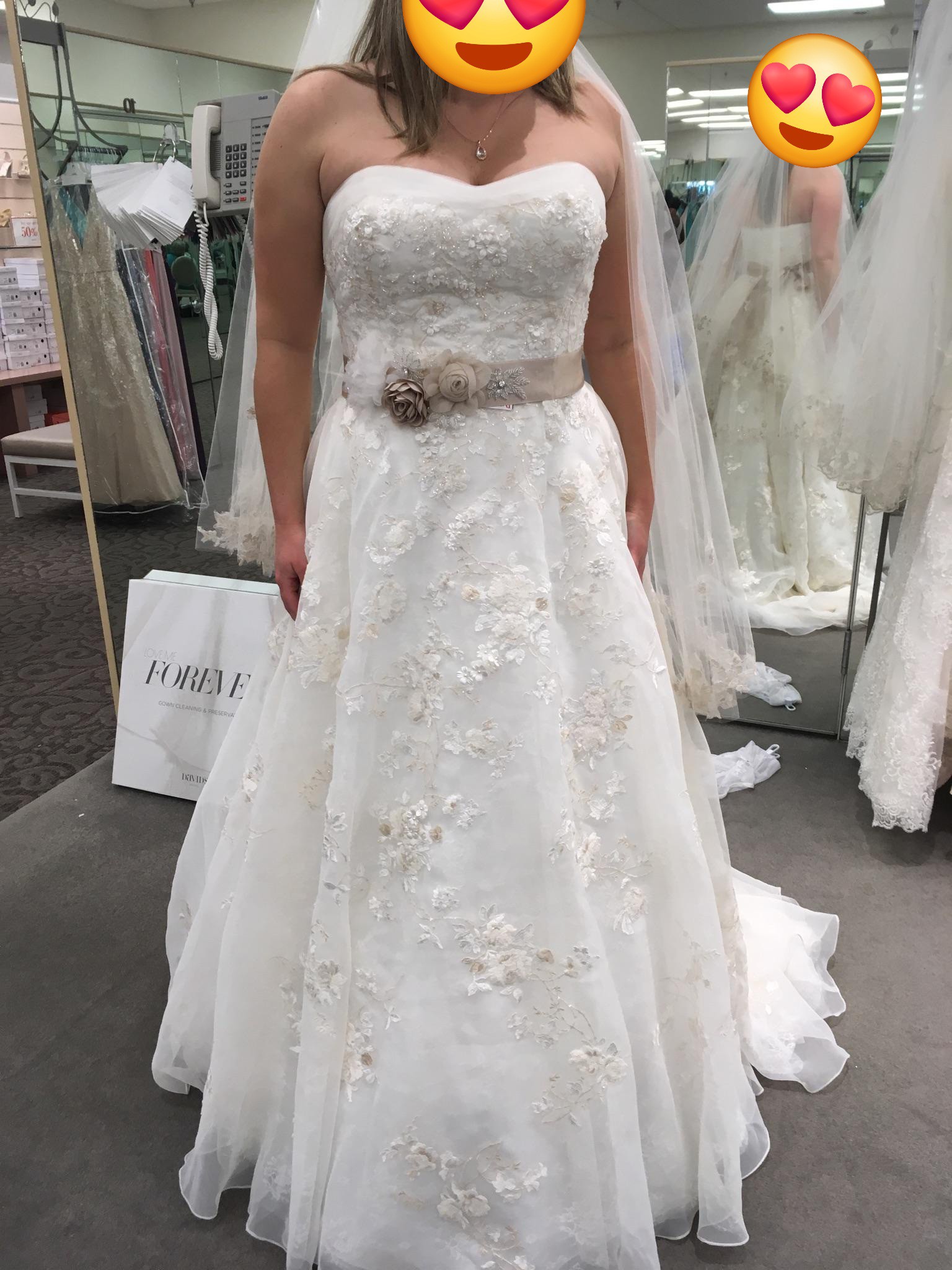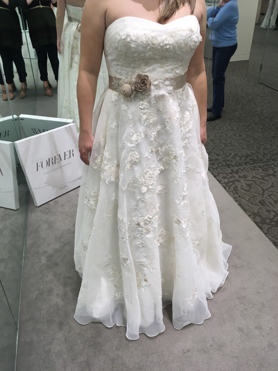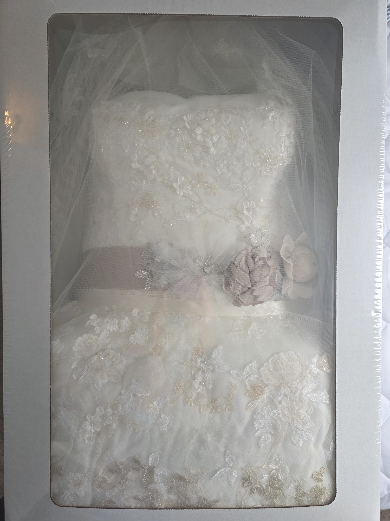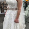 Worn once for a June 2018 wedding. Professionally cleaned and preserved and stored carefully since. No known snags, tears, or stains.