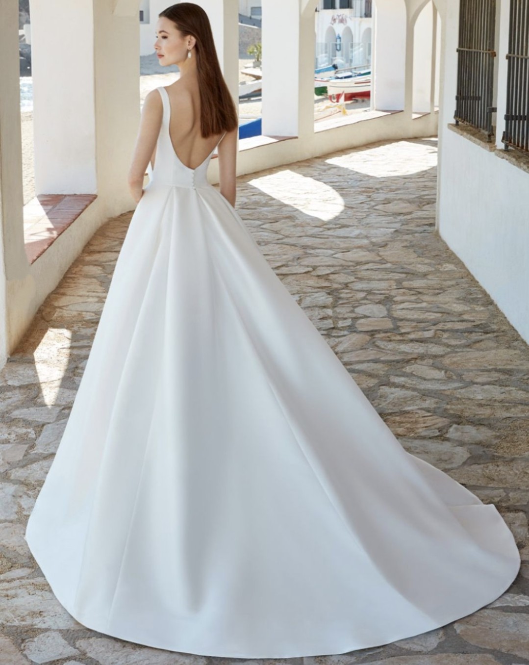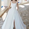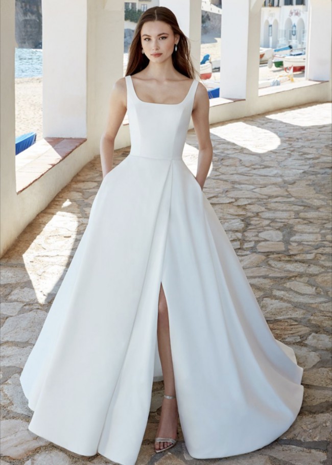 Simple yet elegant and made with luscious off-white Mikado satin. Bodice has sexy deep v sides, square neckline and deep scoop back. This dress has pockets and is very sexy with a sexy slit. Store sample not worn to any event.