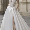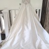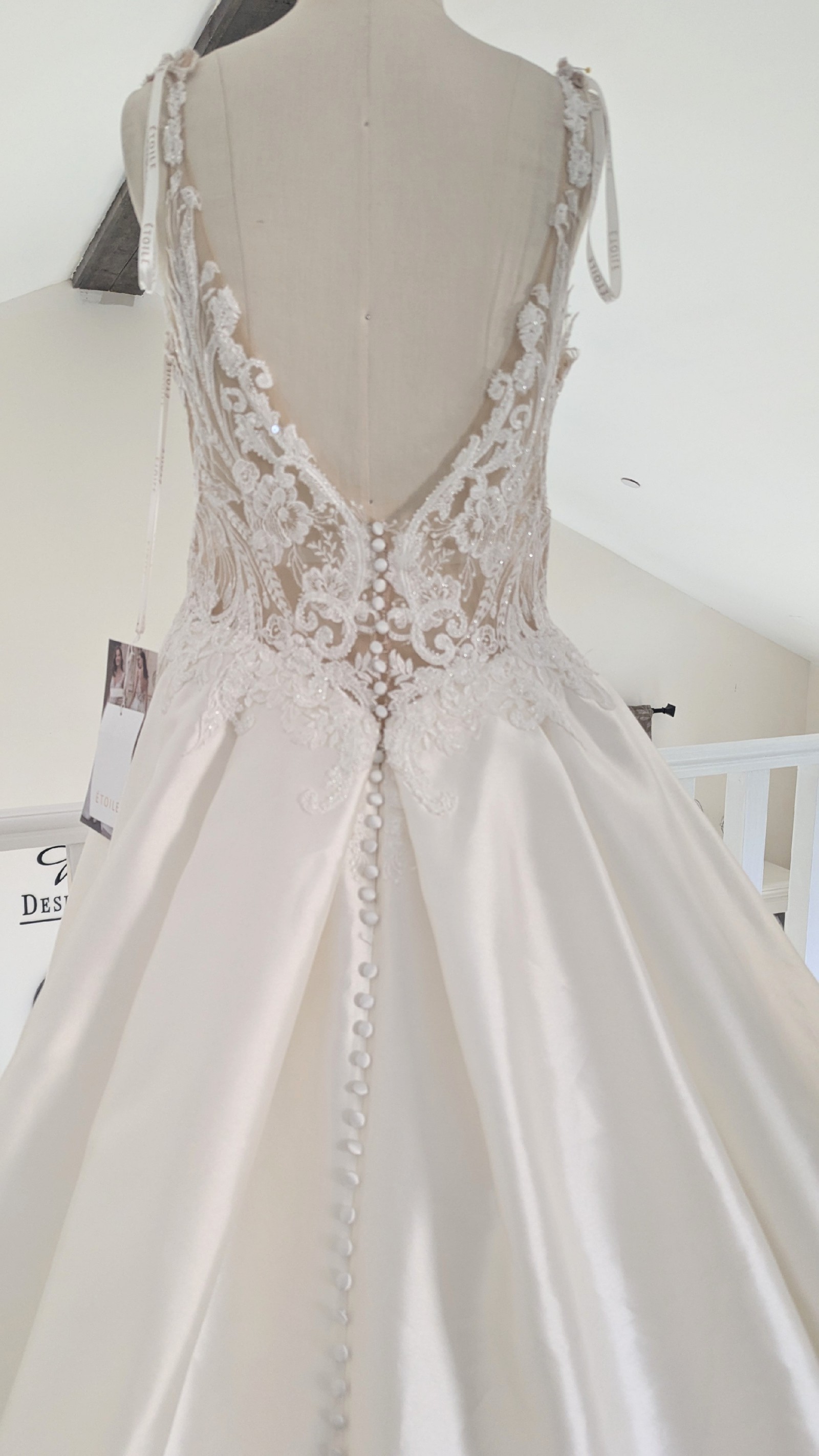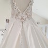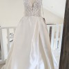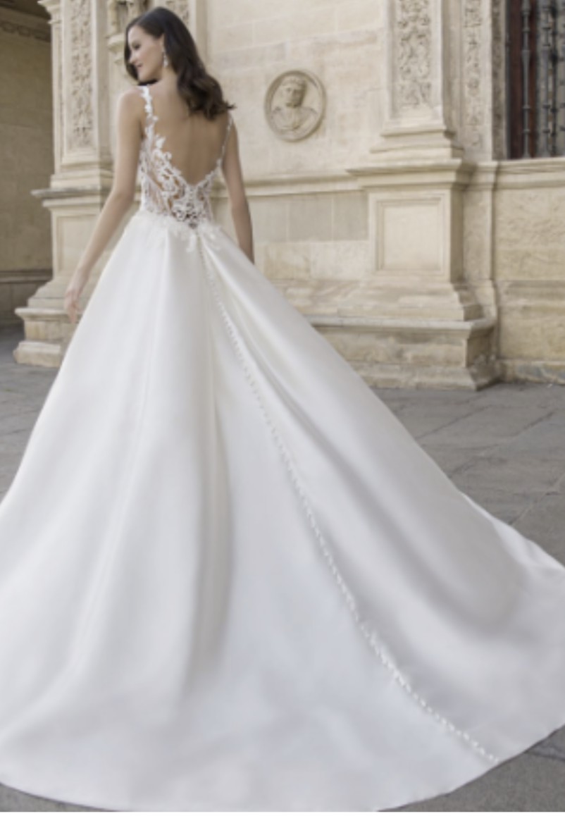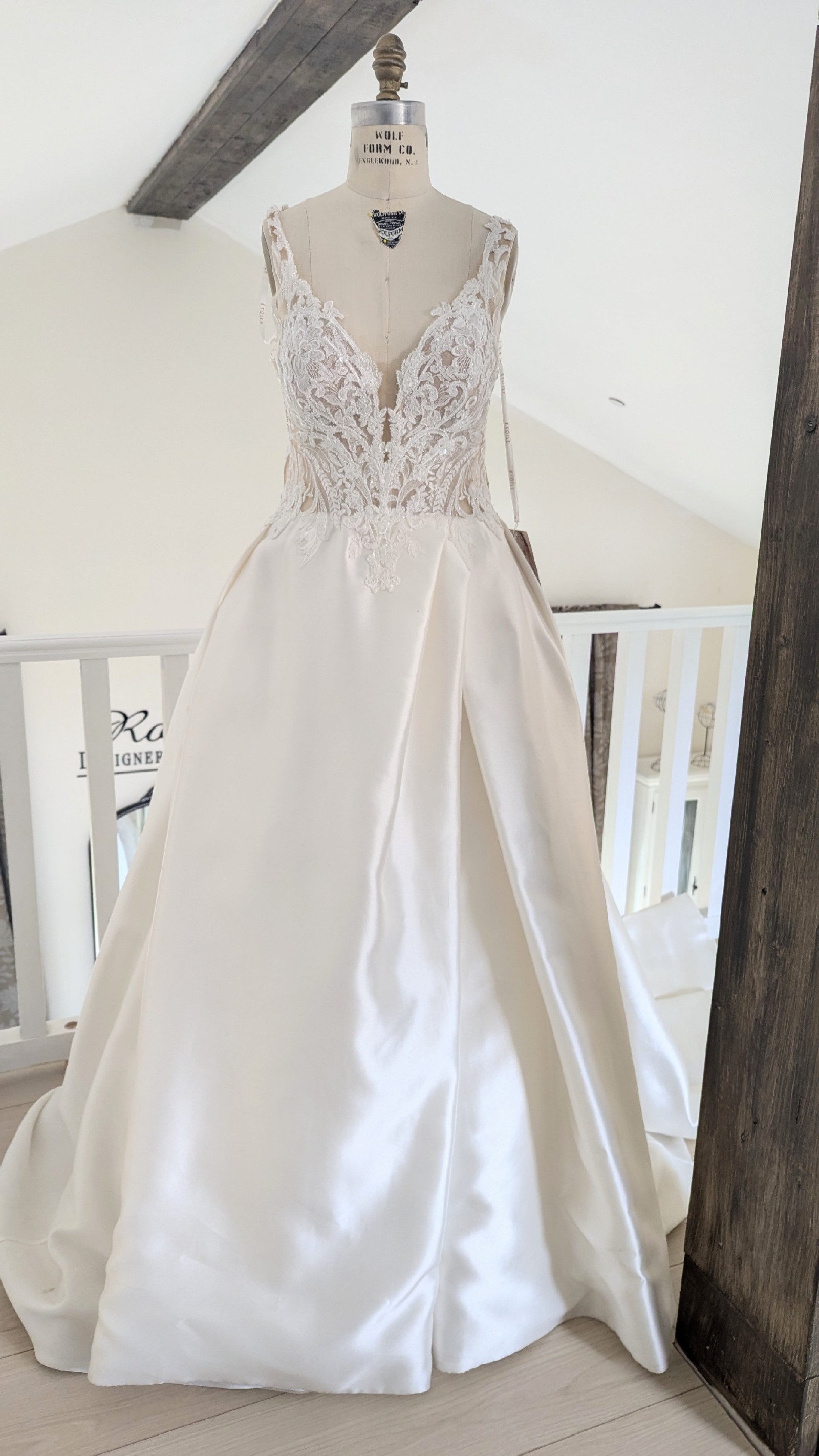 Beautiful dress in Mikado satin with an amazing lace bodice. Very feminine A-line skirt with side slit and button back detail all the way to the Hem. This dress has pockets. It's a store sample and never worn to any event.