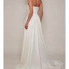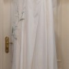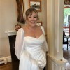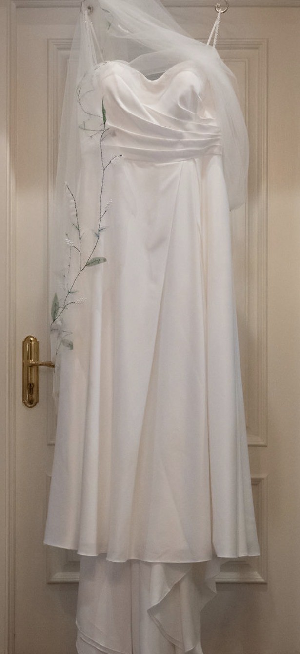 Timeless diamond white satin a-line wedding gown with pockets, detachable pearl straps & chiffon long sleeves, silk chiffon cape, and floral veil with green accents. Color is diamond white which is a light ivory. It is not a yellow ivory, it’s a very beautiful creamy white color. It has been dry cleaned and does NOT have any stains. Label size 18.