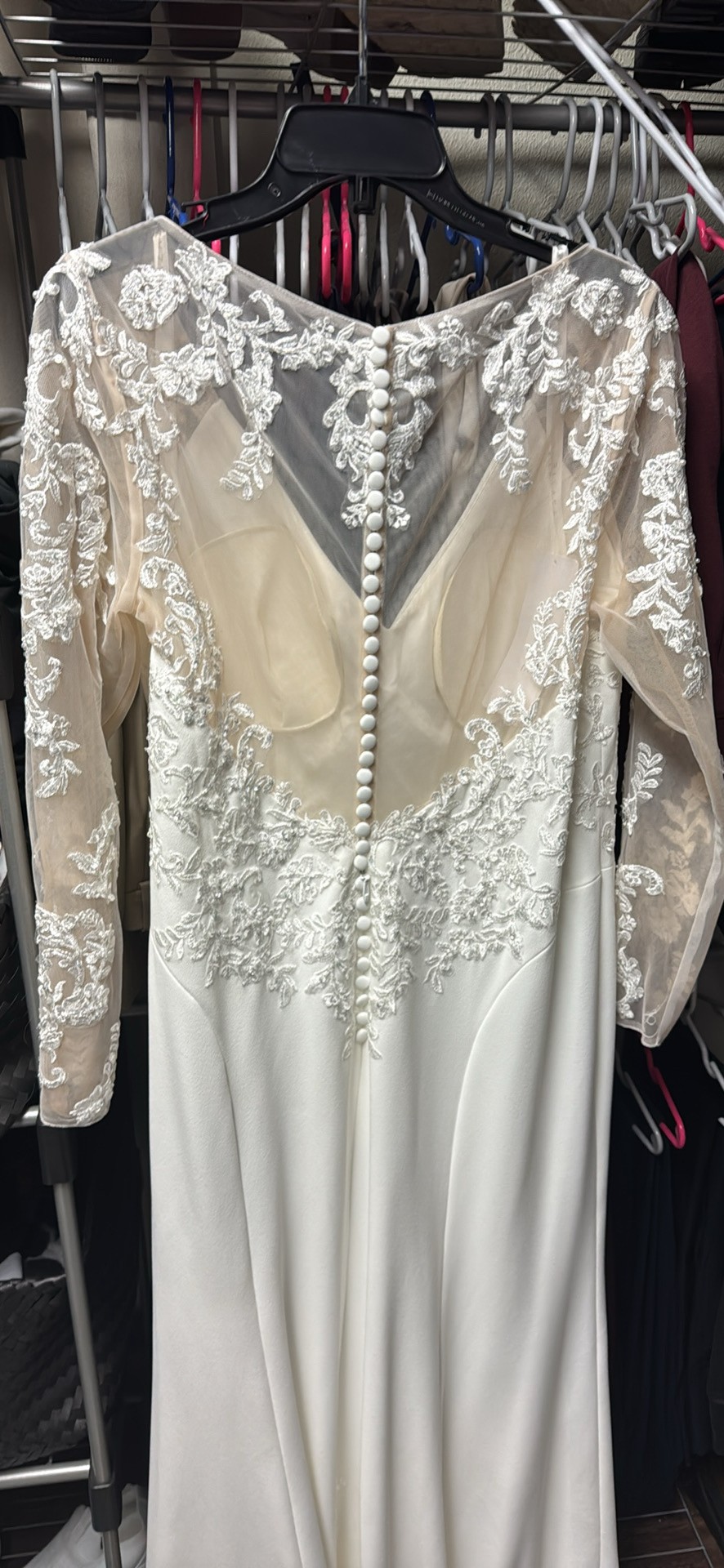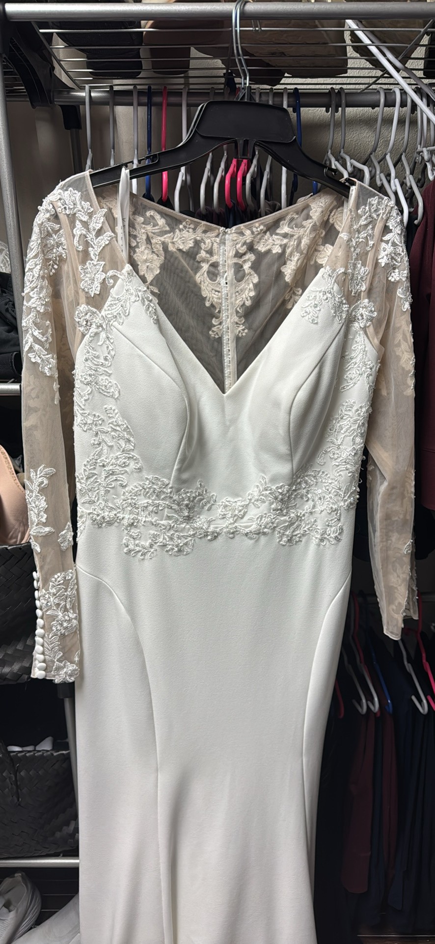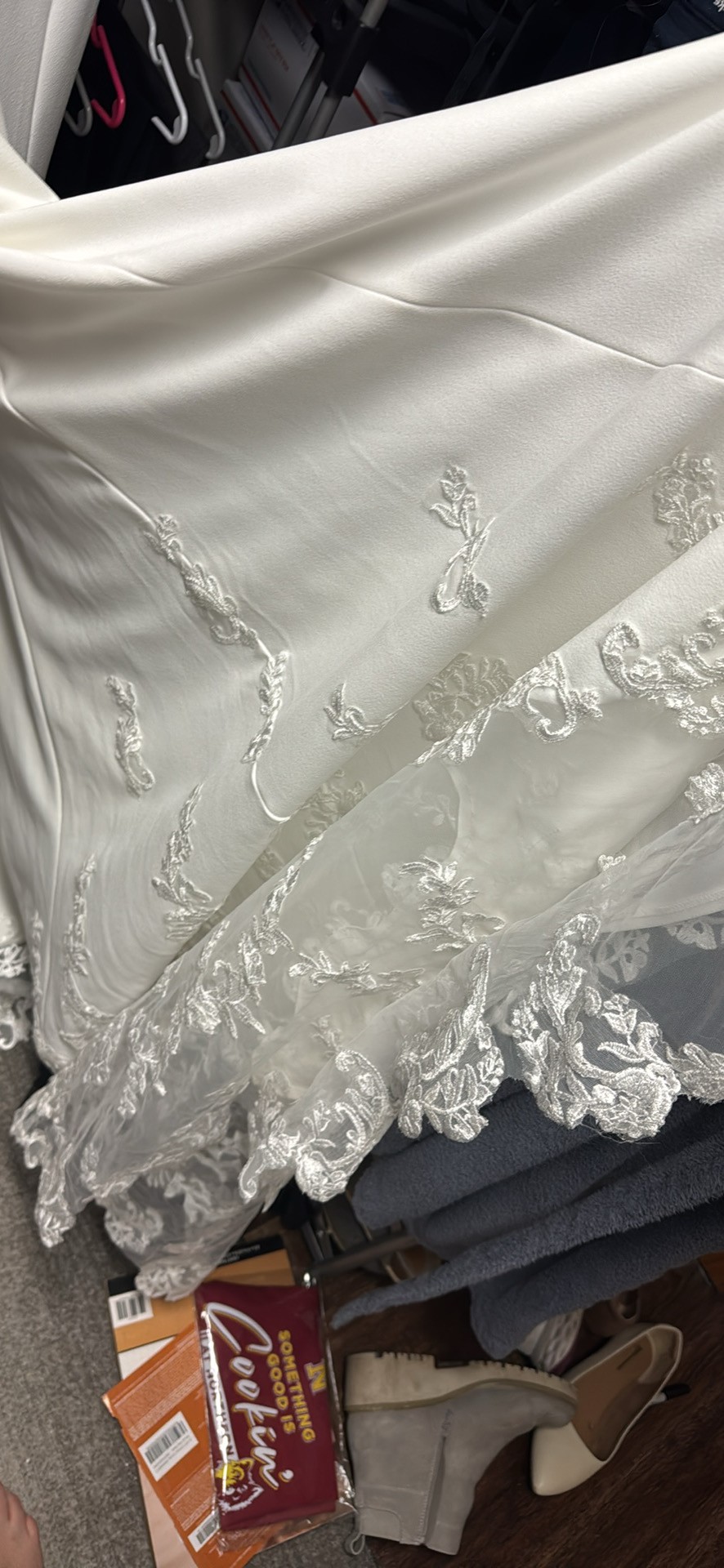 Wedding dress for sale. Beautiful train, beautiful dress. Never worn, never altered, only tried on. Size 18. Specifics can be found at the link below.