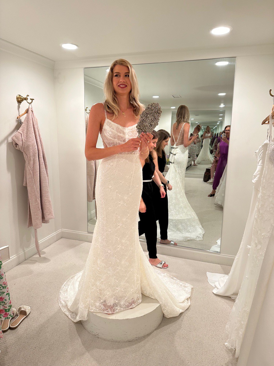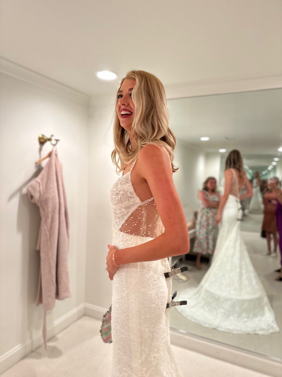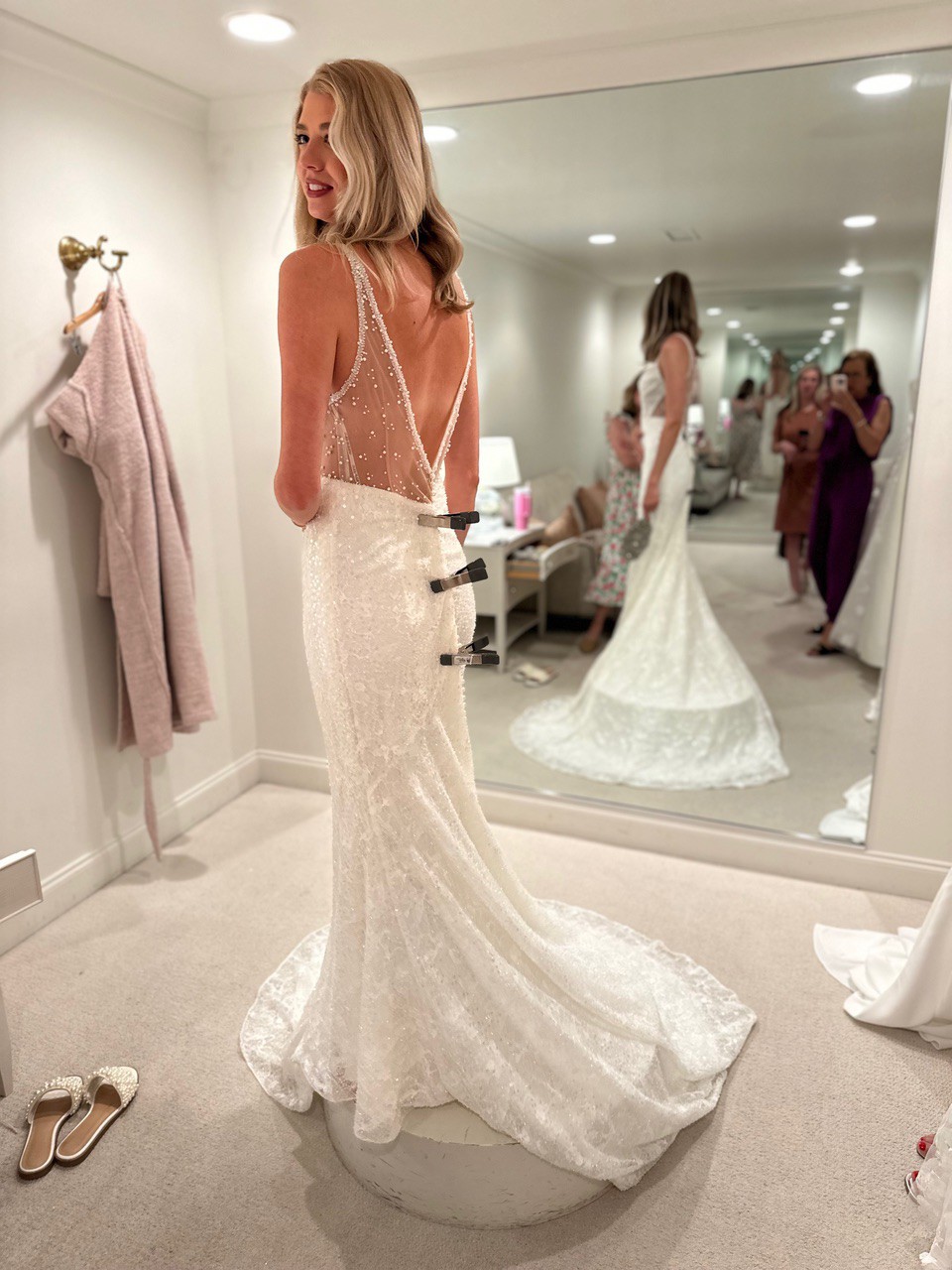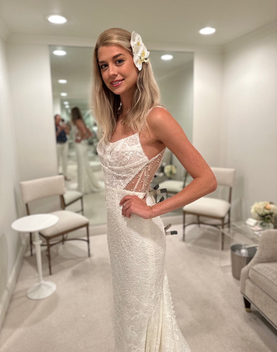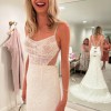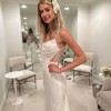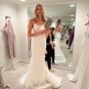 Never worn, new with tags wedding dress from Martina Liana in a split size: Size 4 for the bust; and Size 8 for the waist and hips. 49 inches extra were added to the hem. The dress comes with the original garment bag and tags. The dress has never been worn or altered. It is brand new.