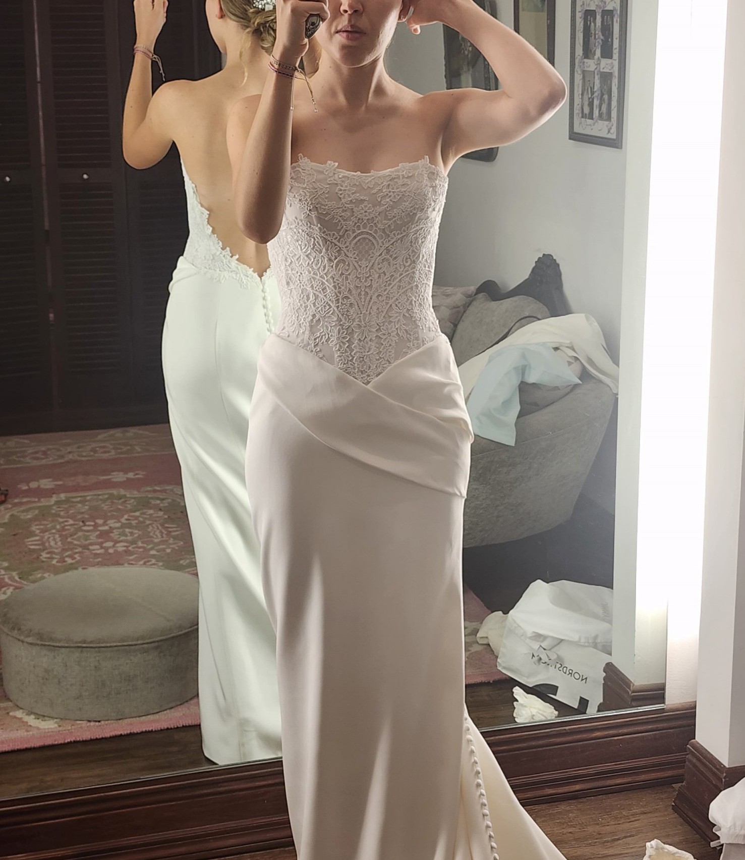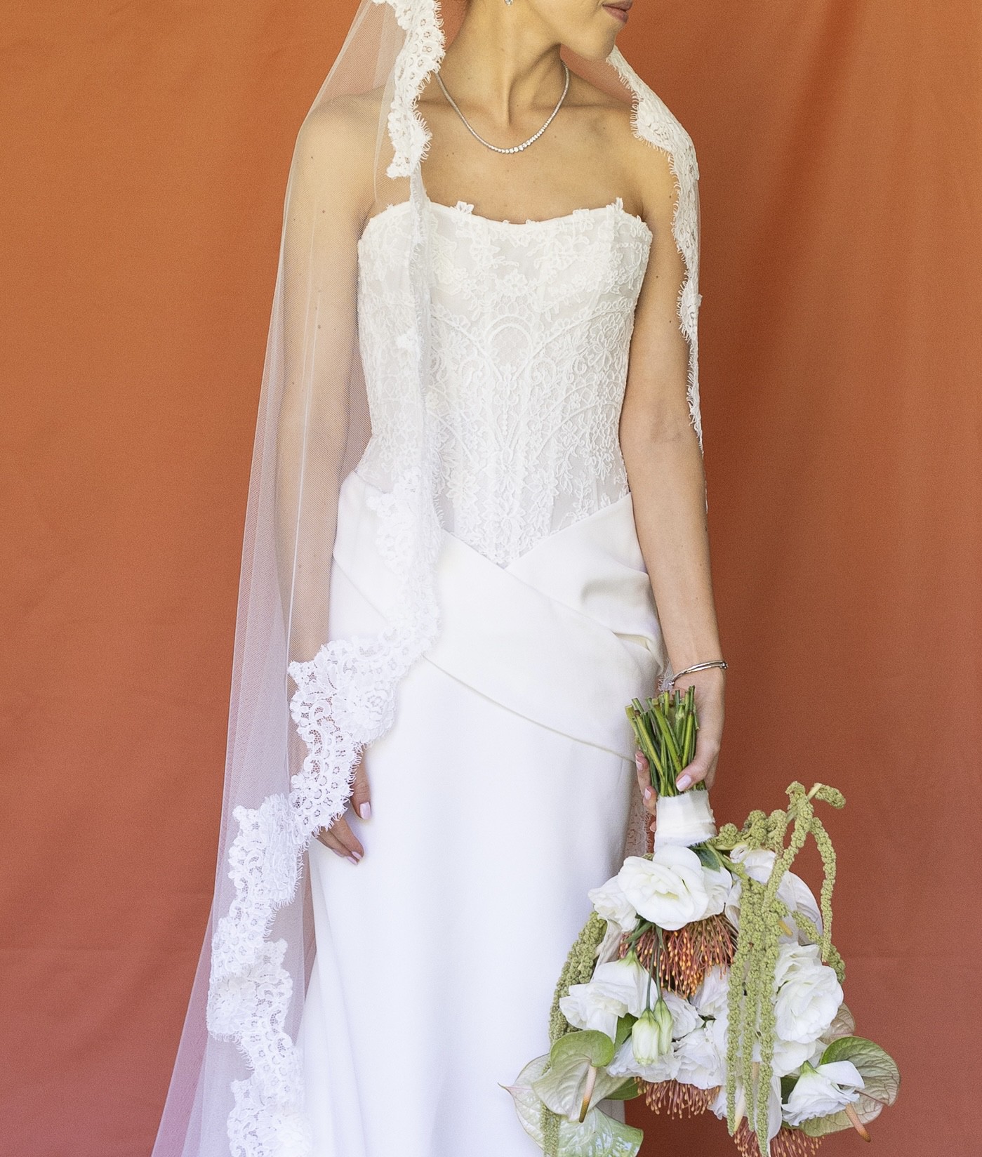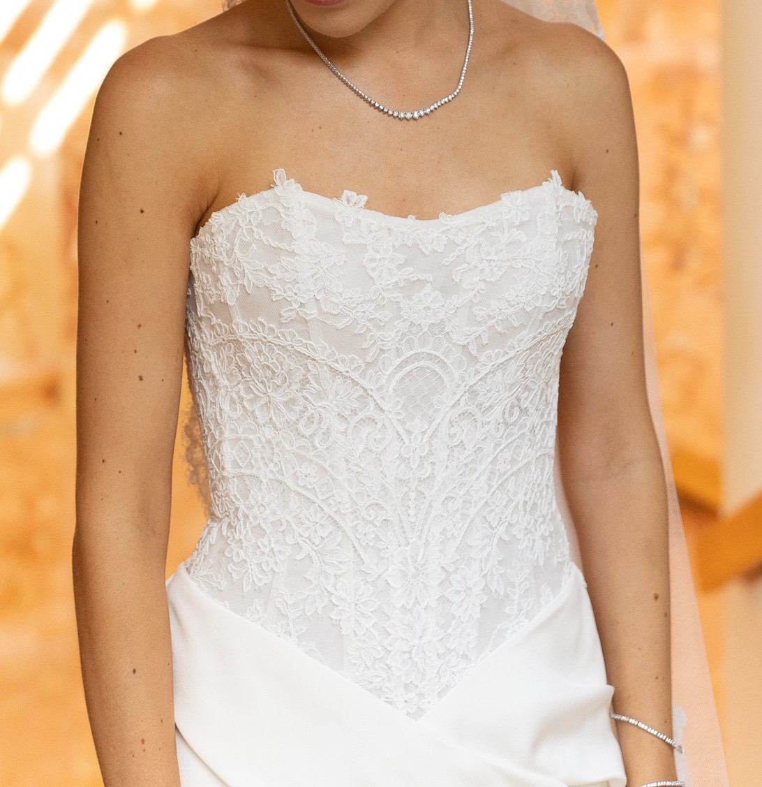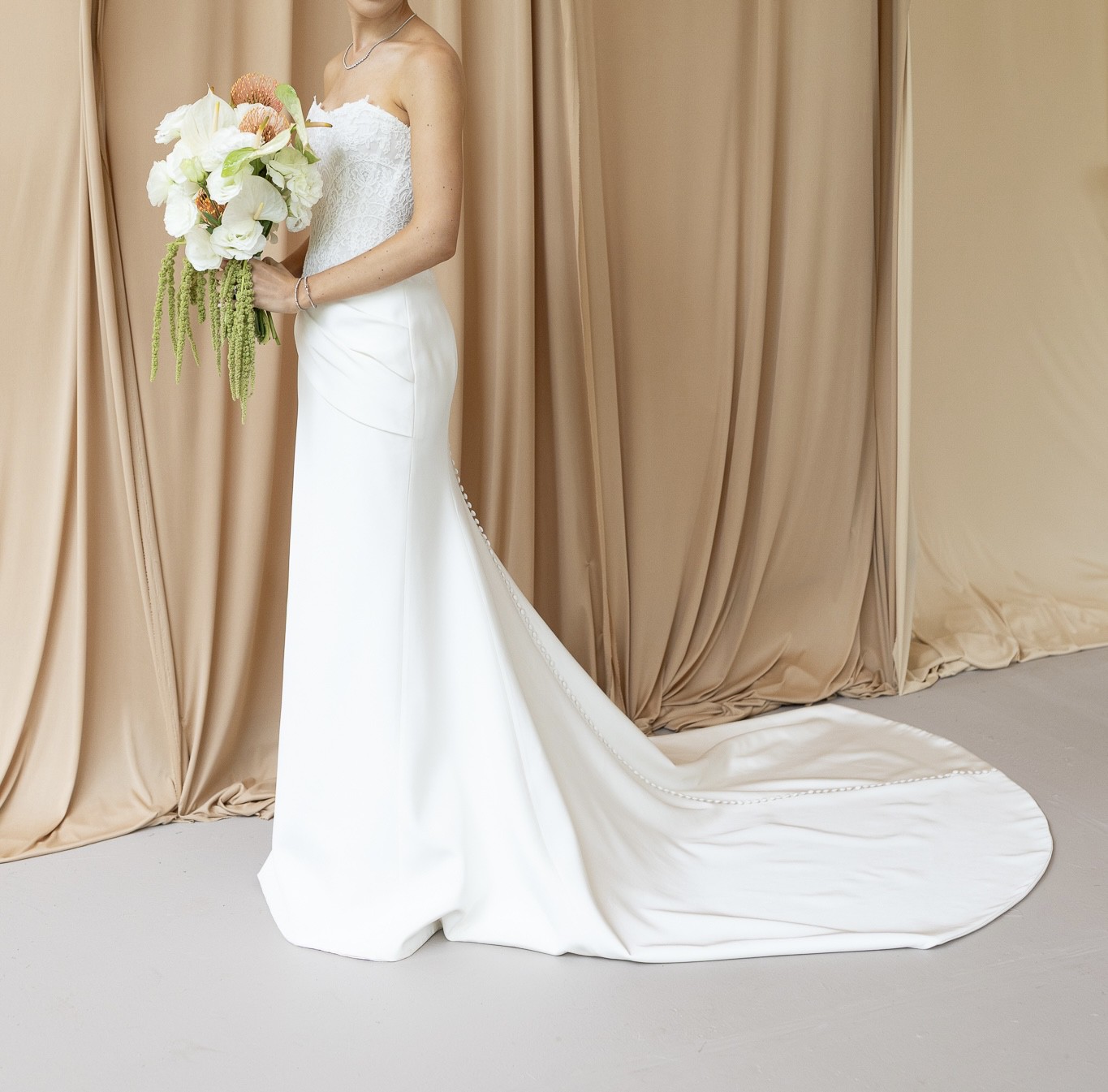 This stunning Galizia gown by Ines Di Santo was the perfect dress for my special day and I can’t wait for another bride to experience its magic. The captivating mermaid silhouette beautifully hugged my curves while allowing me the freedom to move gracefully throughout the day. The sweetheart neckline adds a timeless romance, while the backless design created an alluring and elegant look that left everyone in awe.