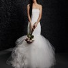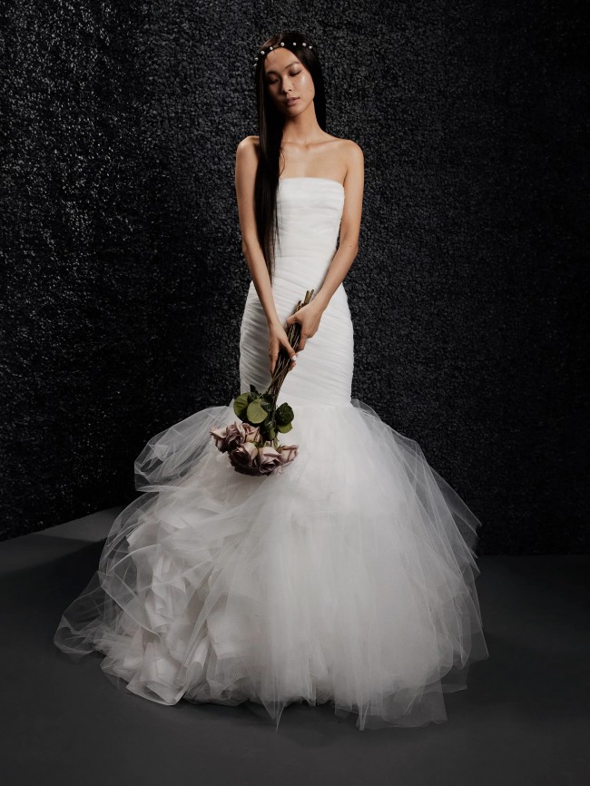Ultra-lightweight fit & flare gown in wrapped and draped tulle, the Laurence by Vera Wang has strapless bodice and subtle waist bandeau that ties at the back. Frothy skirt that tumbles from the lower thigh.