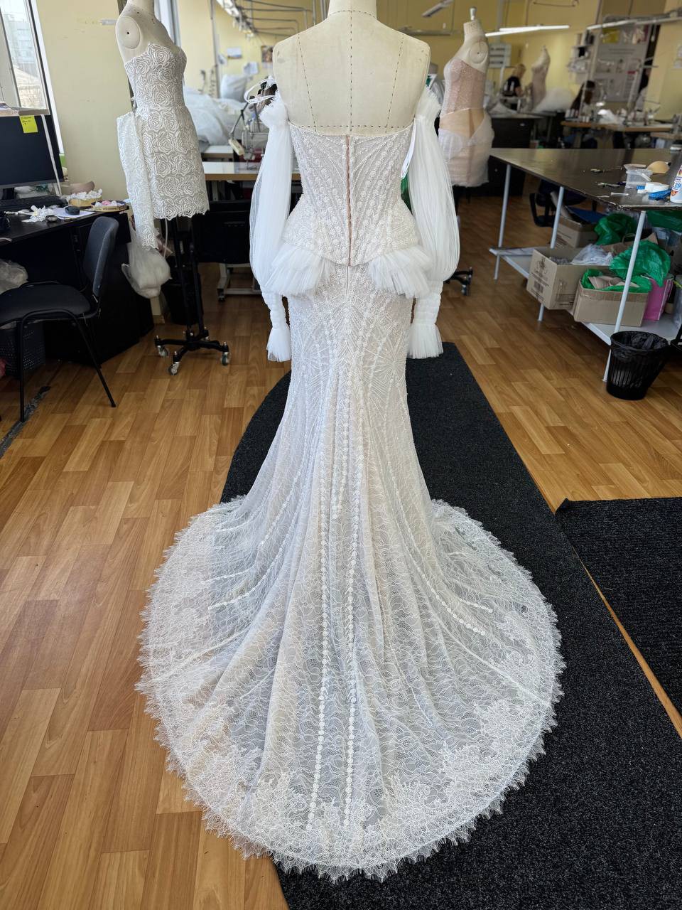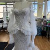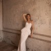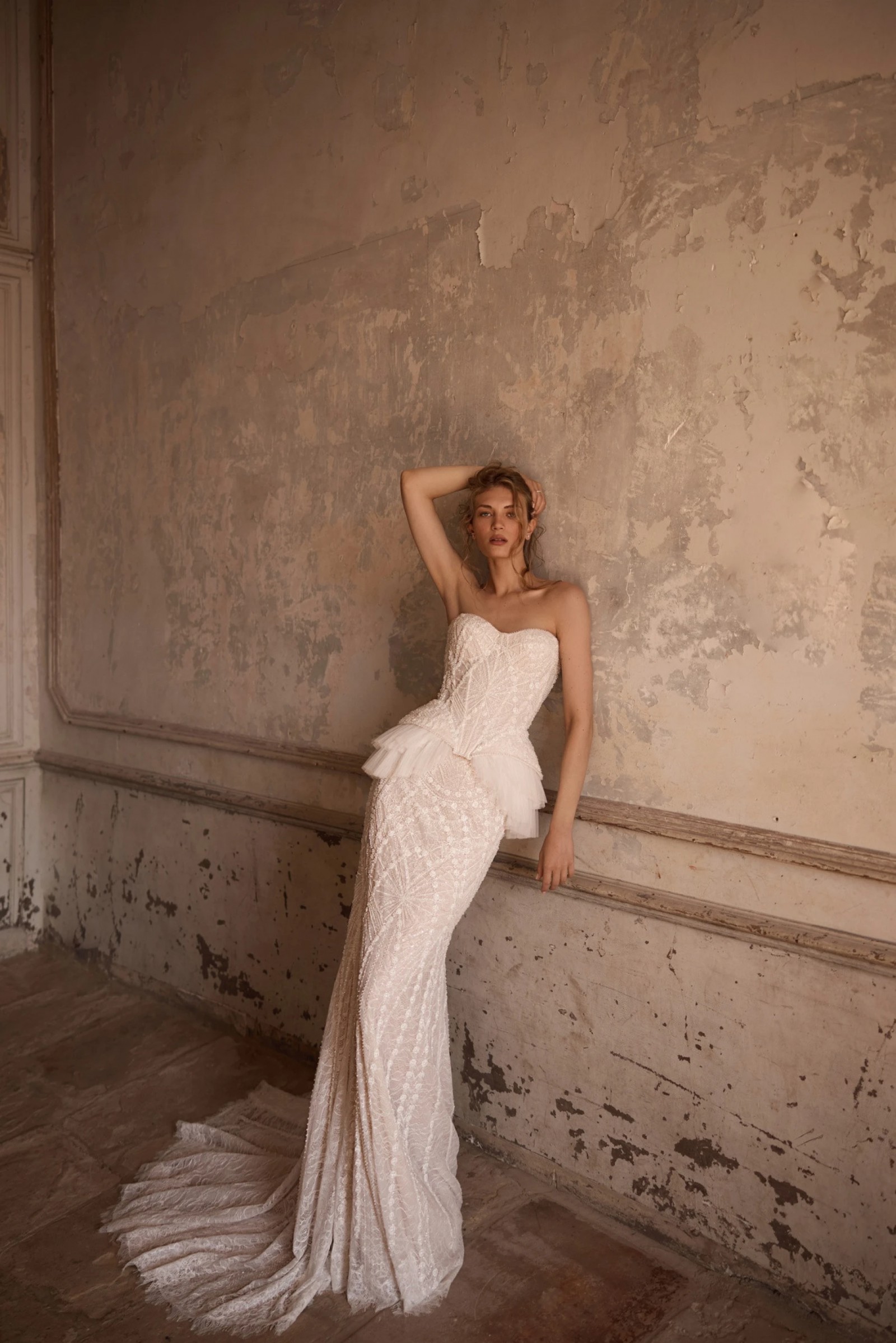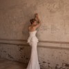 An elegant mermaid silhouette skirt in light skin color. The fitted cut beautifully hugs the hip area, flowing smoothly into a refined train. The entire surface of the skirt is delicately decorated with exquisite lace that creates a shimmering texture effect and accentuates every curve of the figure. A hidden zipper closure provides convenience while maintaining the integrity of the refined silhouette. The model is also available with lining.