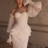 An incredibly refined corset in light skin shade is a true gem of the bridal look with modern aesthetics. The piece features a sweetheart neckline and cups that accentuate the décolletage line and lend the look exquisite femininity. The entire corset is generously adorned with lace appliqués complemented by hand-embroidered elements – every detail is thoughtfully considered. The closure is positioned at the center back with hook-and-eye extenders, ensuring a comfortable and secure fit. The set can be complemented with detachable sleeves made from the same pleated mesh, adding romance and airiness to the look. This corset is also available in classic ivory color.