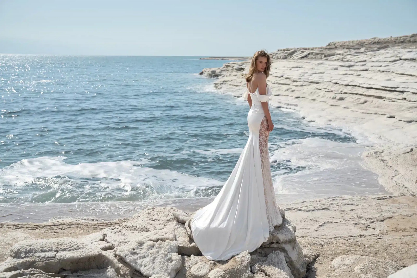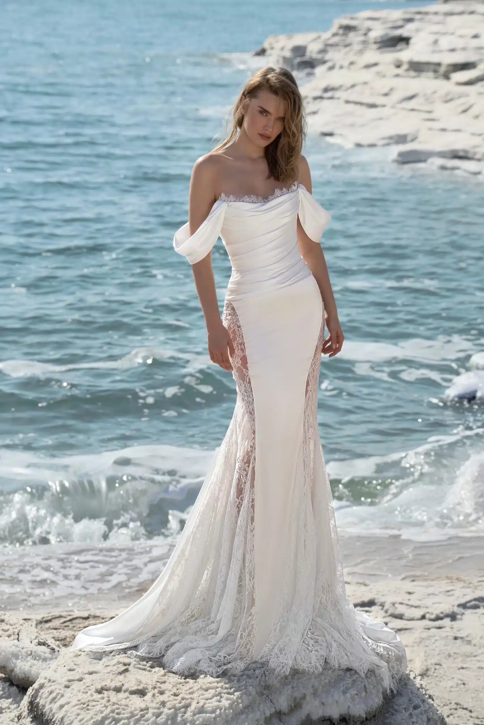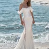 Off-the-shoulder fit & flare gown. Made from silk Mikado and luxurious Chantilly lace. Adorned with detachable romantic lace sleeves.