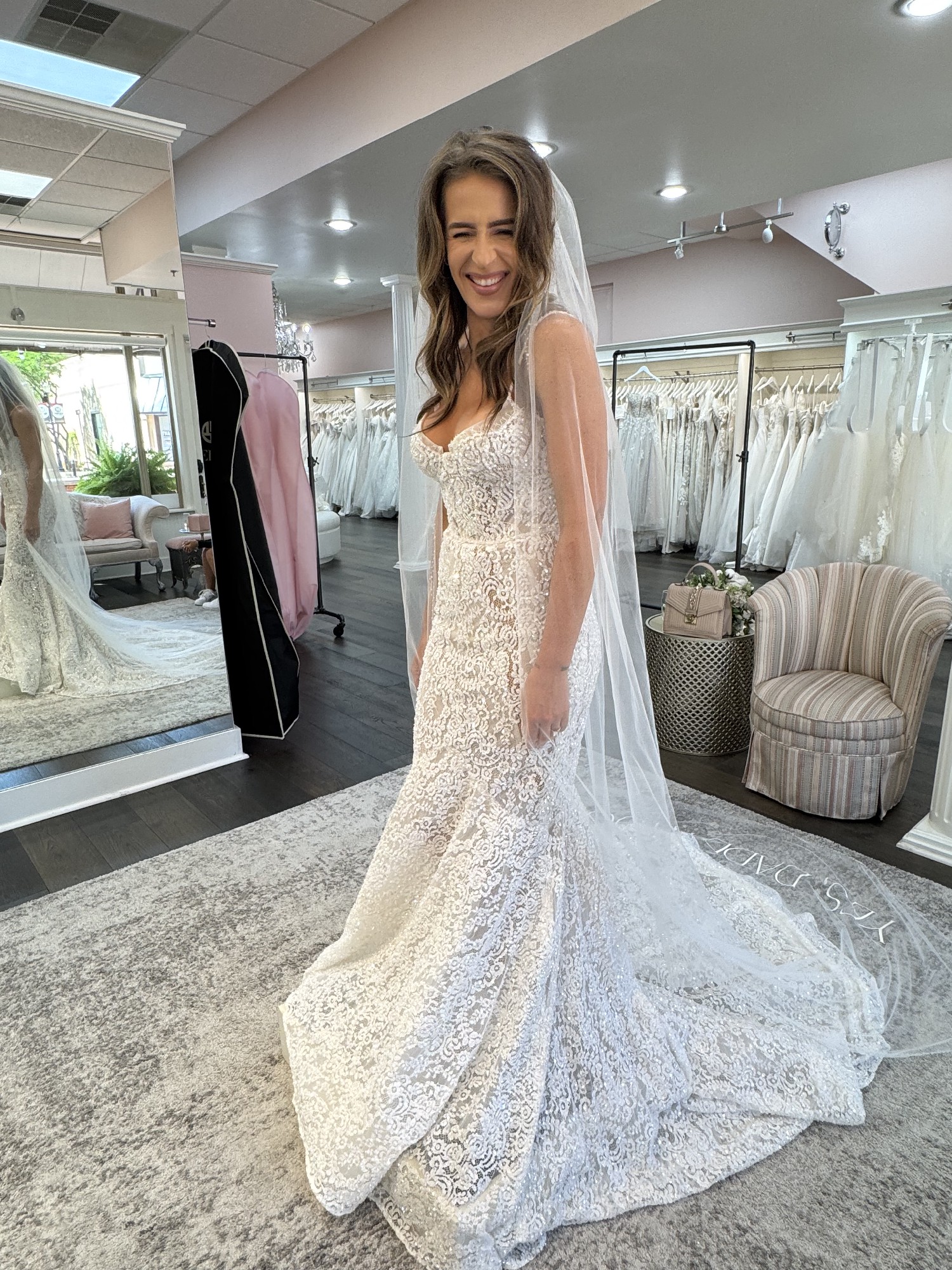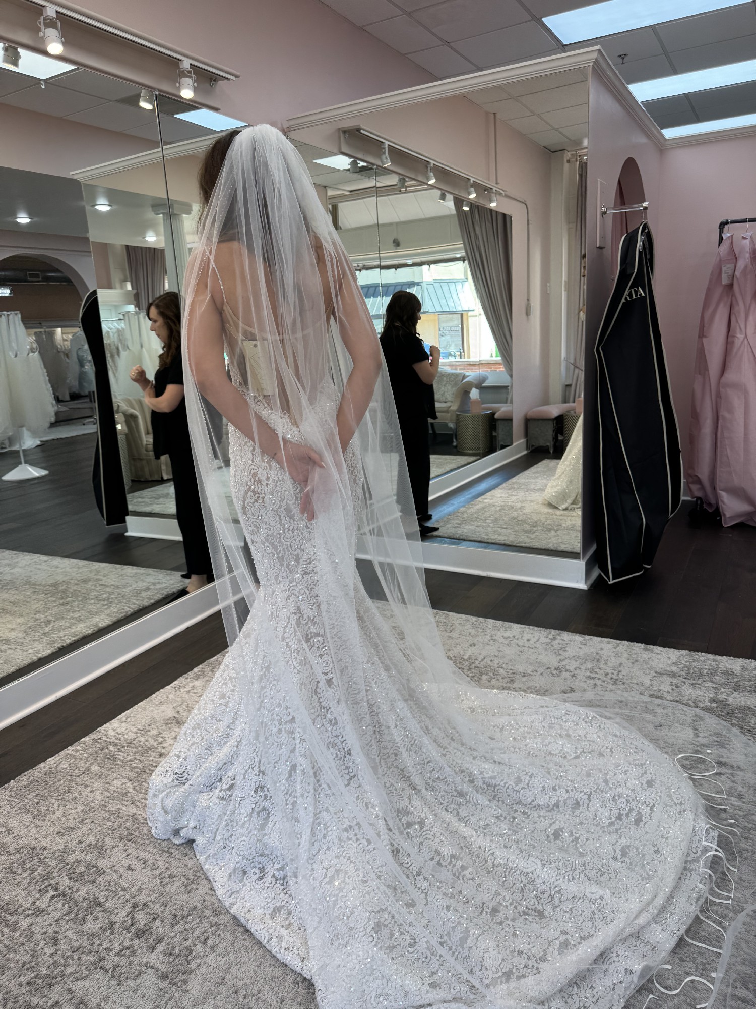 It’s that snatched, structured corset look with the kind of detail that catches the light in every photo, then finishes with a dramatic train that does all the talking. It’s elegant, bold, and honestly… unreal in person.
