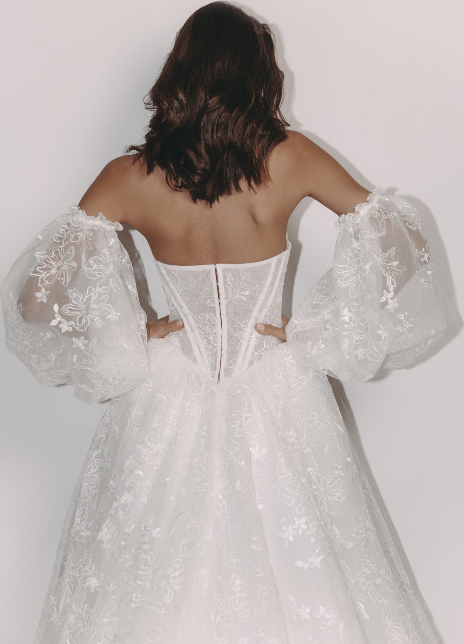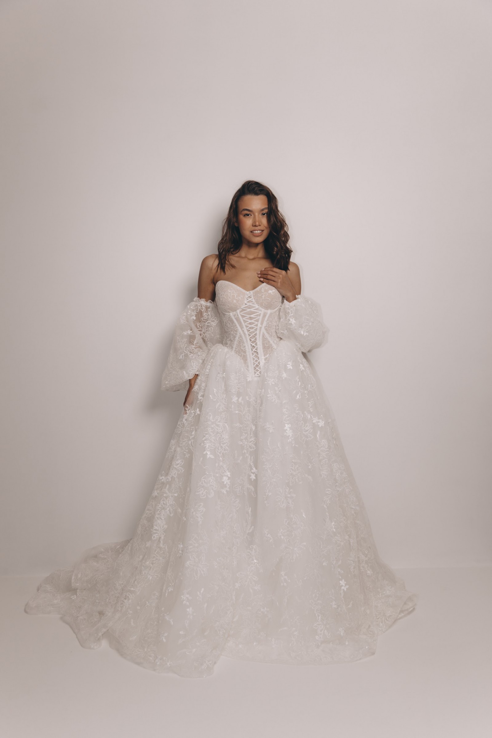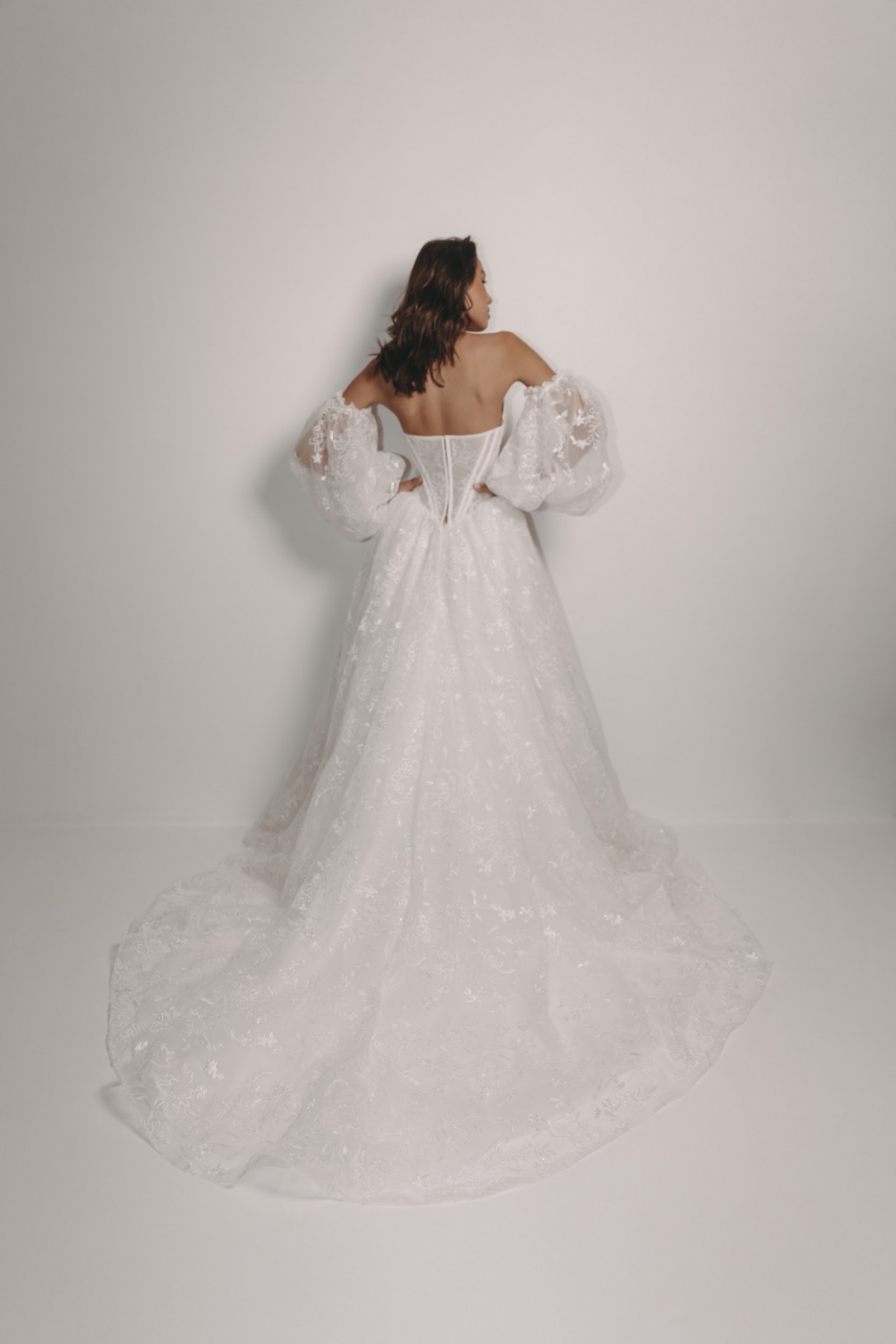 The Colorado Dress is crafted from delicate embroidered tulle, featuring intricate floral lace motifs that flow seamlessly throughout the gown. The structured corset bodice with lace-up detailing beautifully defines the waist while providing both support and a flattering silhouette. Its strapless sweetheart neckline enhances the décolletage with soft femininity. One of the standout features of this gown is the dramatic puff sleeves, made from sheer embroidered tulle. These sleeves add volume, romance, and a regal touch, creating a truly statement bridal look. They sit gracefully off the shoulders, balancing bold design with refined elegance. The skirt flows into a soft A-line / ball gown silhouette with a gentle train, offering movement and lightness while maintaining a dreamy, ethereal presence. The lace embroidery continues throughout the skirt, creating a cohesive and luxurious finish from every angle. Perfect for a romantic ceremony, garden wedding, or elegant indoor celebration, this gown is ideal for the bride seeking a unique yet timeless dress that feels both couture and unforgettable. Key Features: • Strapless sweetheart neckline • Structured lace-up corset bodice • Sheer embroidered puff sleeves • Floral embroidered tulle throughout • Soft A-line / ball gown silhouette • Floor-length skirt with train The Colorado Dress comes complete with a matching veil and detachable puff sleeves, offering versatility and the ability to transform your bridal look effortlessly from ceremony to reception 🤍 A true fairytale gown that blends romance, craftsmanship, and statement design.