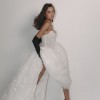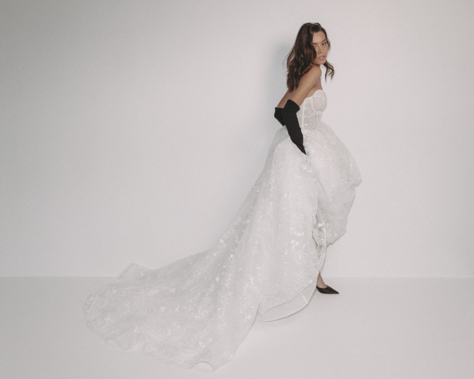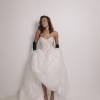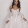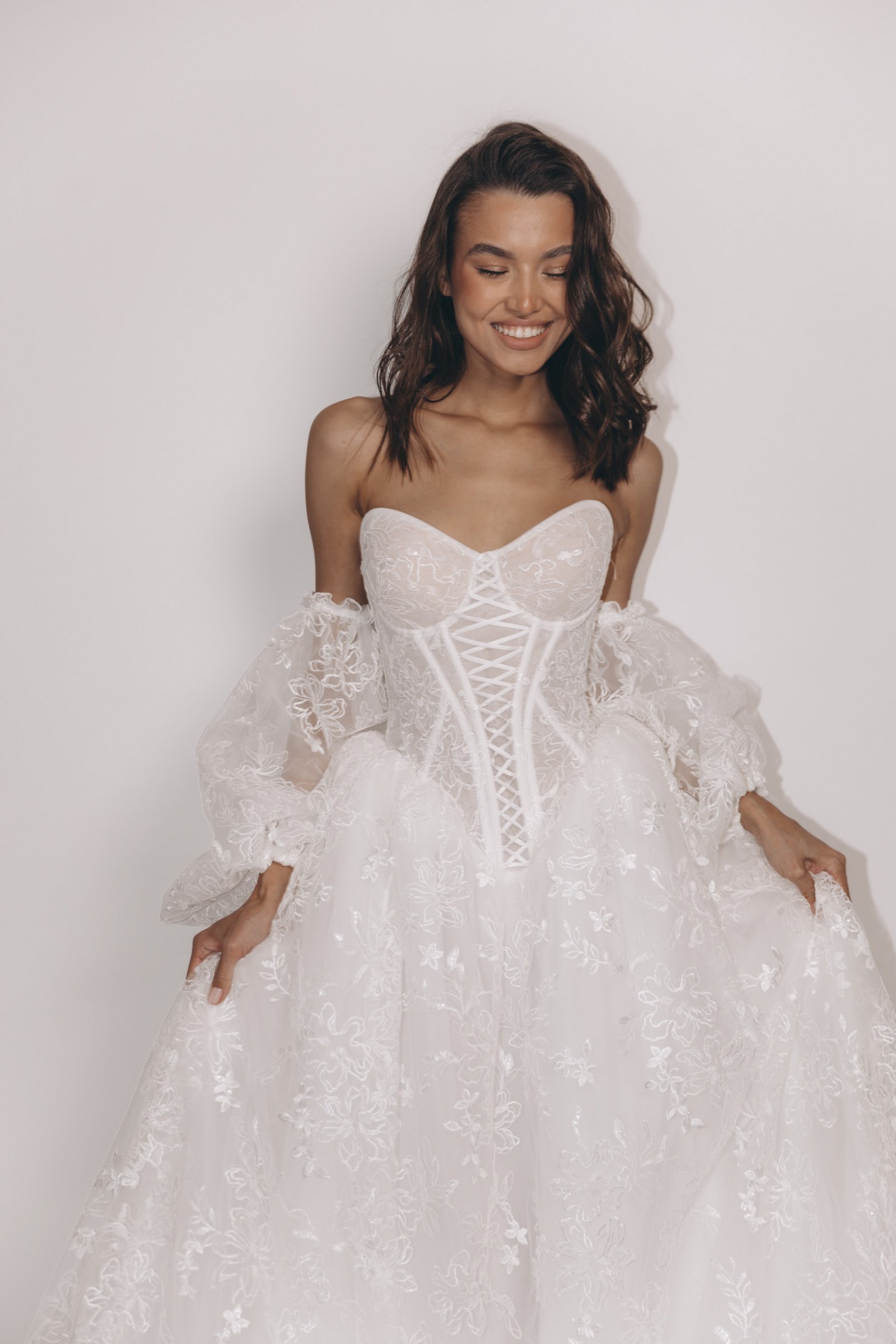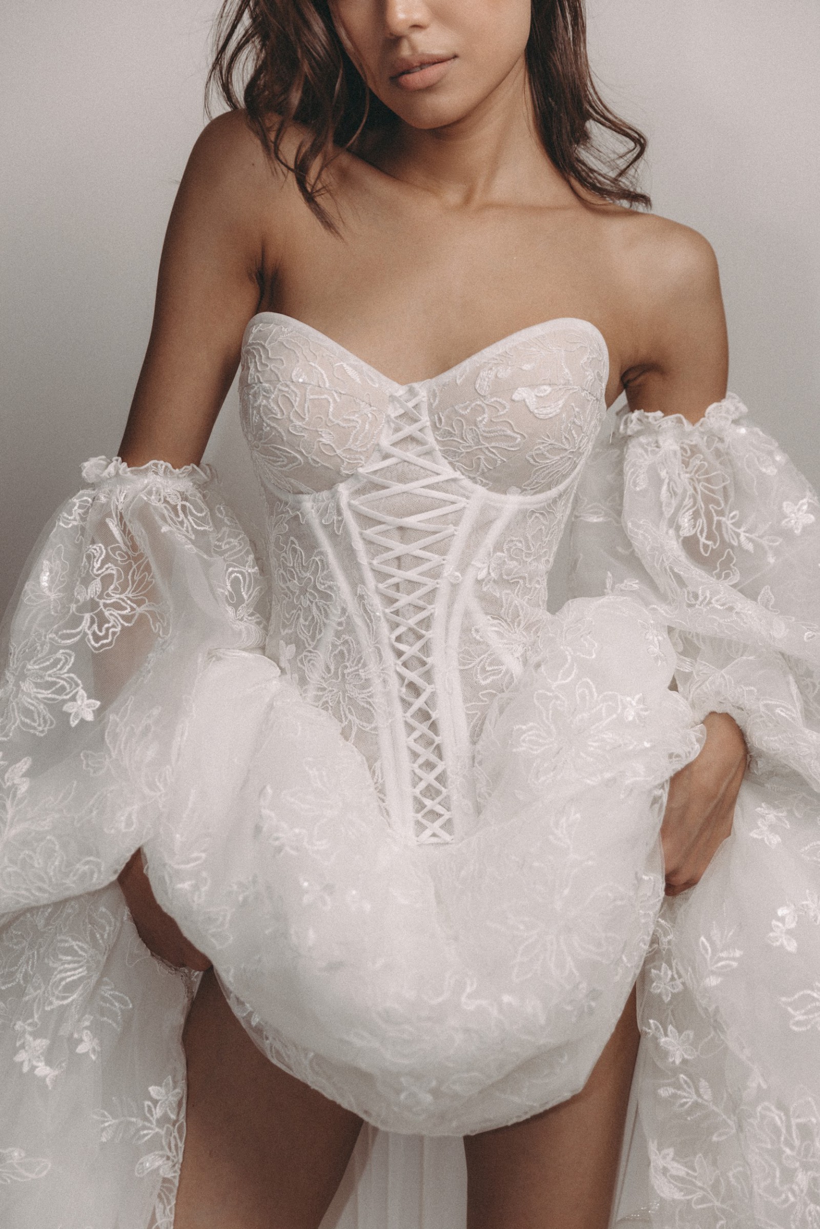 The Colorado Dress is crafted from delicate embroidered tulle, featuring intricate floral lace motifs that flow seamlessly throughout the gown. The structured corset bodice with lace-up detailing beautifully defines the waist while providing both support and a flattering silhouette. Its strapless sweetheart neckline enhances the décolletage with soft femininity. One of the standout features of this gown is the dramatic puff sleeves, made from sheer embroidered tulle. These sleeves add volume, romance, and a regal touch, creating a truly statement bridal look. They sit gracefully off the shoulders, balancing bold design with refined elegance. The skirt flows into a soft A-line / ball gown silhouette with a gentle train, offering movement and lightness while maintaining a dreamy, ethereal presence. The lace embroidery continues throughout the skirt, creating a cohesive and luxurious finish from every angle. Perfect for a romantic ceremony, garden wedding, or elegant indoor celebration, this gown is ideal for the bride seeking a unique yet timeless dress that feels both couture and unforgettable. Key Features: • Strapless sweetheart neckline • Structured lace-up corset bodice • Sheer embroidered puff sleeves • Floral embroidered tulle throughout • Soft A-line / ball gown silhouette • Floor-length skirt with train The Colorado Dress comes complete with a matching veil and detachable puff sleeves, offering versatility and the ability to transform your bridal look effortlessly from ceremony to reception 🤍 A true fairytale gown that blends romance, craftsmanship, and statement design.