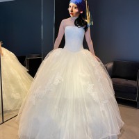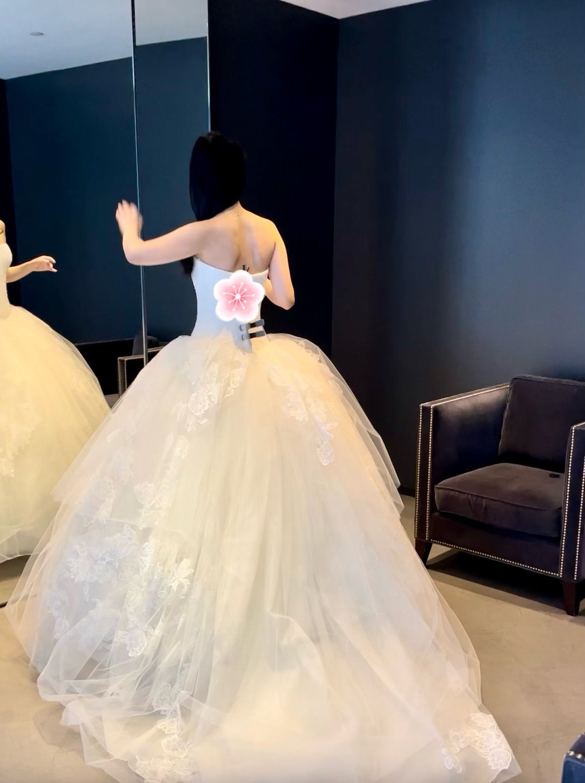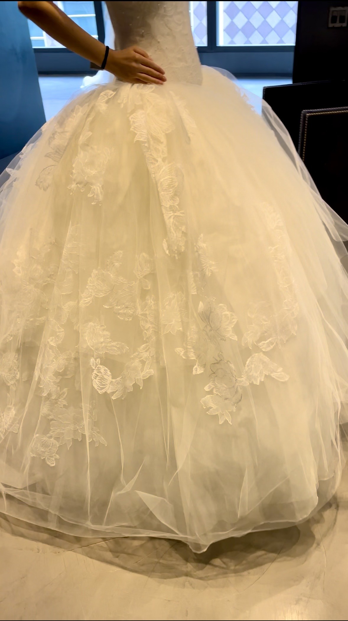 Crafted with the finest details, the floor-length skirt cascades beautifully, with luxurious lace , it creates a breathtaking sweep as you walk down the aisle. Each layer of fabric flows gracefully, ensuring that you’ll feel like a princess from the moment you slip it on.
