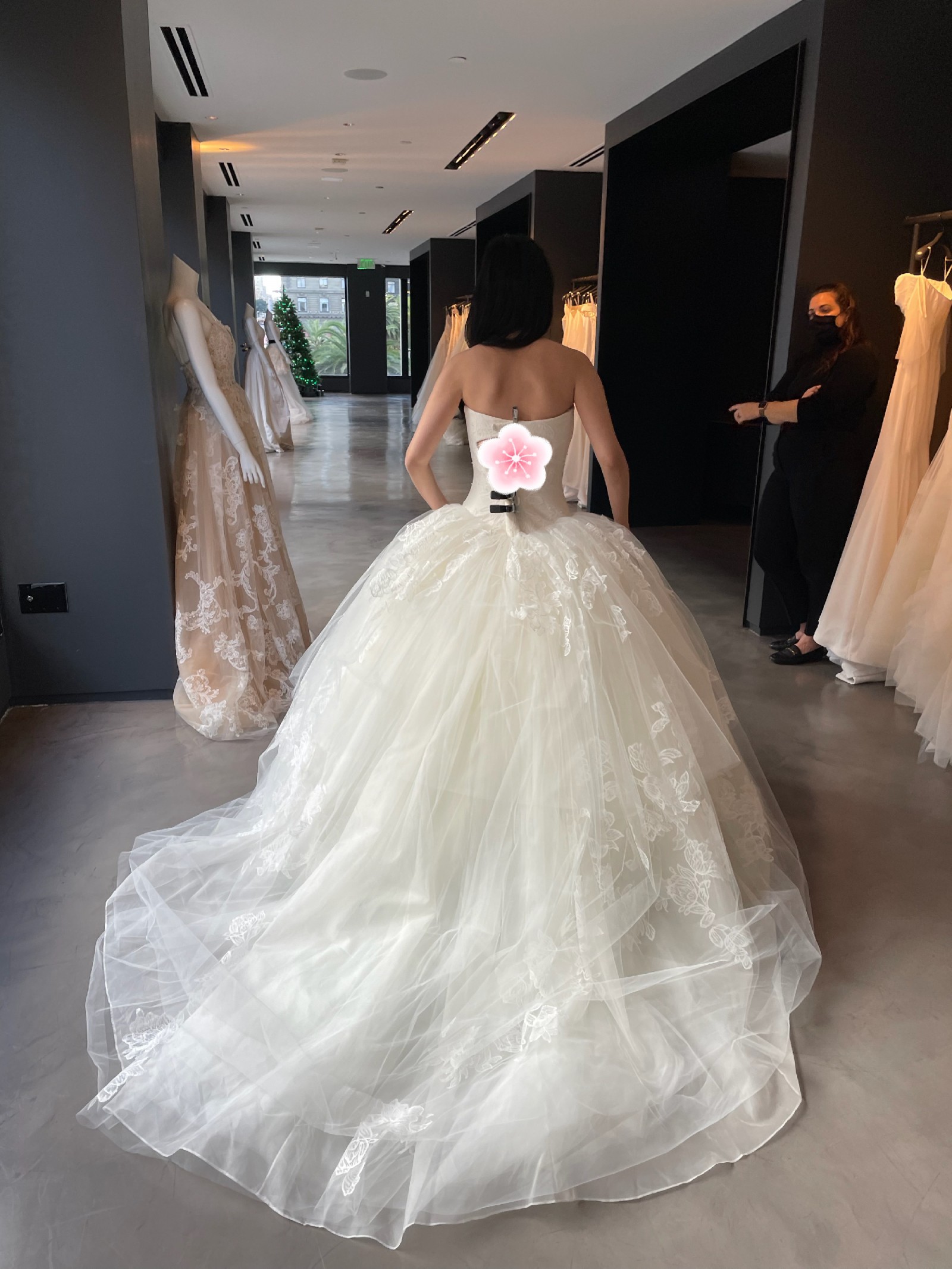 This Vera Wang Lisbeth dress is the embodiment of elegance and romance, and it's ready to make someone feel as magical as I did on my special day. The stunning ballgown silhouette offers a classic and timeless appeal, making it perfect for a fairytale wedding. The straight neckline elegantly frames the shoulders, while the strapless design adds a touch of sophistication and allure.