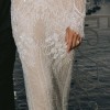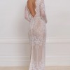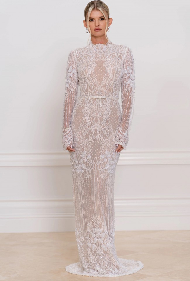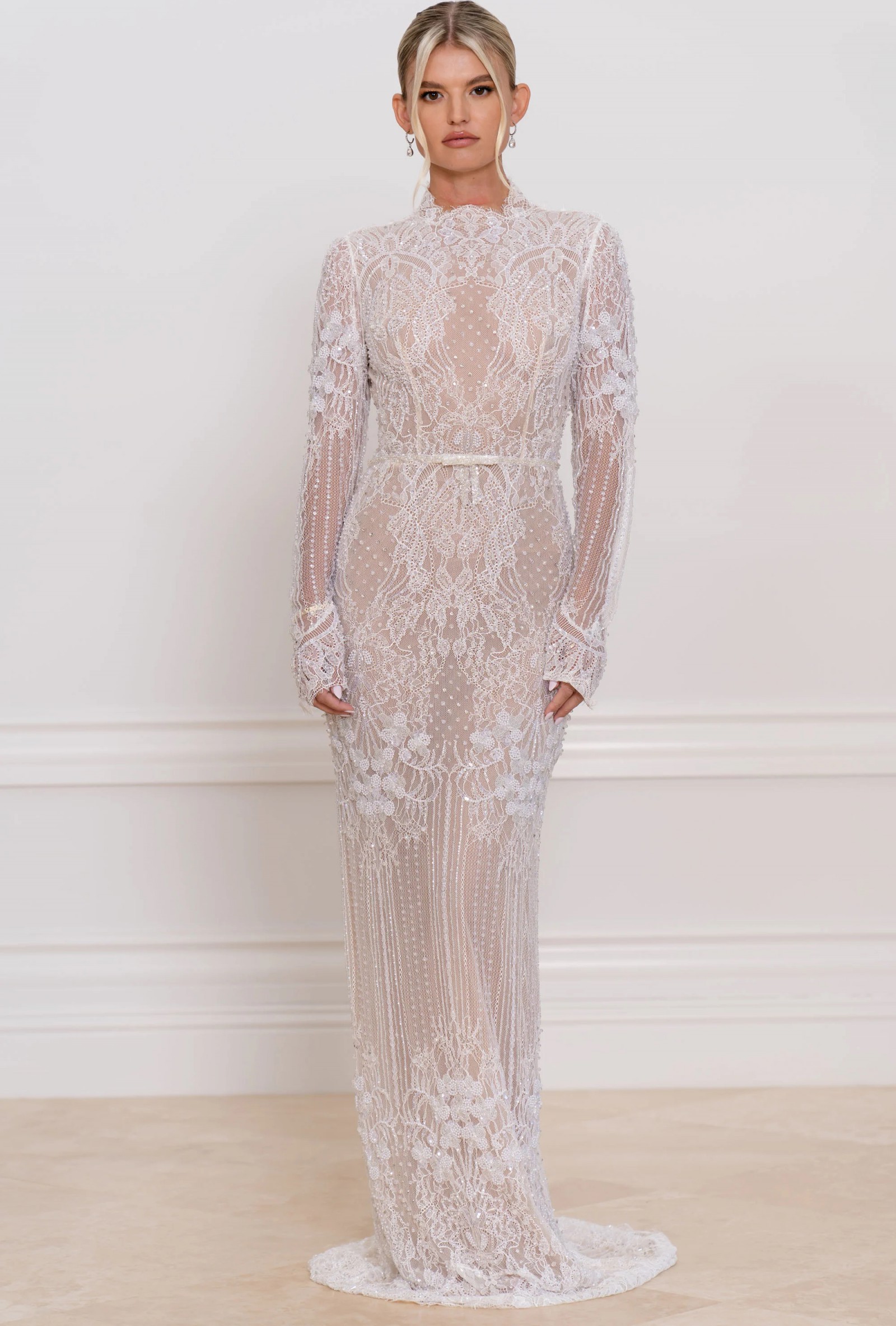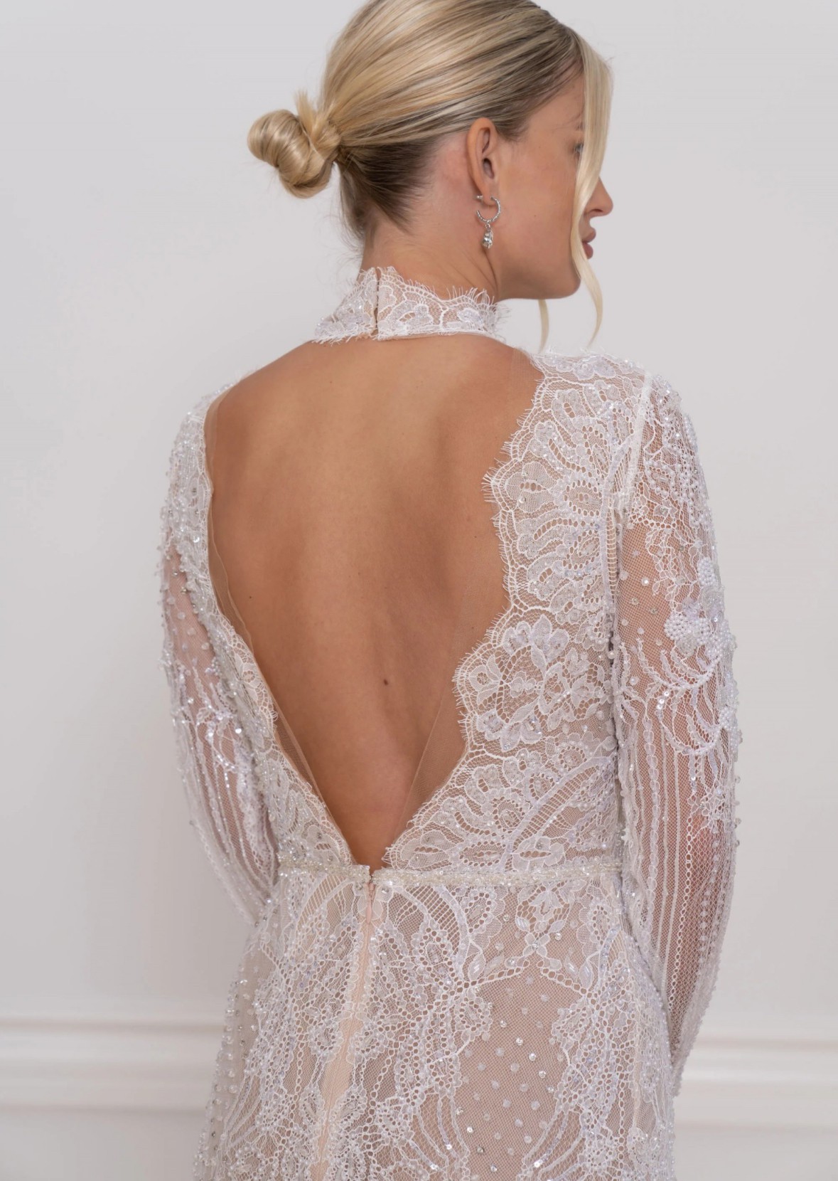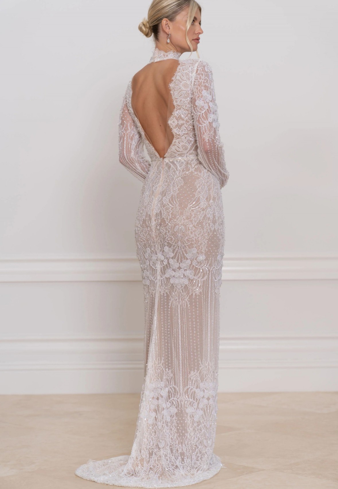 Eisen Stein's Finch Gown is a masterpiece of understated elegance. This long-sleeved, mock-neck sheath wedding gown is crafted from delicate lace adorned with intricate beading, creating a look of timeless sophistication. A waist belt adds a touch of definition and complements the overall silhouette. The gown's pièce de résistance is its dramatic open back, adding a hint of allure and modern flair. The Finch Gown is a perfect choice for those seeking a harmonious blend of classic and contemporary elements on their special day.