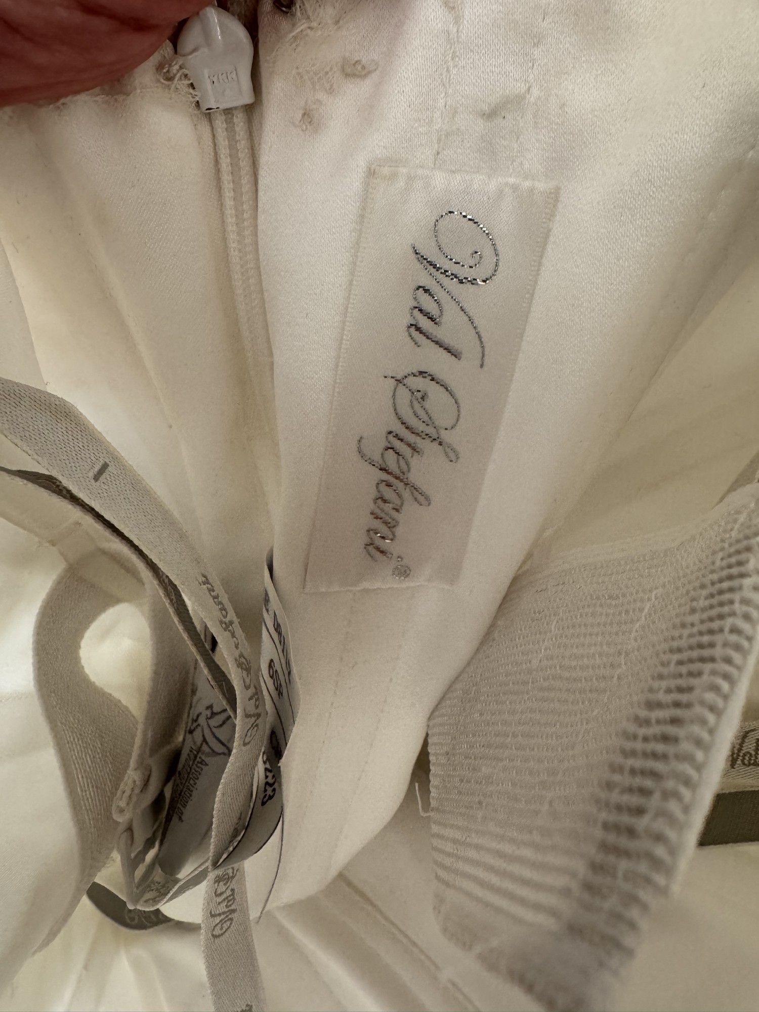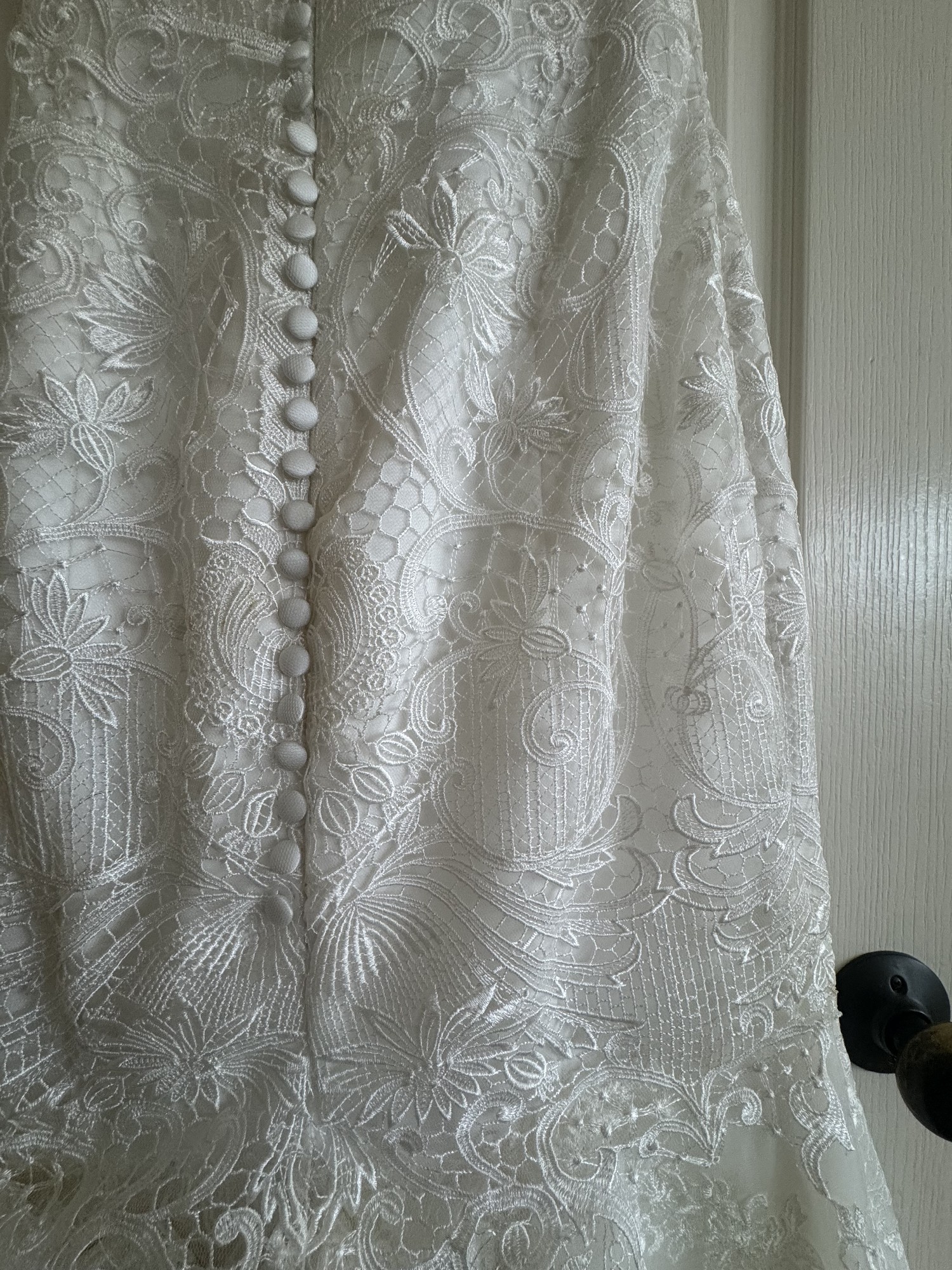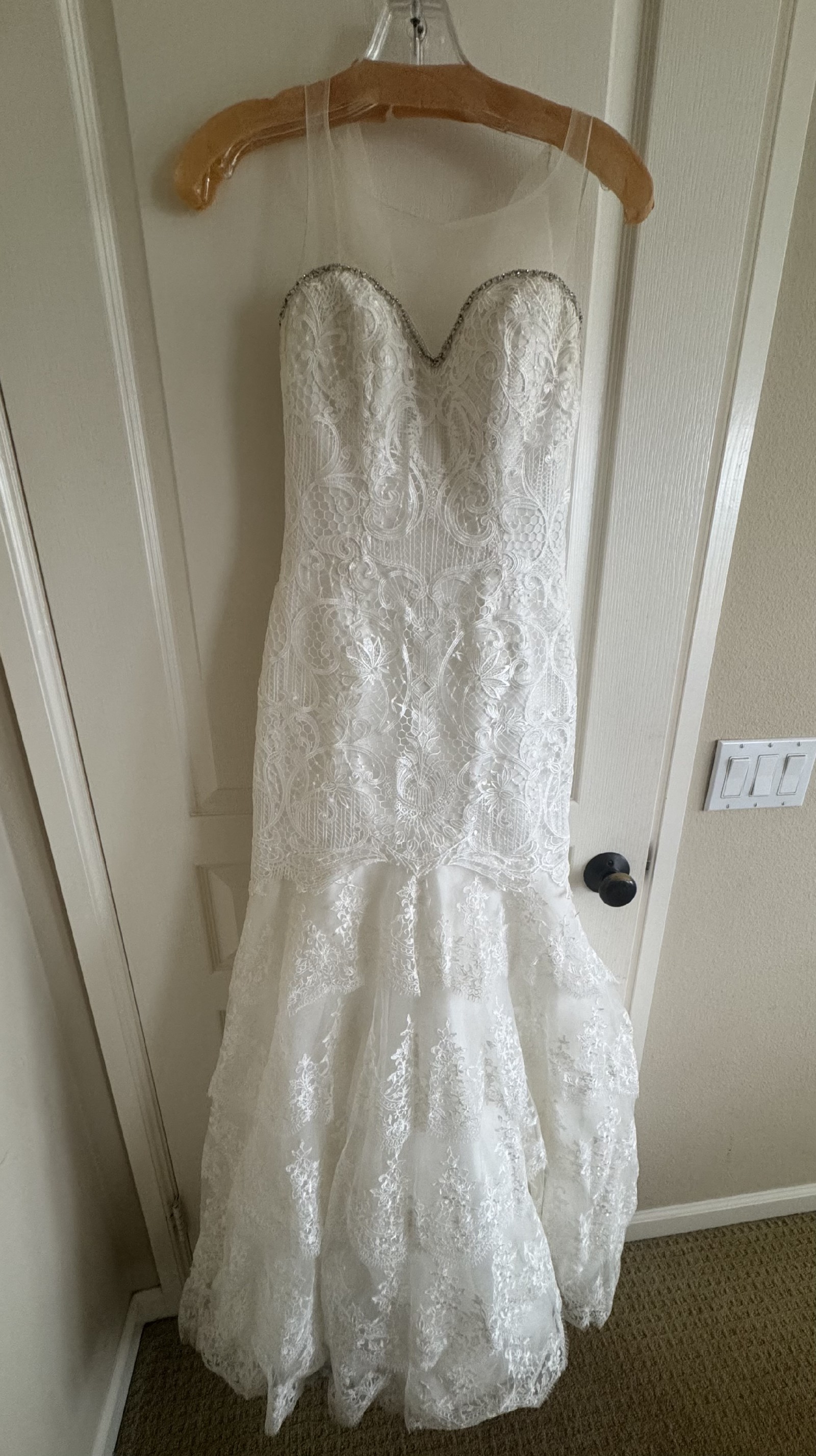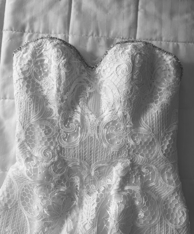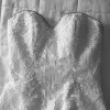 This dress is from Val Stefani, white, unique lace. I added the sheer top but you can easily take that off to make it a simple strapless sweetheart neckline.