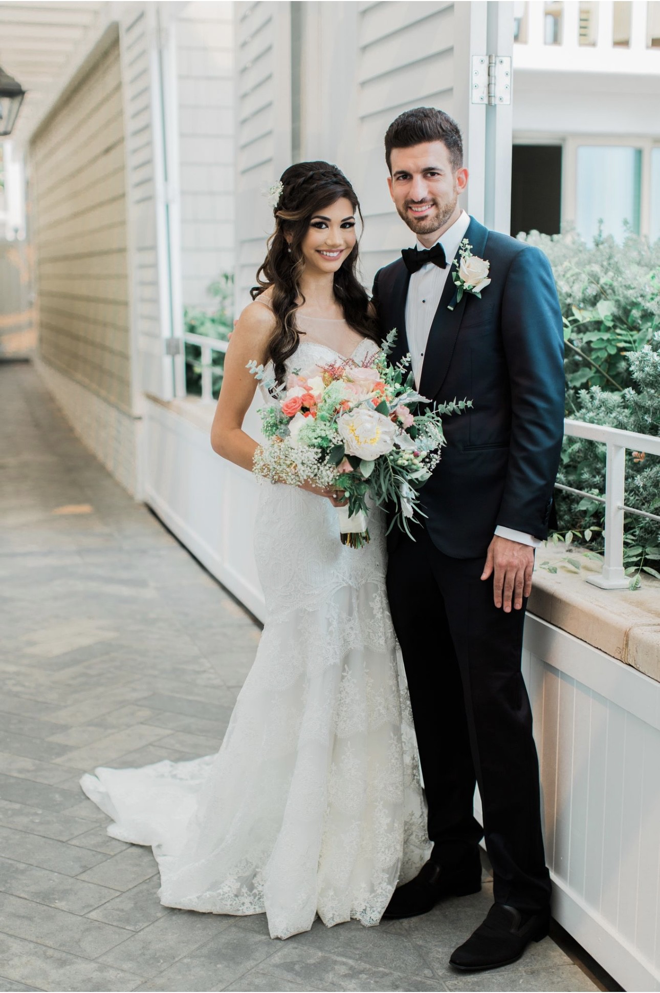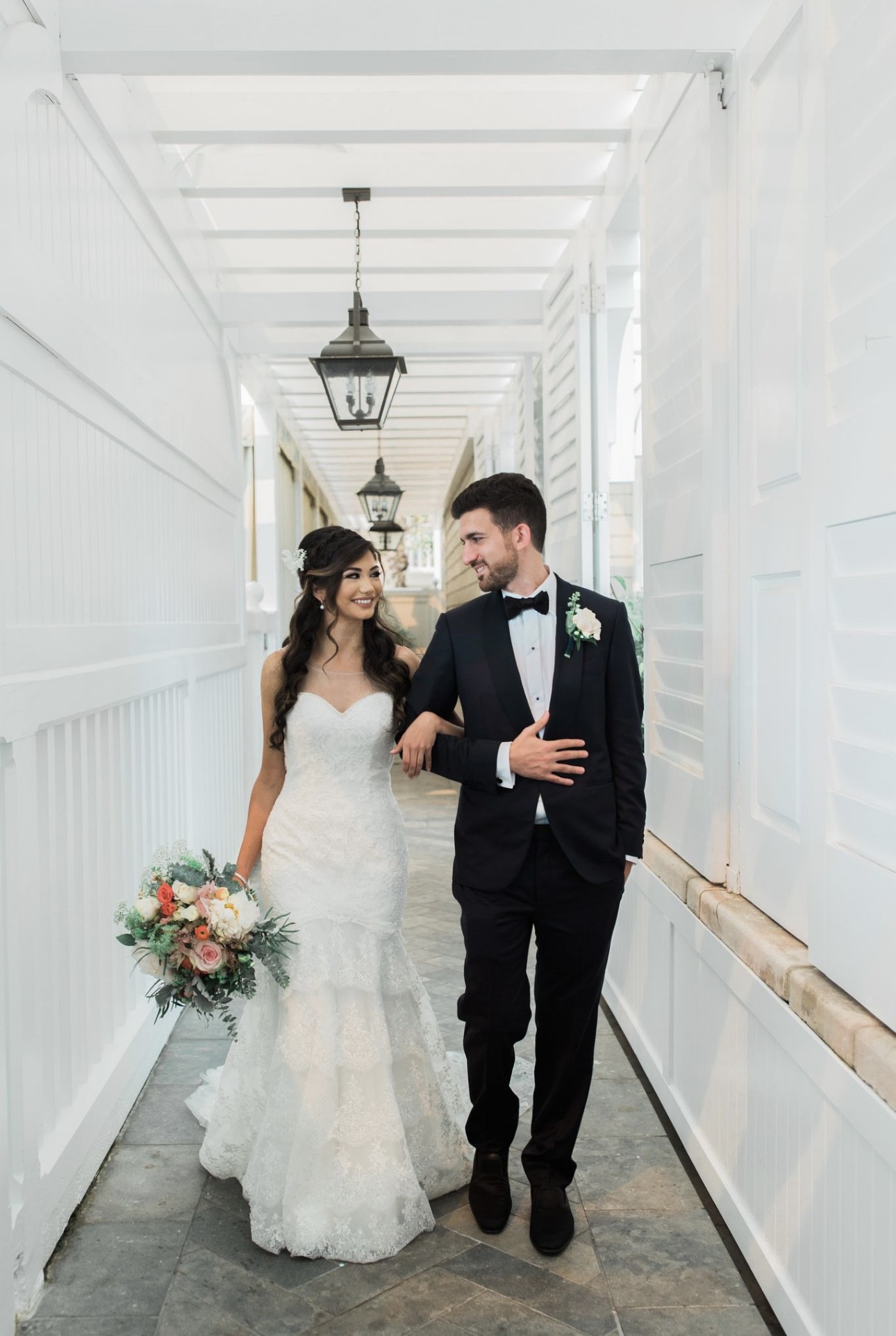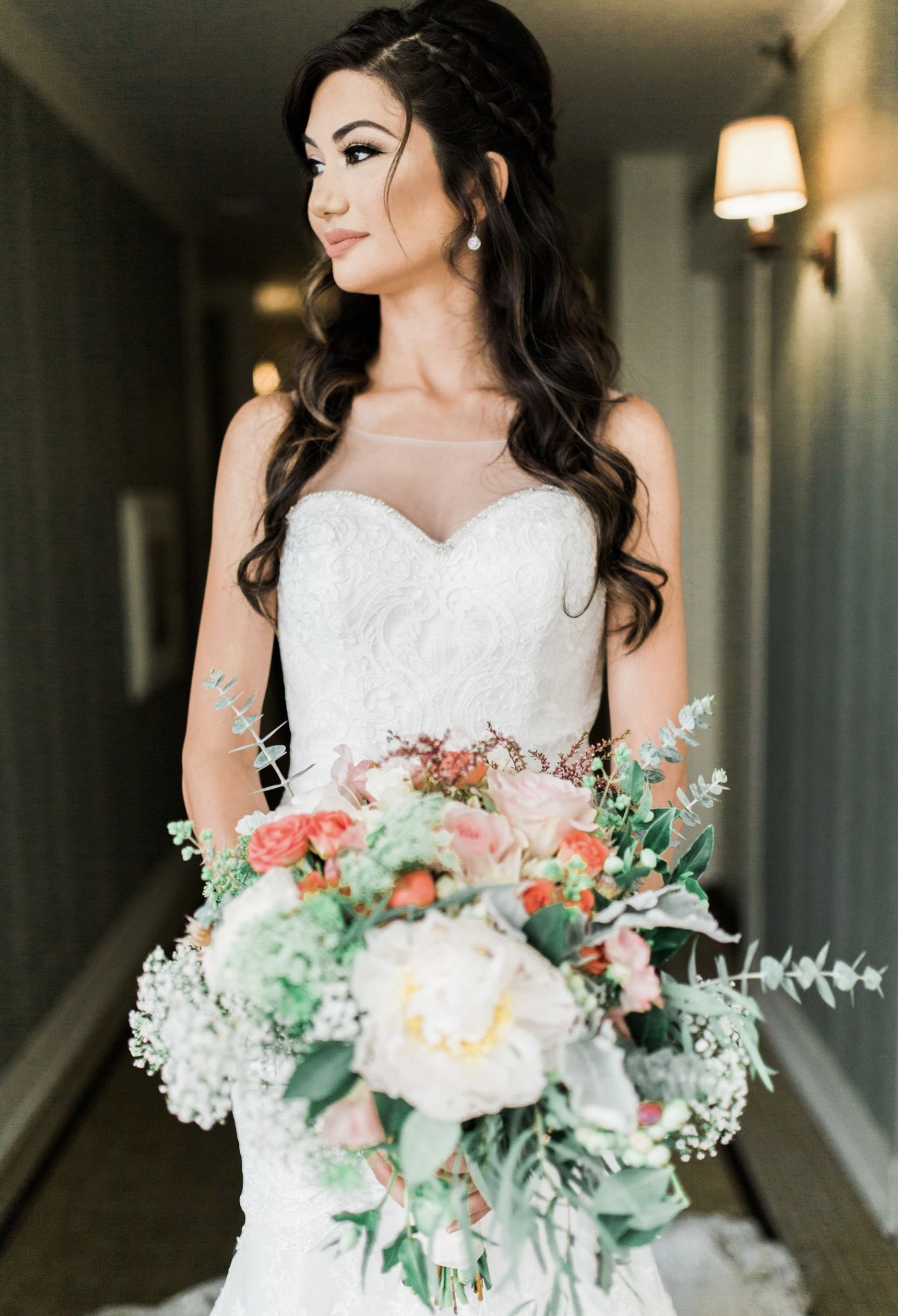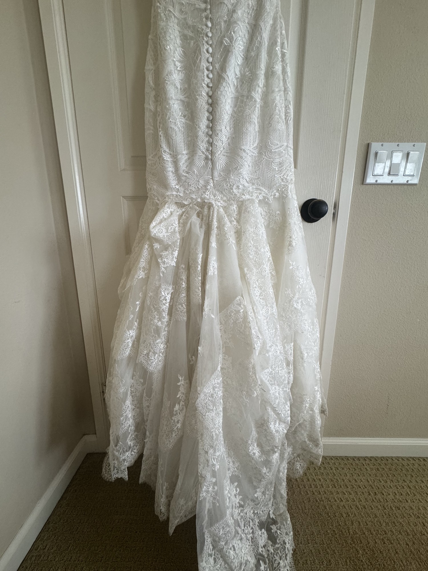 This dress is from Val Stefani, white, unique lace. I added the sheer top but you can easily take that off to make it a simple strapless sweetheart neckline.