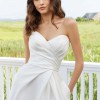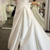 Description on the website: With all the best elements of a high-fashion look, in luxe stretch Larissa satin, our Erin designer wedding dress feels both timeless and bold. The chic gown features a romantic sweetheart bodice that's delicately draped to give you the illusion of a narrow waist, especially when paired with the flared, A-line skirt. A daringly high skirt slit makes the dress feel sultry and modern while remaining beautifully bridal. Shown in Diamond White.