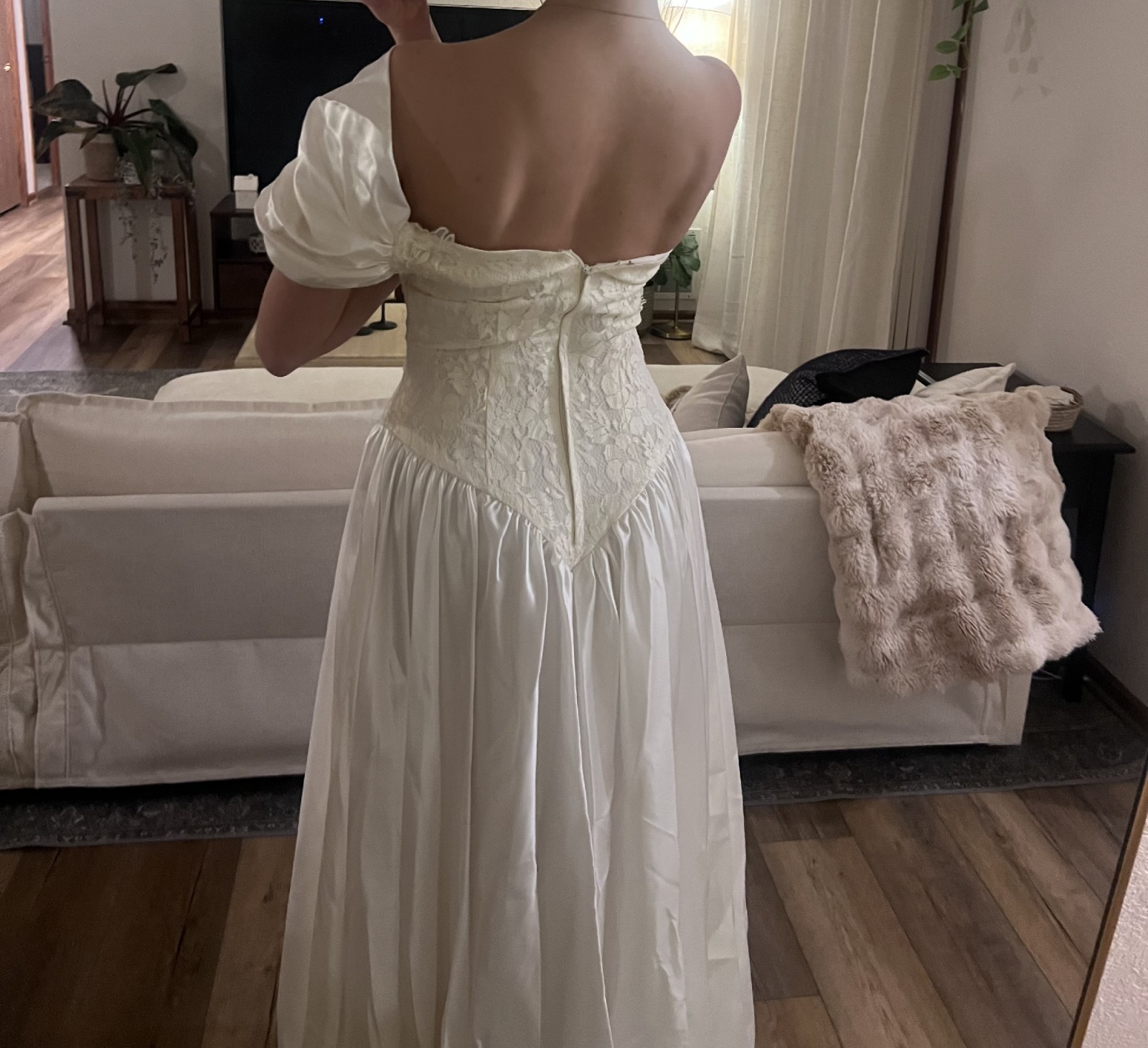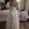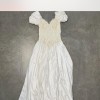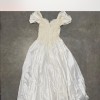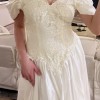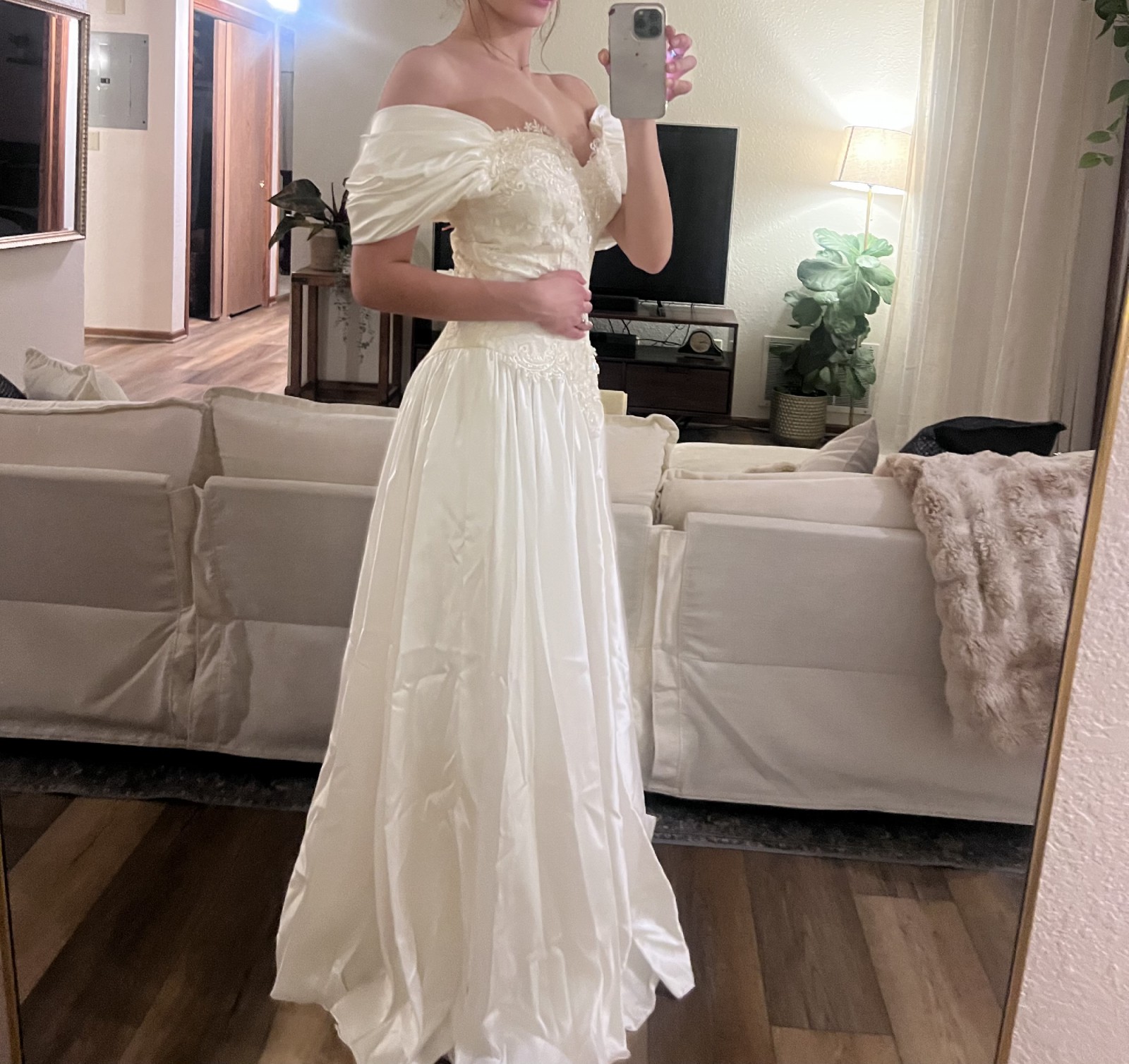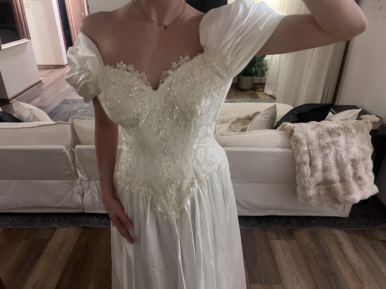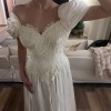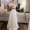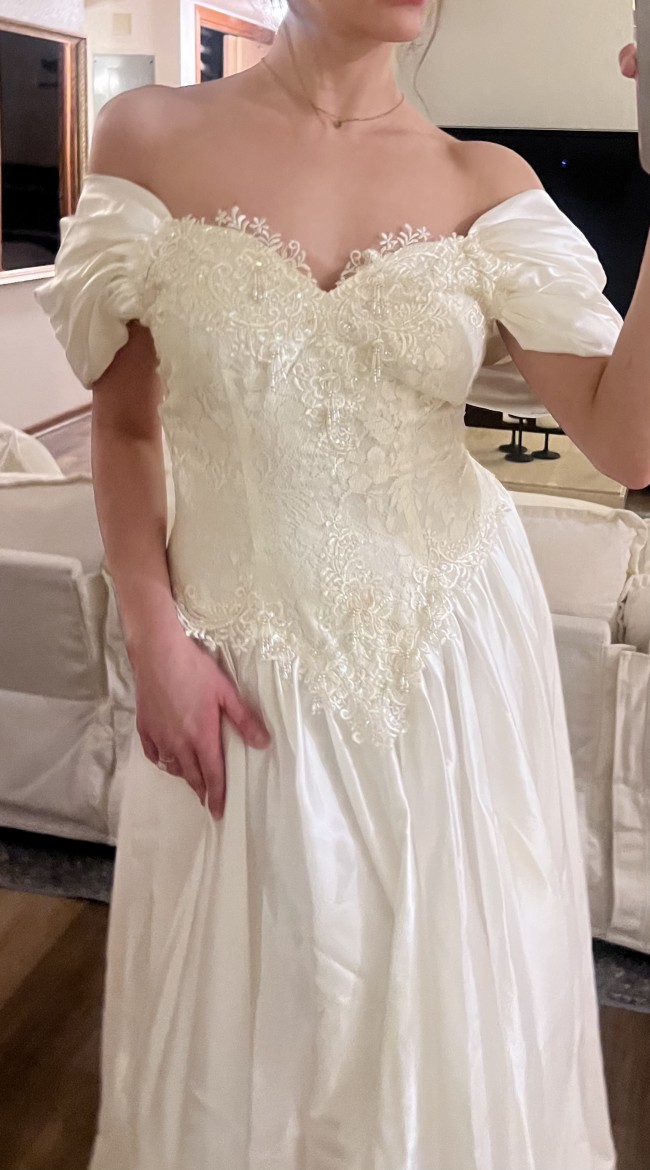 An elegant off-the-shoulder gown featuring a softly structured bodice adorned with delicate floral lace appliqués and subtle beading. The neckline is finished with a sheer lace trim that adds a romantic, vintage touch, while the draped satin sleeves rest gracefully on the shoulders. The fitted waist flows into a lightweight, airy skirt that moves beautifully, creating a timeless and feminine silhouette. Classic, ethereal, and effortlessly graceful.