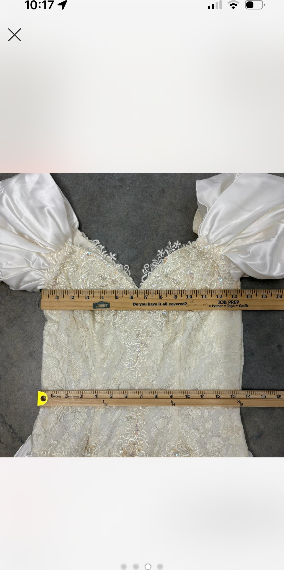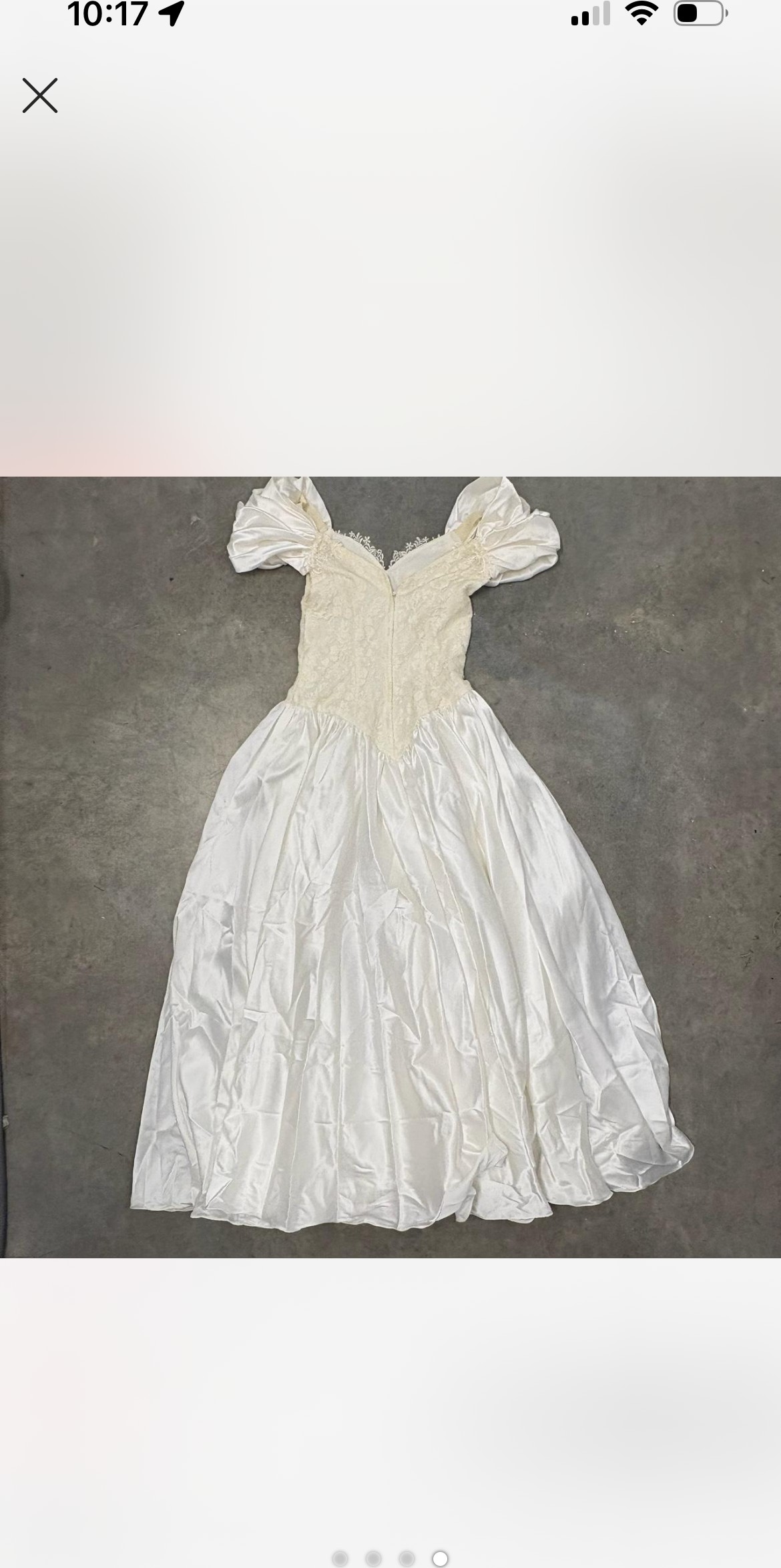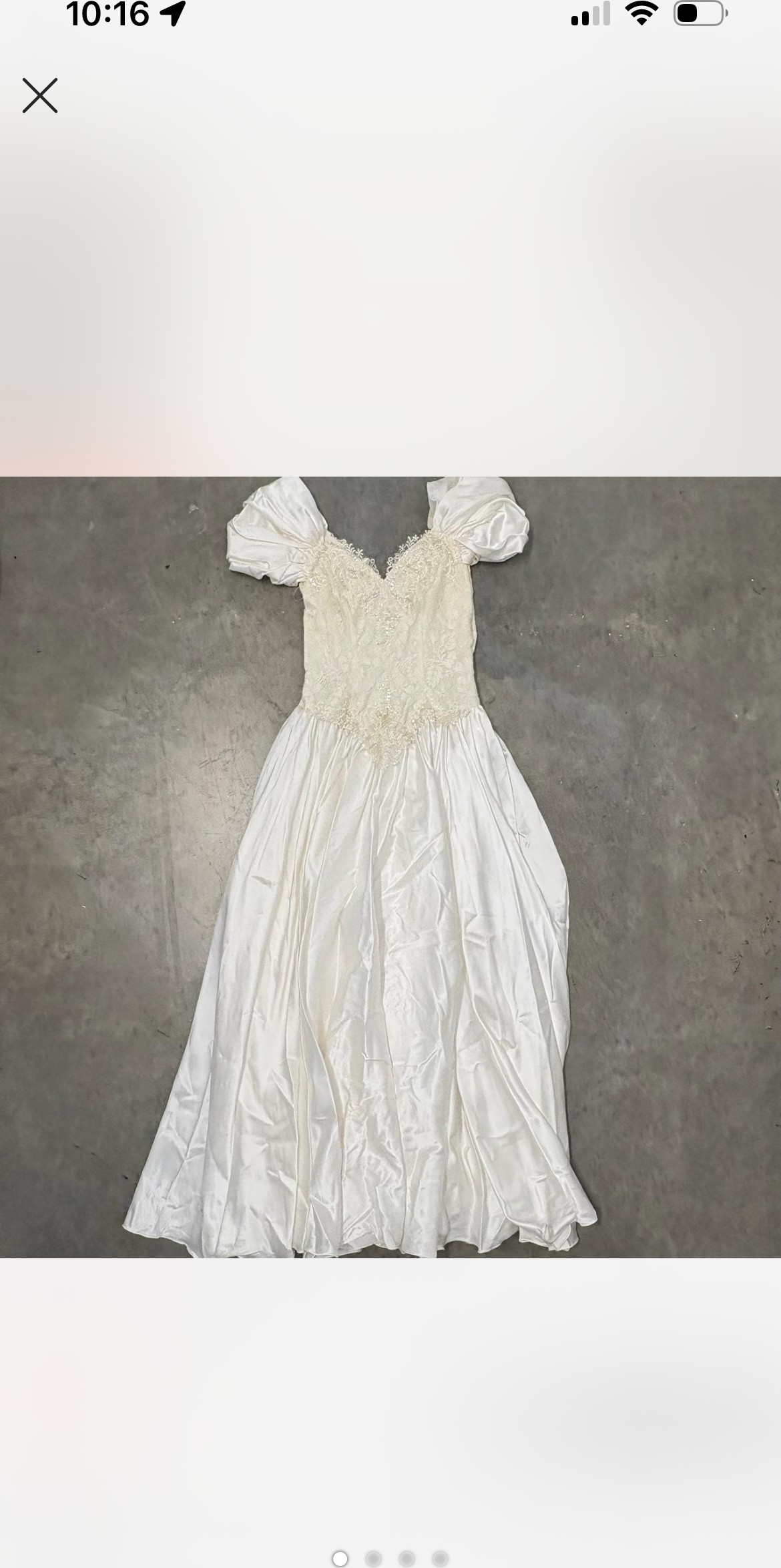 An elegant off-the-shoulder gown featuring a softly structured bodice adorned with delicate floral lace appliqués and subtle beading. The neckline is finished with a sheer lace trim that adds a romantic, vintage touch, while the draped satin sleeves rest gracefully on the shoulders. The fitted waist flows into a lightweight, airy skirt that moves beautifully, creating a timeless and feminine silhouette. Classic, ethereal, and effortlessly graceful.