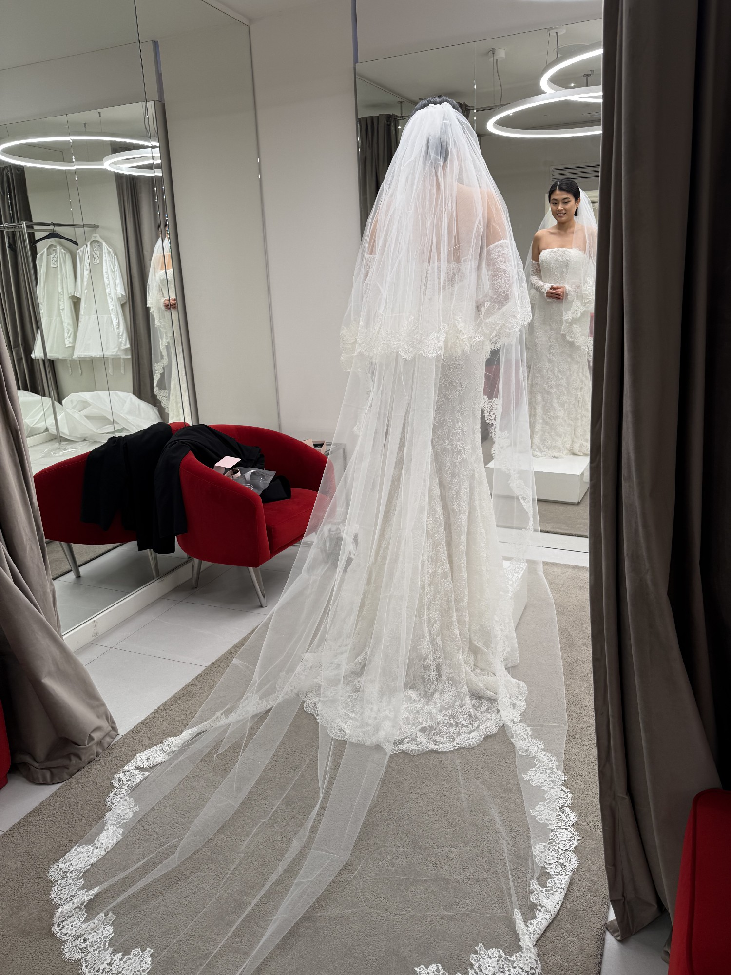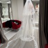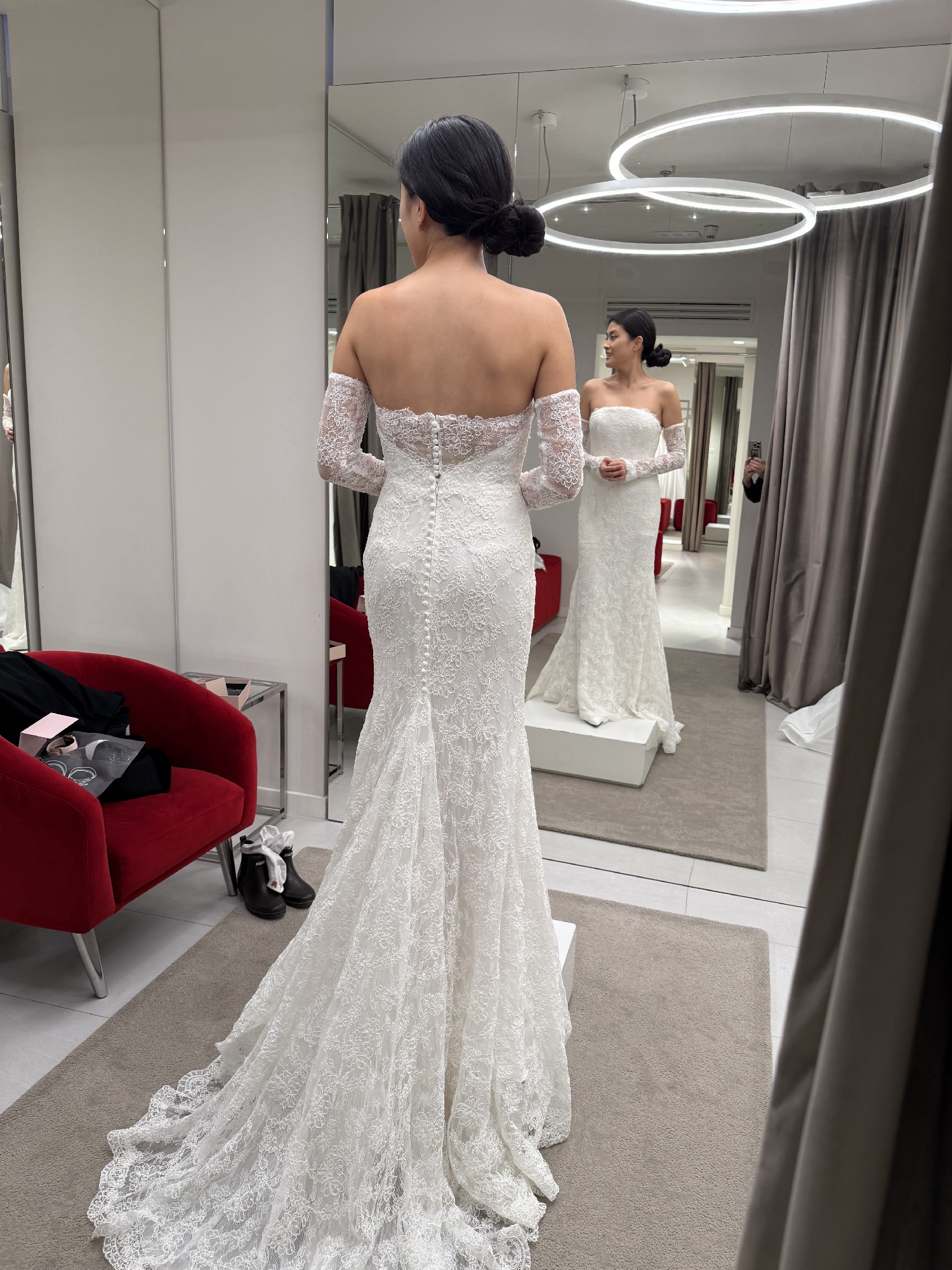 I ordered this dress at Nicole Milano by Pronovias store in the heart of Paris in late-November 2024. It took around 8 months for the atelier to make the dress. After fittings, I had my wedding in mid-December 2025. I only wore it once for a few hours on my wedding day, but it caught some dirt from the floor as I was moving around outdoors for the photo session. I took the dress to the dry cleaners right after. They did an amazing job, but they couldn’t completely get rid of the dirt stain on the bottom part as they didn’t want to ruin the delicate lace. From afar, they are not very visible as the stains are only on the bottom part of the dress (see photos/videos for reference). If you are shorter than me, you may even be able to cut some inches off and the dress would look flawless.