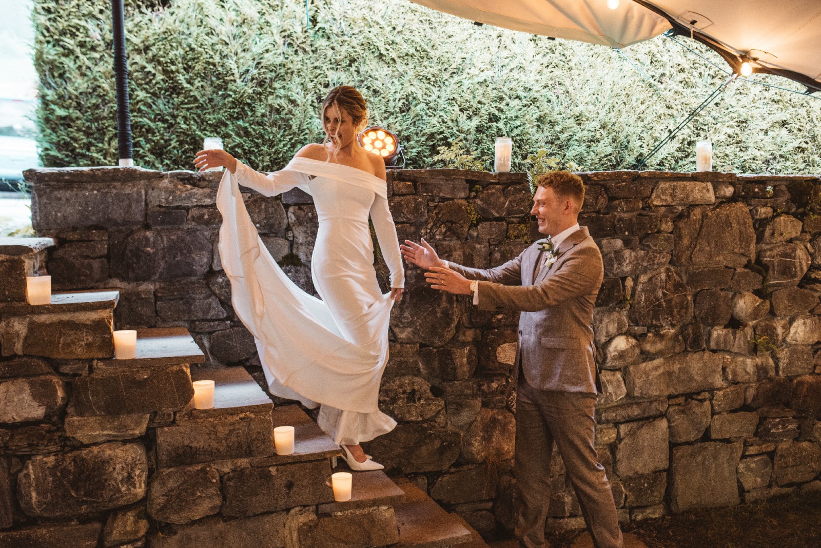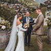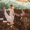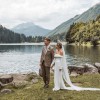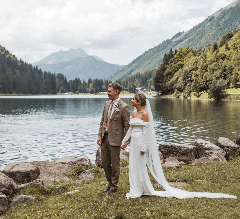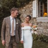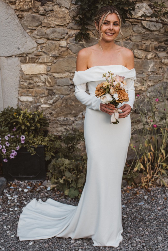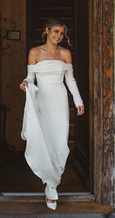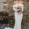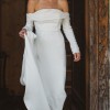Girl Crush combines the designer’s love of bare shoulders and long sleeves. Together with the sleek stretch crepe and elegant train, the silhouette is strong yet sensual. A row of fabric buttons on each sleeve and a back tie add sophisticated detailing. Style yours with a wavy bob for a fresh non-bridal look.