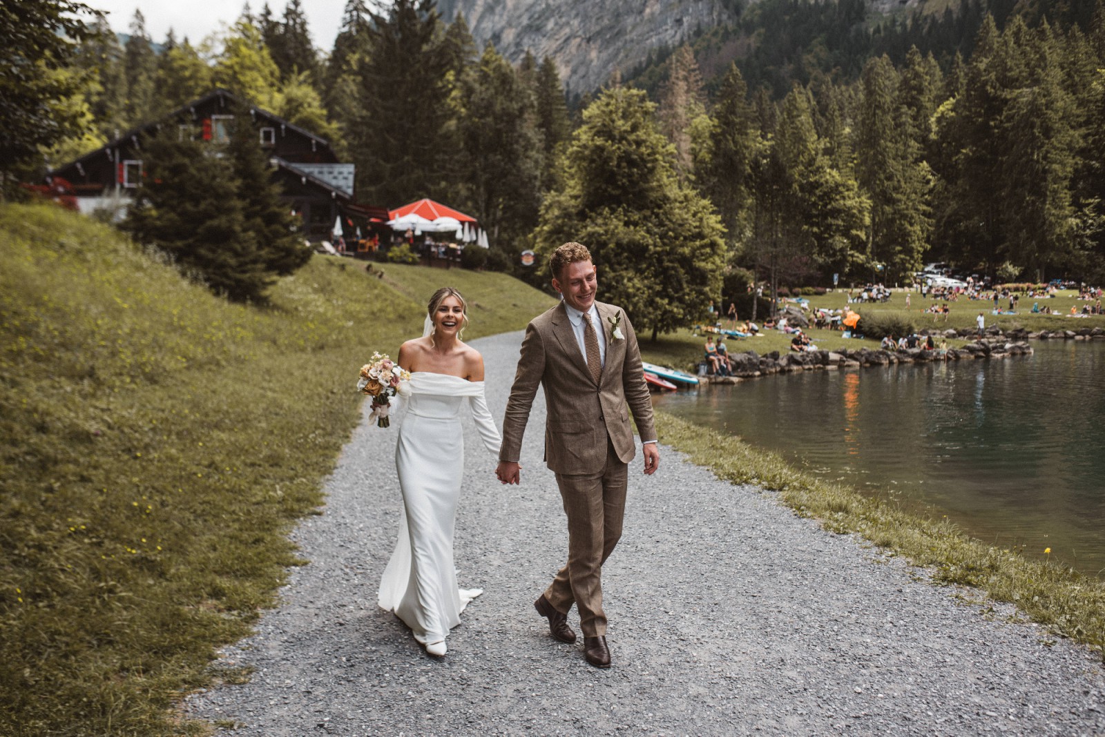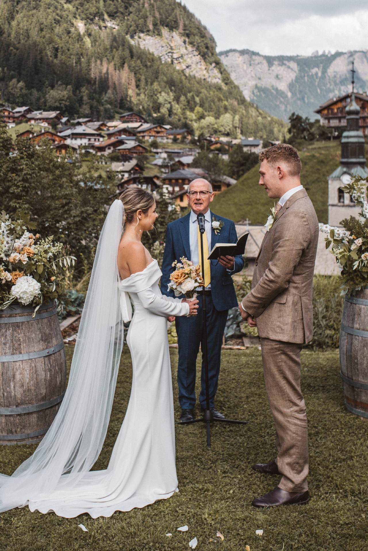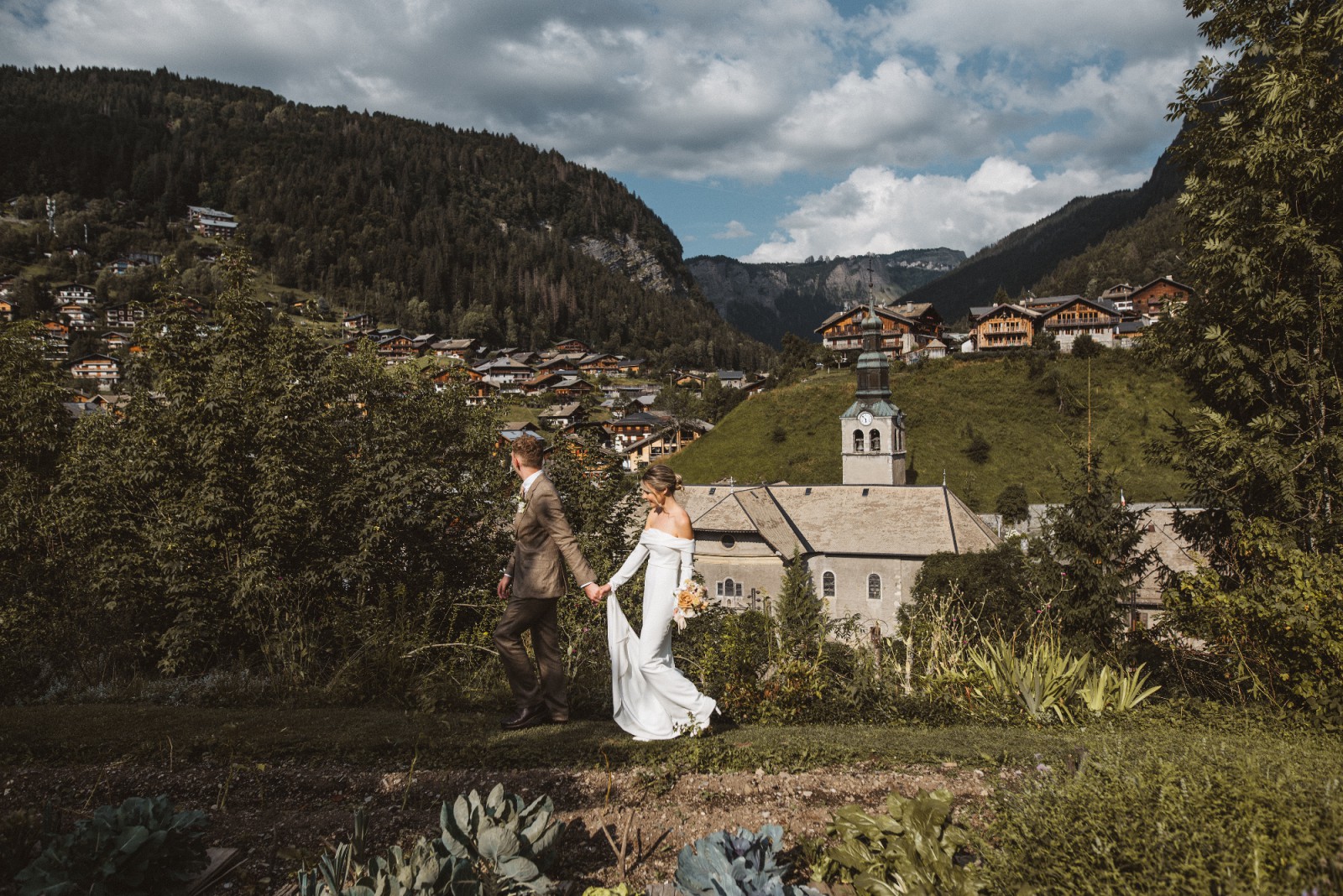 Girl Crush combines the designer’s love of bare shoulders and long sleeves. Together with the sleek stretch crepe and elegant train, the silhouette is strong yet sensual. A row of fabric buttons on each sleeve and a back tie add sophisticated detailing. Style yours with a wavy bob for a fresh non-bridal look.